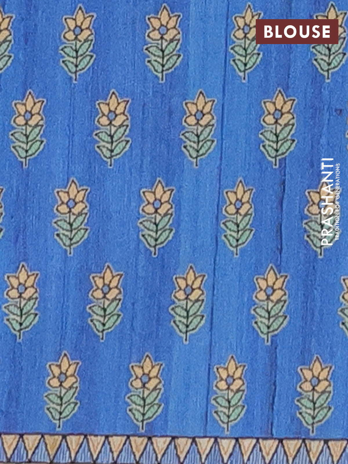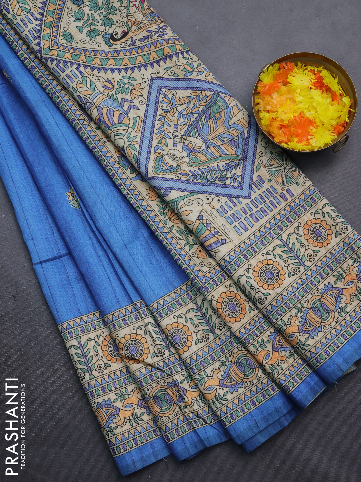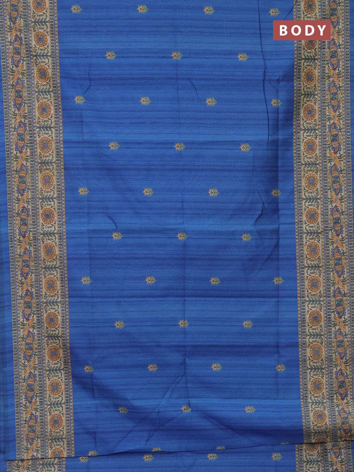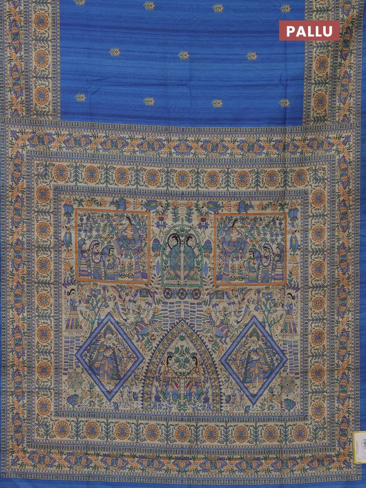 Semi tussar saree blue and beige with butta prints and madhubani printed pallu