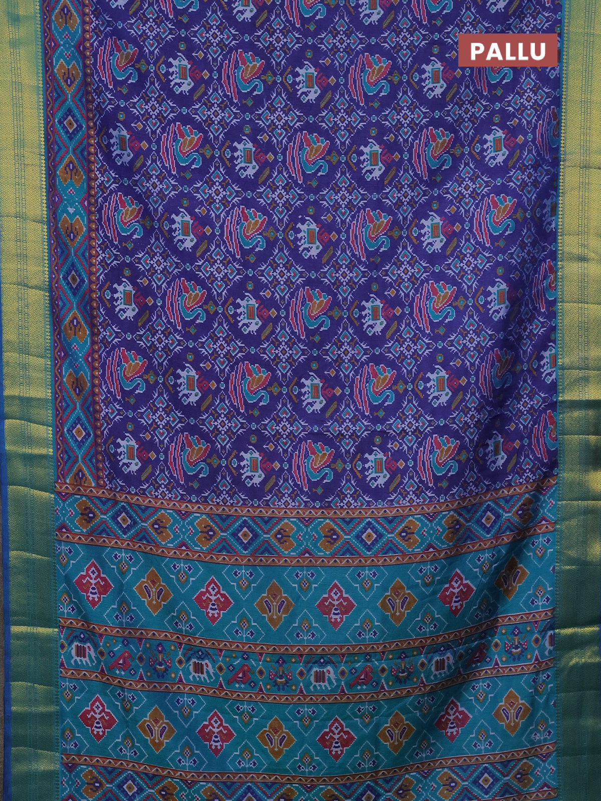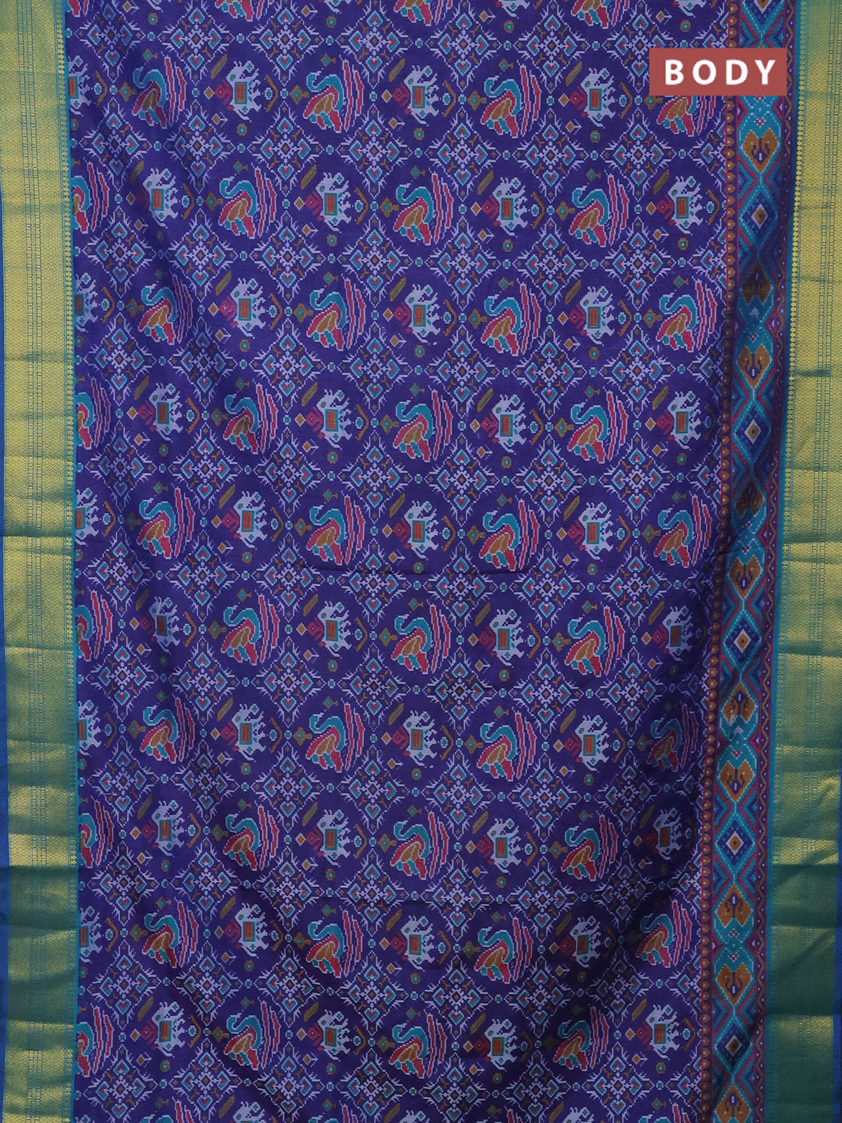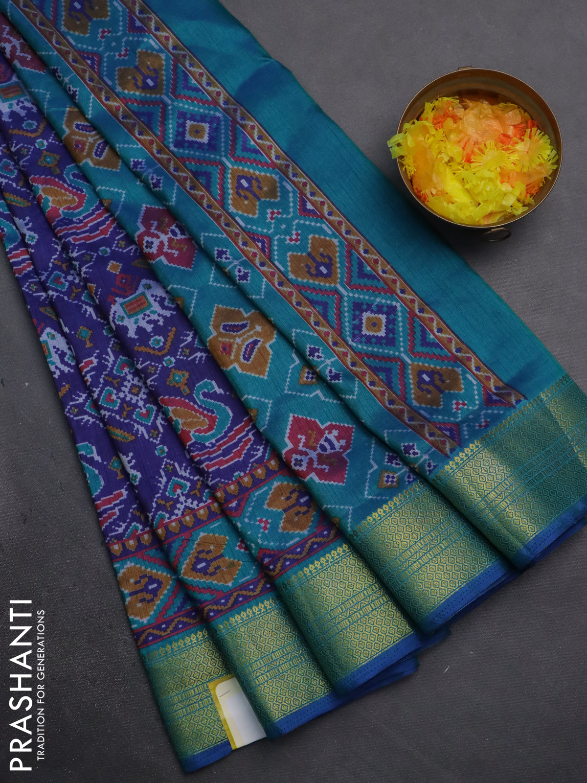 Semi tussar saree blue and teal green with allover ikat prints and zari woven border