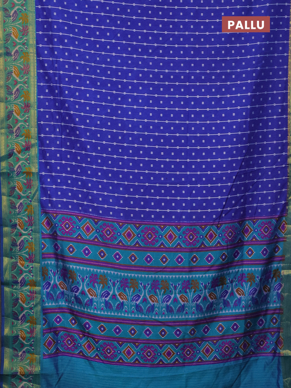Semi tussar saree blue and teal green with allover ikat prints and zari woven ikat border