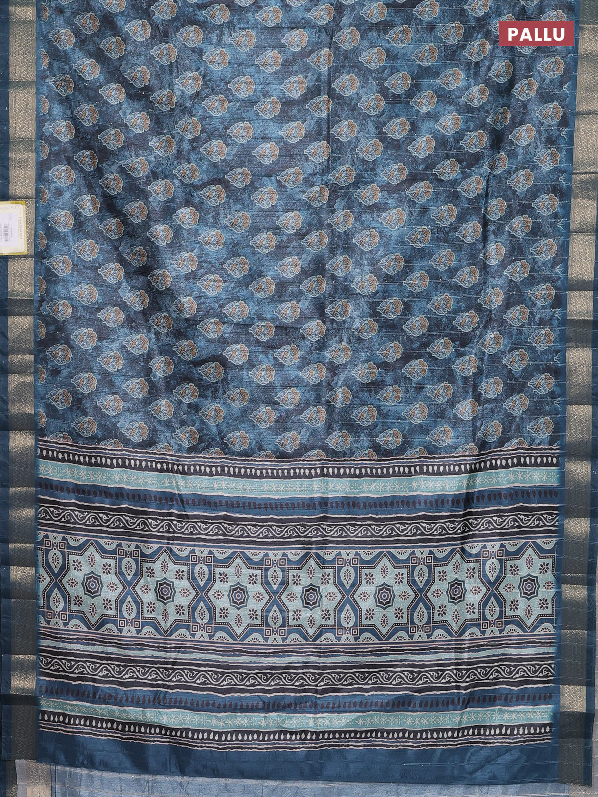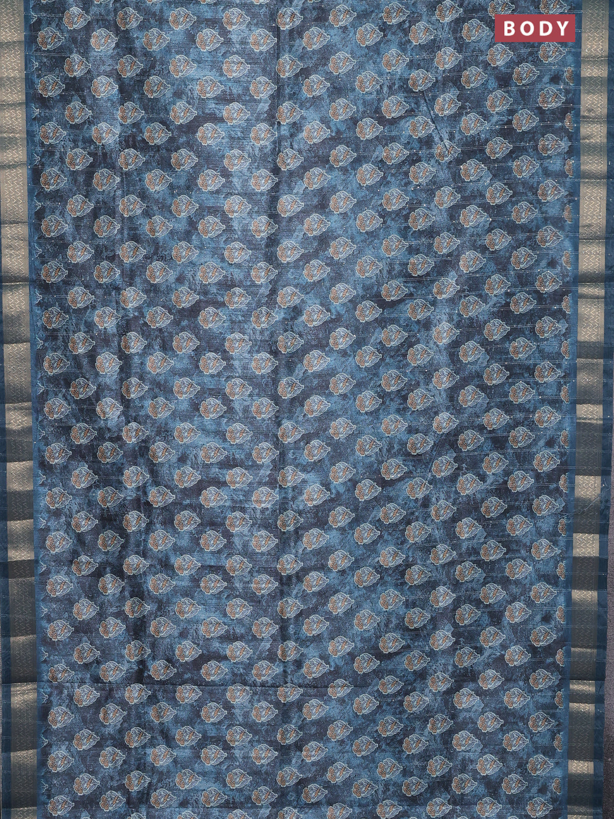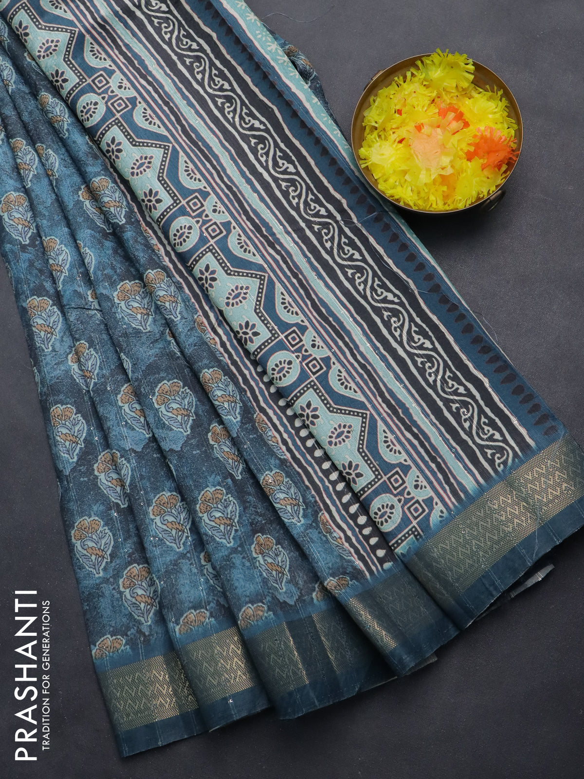 Semi tussar saree blue shade with floral butta prints & sequin work and zari woven border