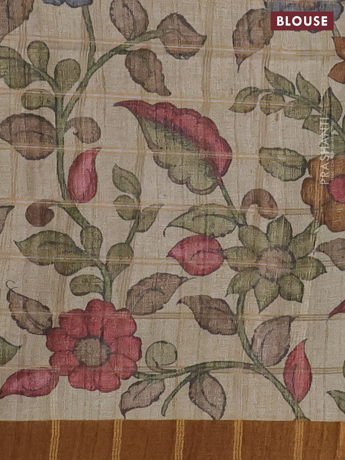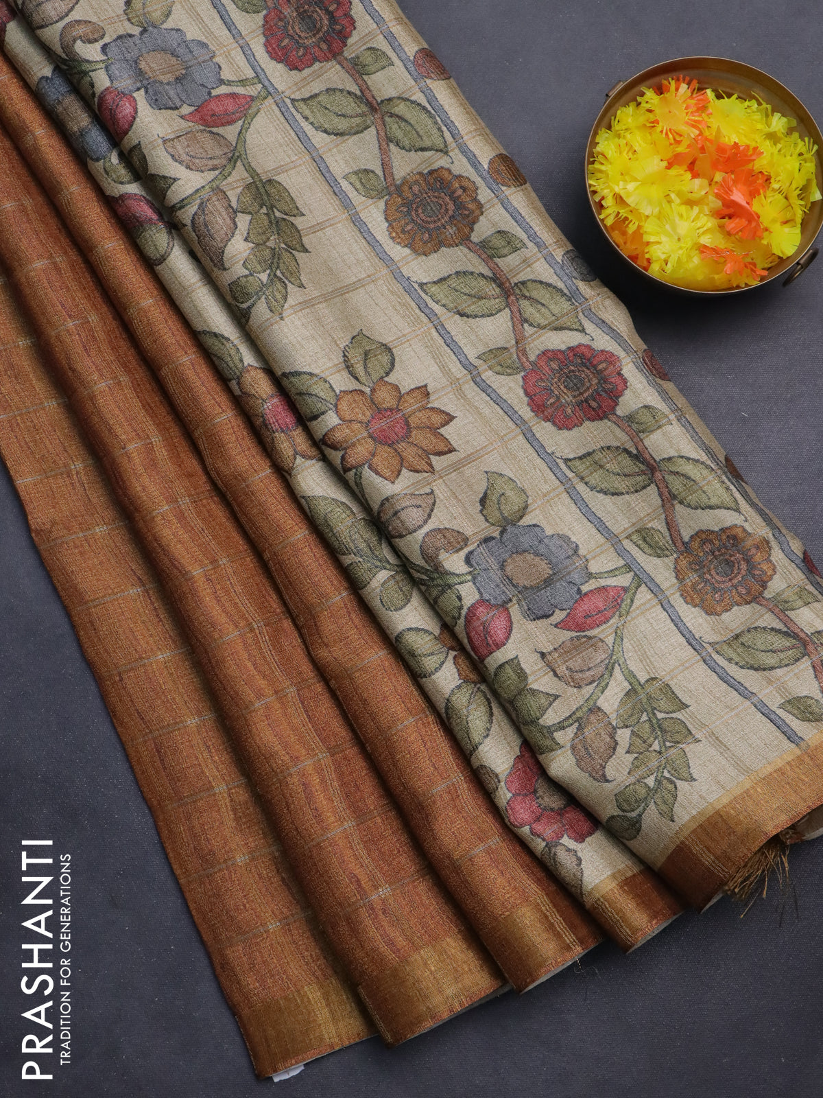 Semi tussar saree brown and beige with allover zari checked pattern and kalamkari printed pallu