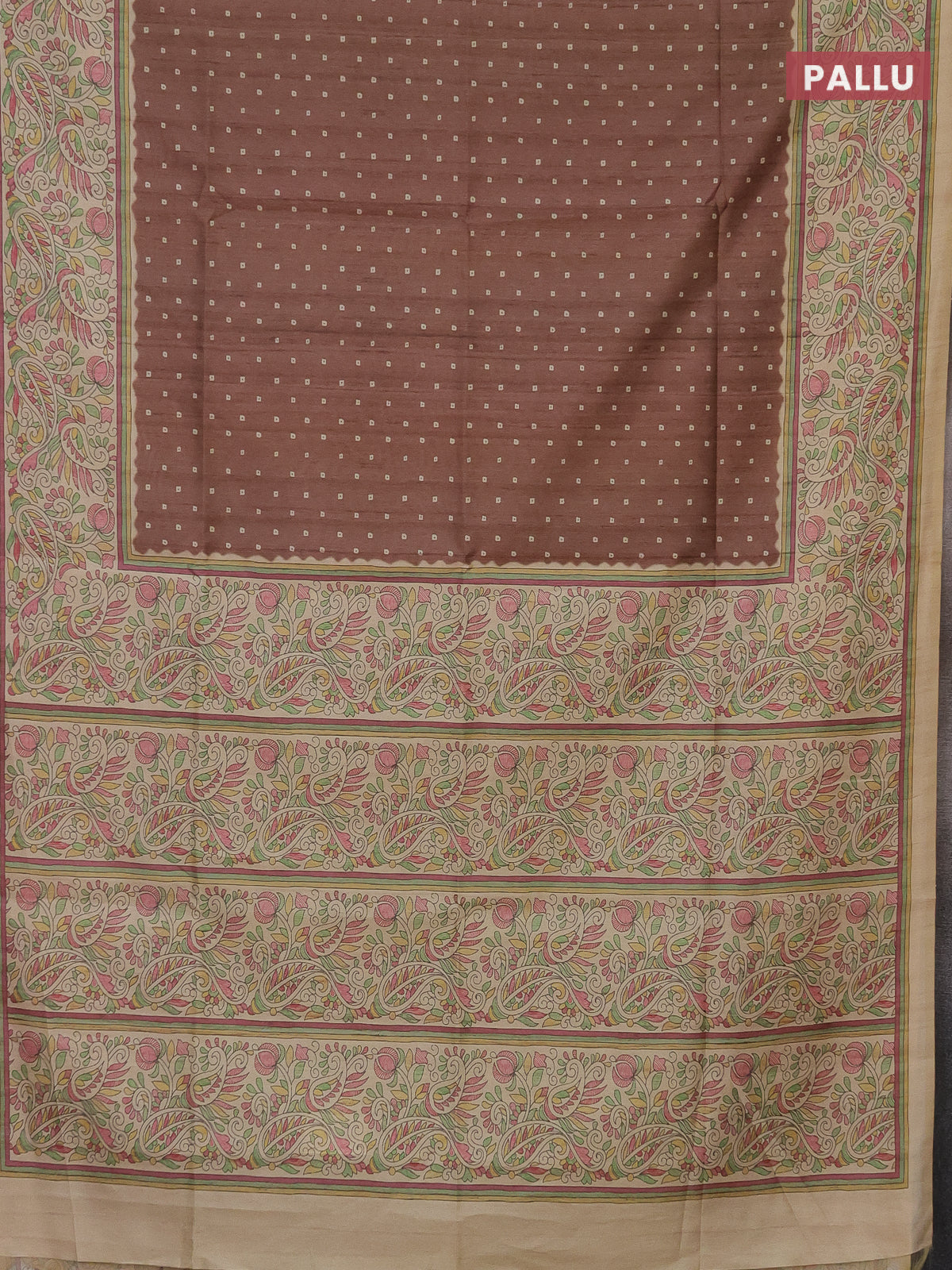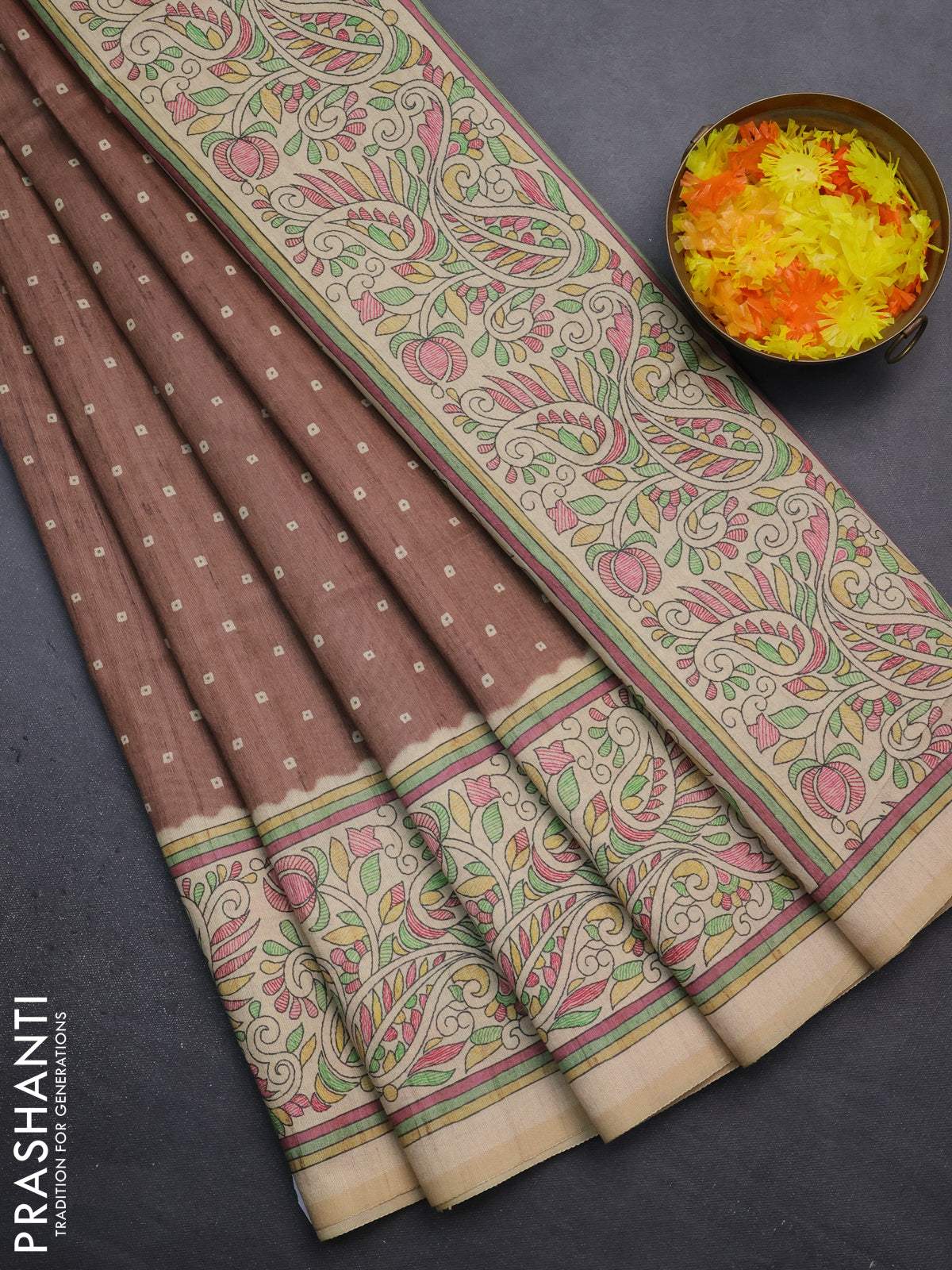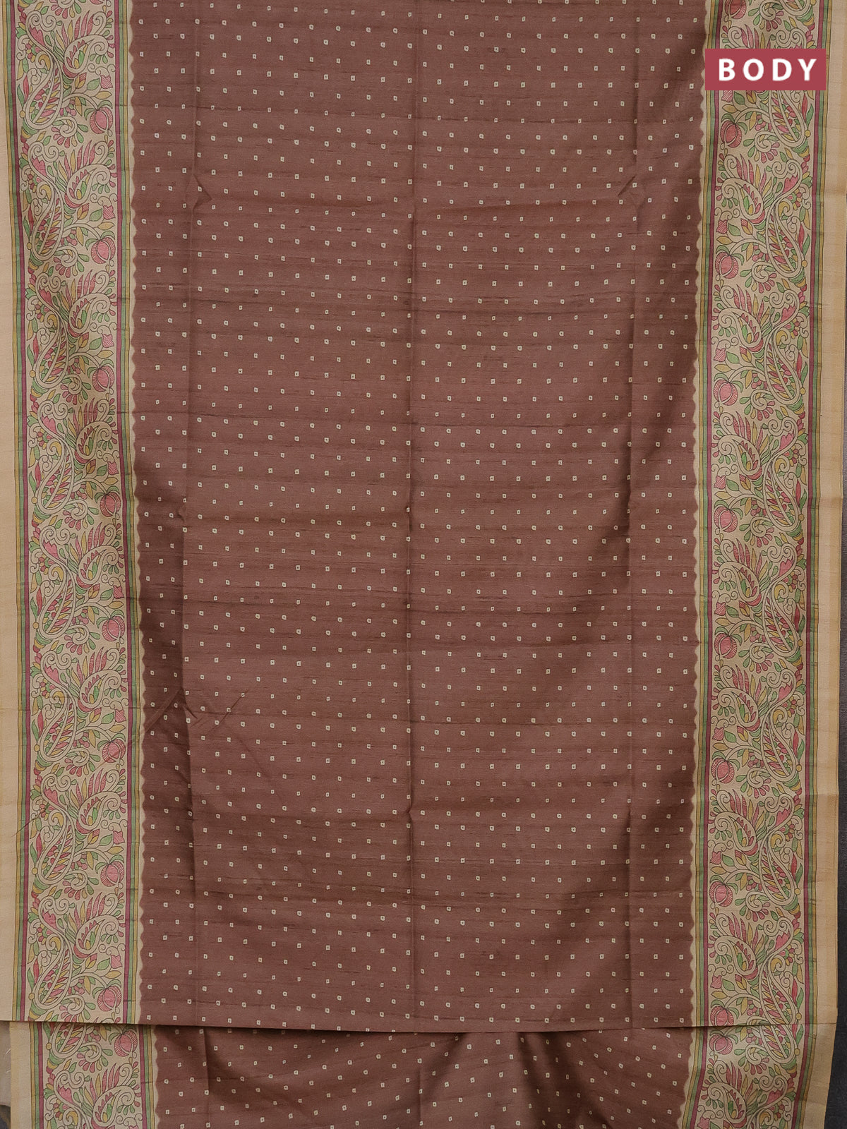 Semi tussar saree brown and sandal with bandhini butta prints and printed border