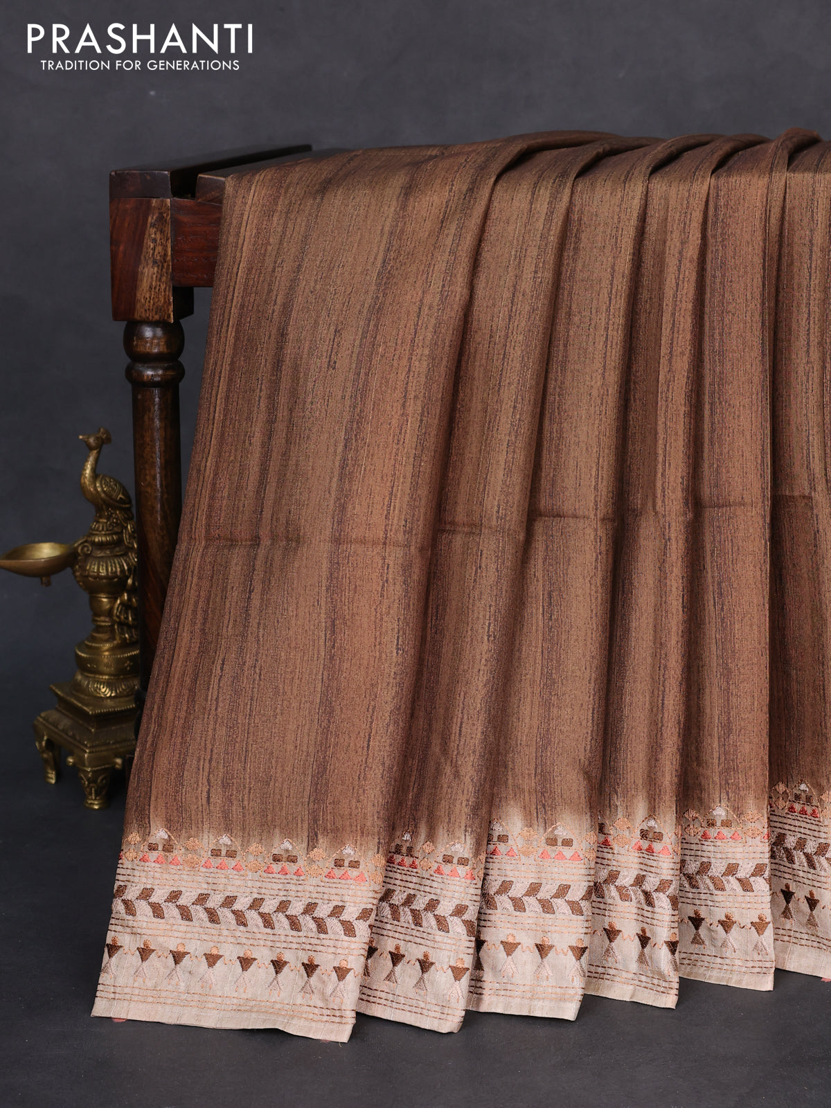 Semi tussar saree brown shade and beige with plain body and embroidery pallu & border