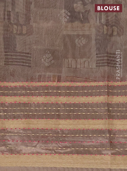 Semi tussar saree brown shade with allover prints and kantha stitich work border