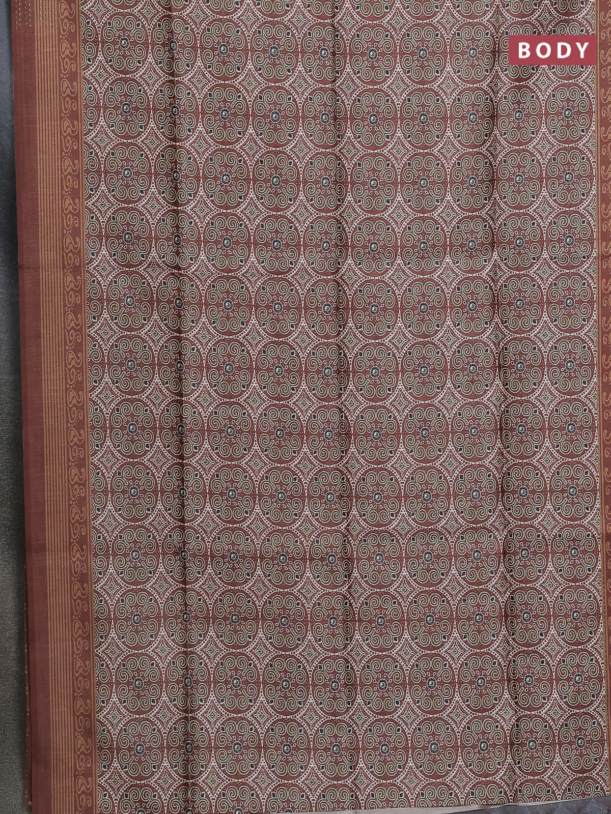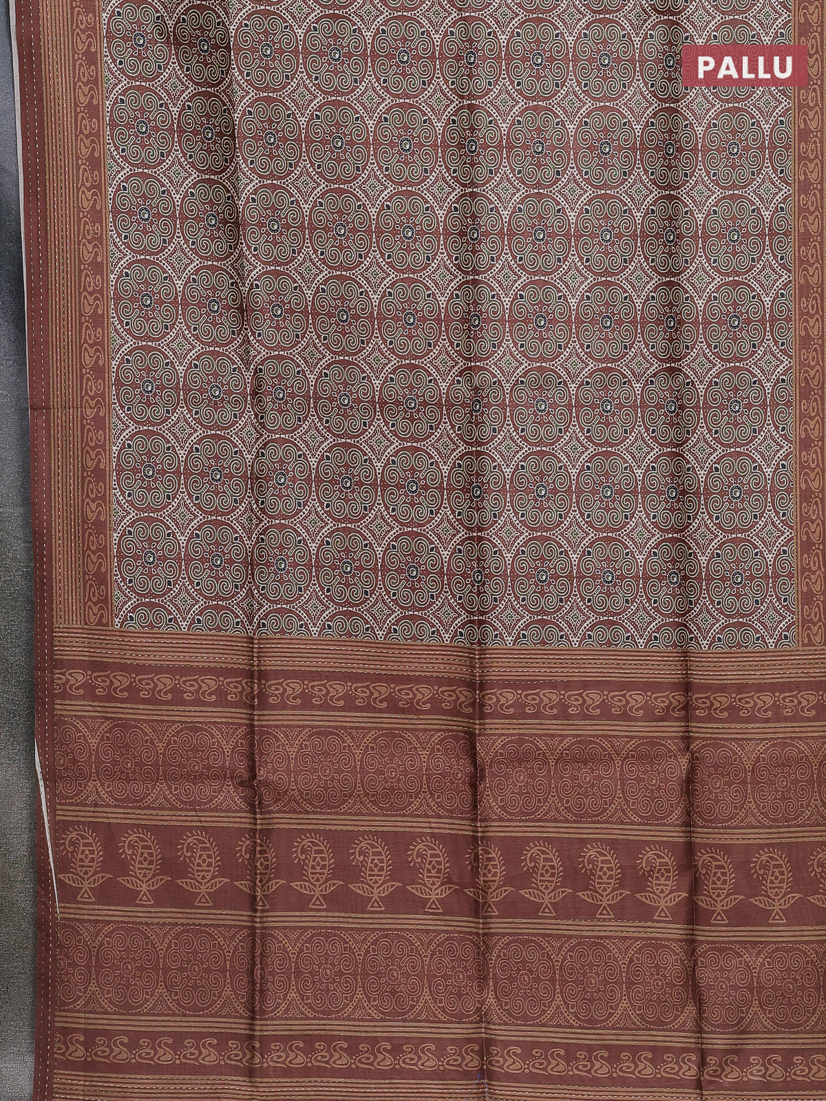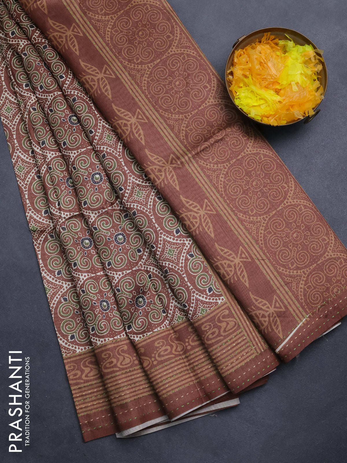 Semi tussar saree brown with allover ajrakh prints and katha stitch work pallu & border