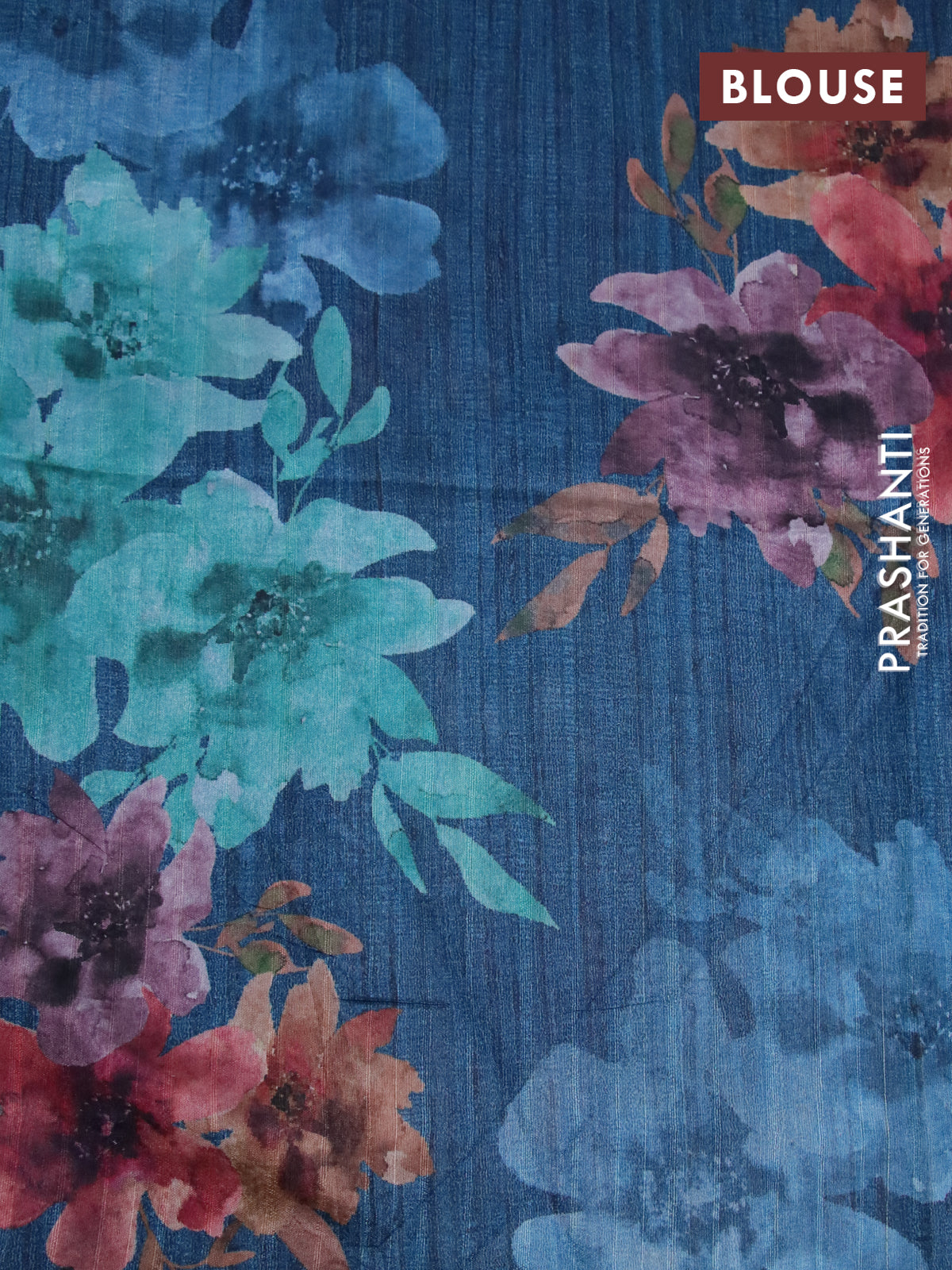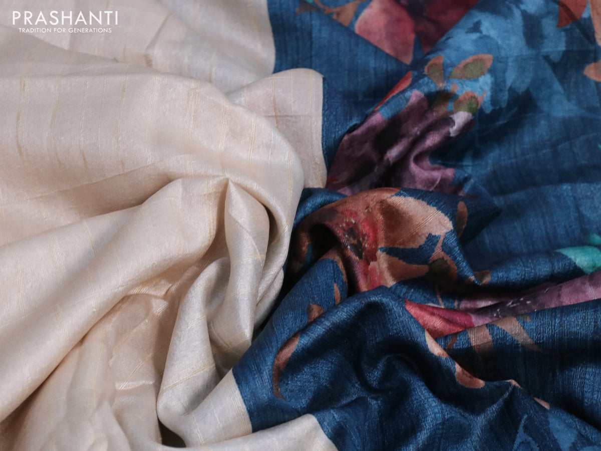 Semi tussar saree cream and peacock blue with plain body and floral digital printed border