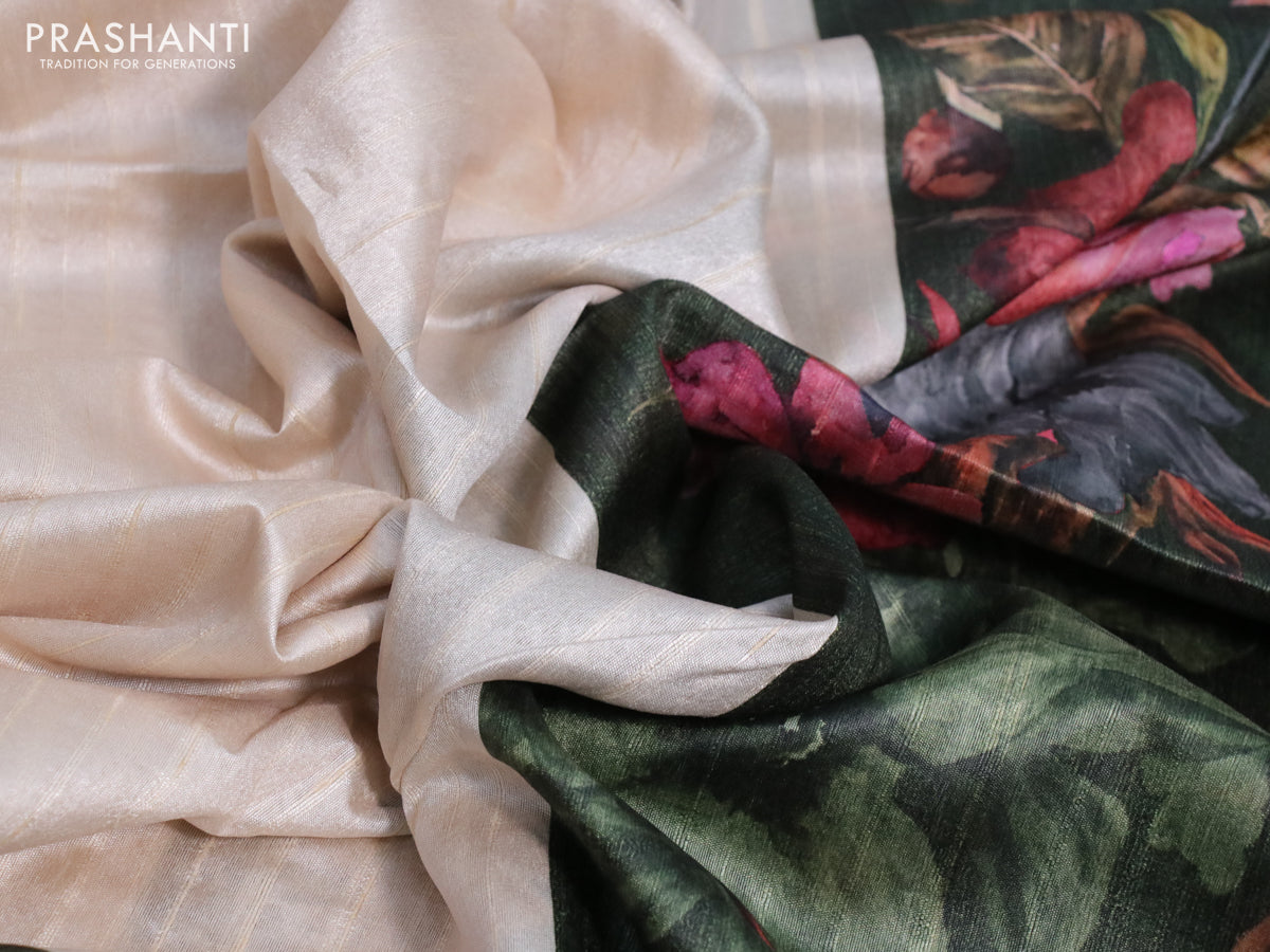 Semi tussar saree cream and sap green with plain body and floral digital printed border