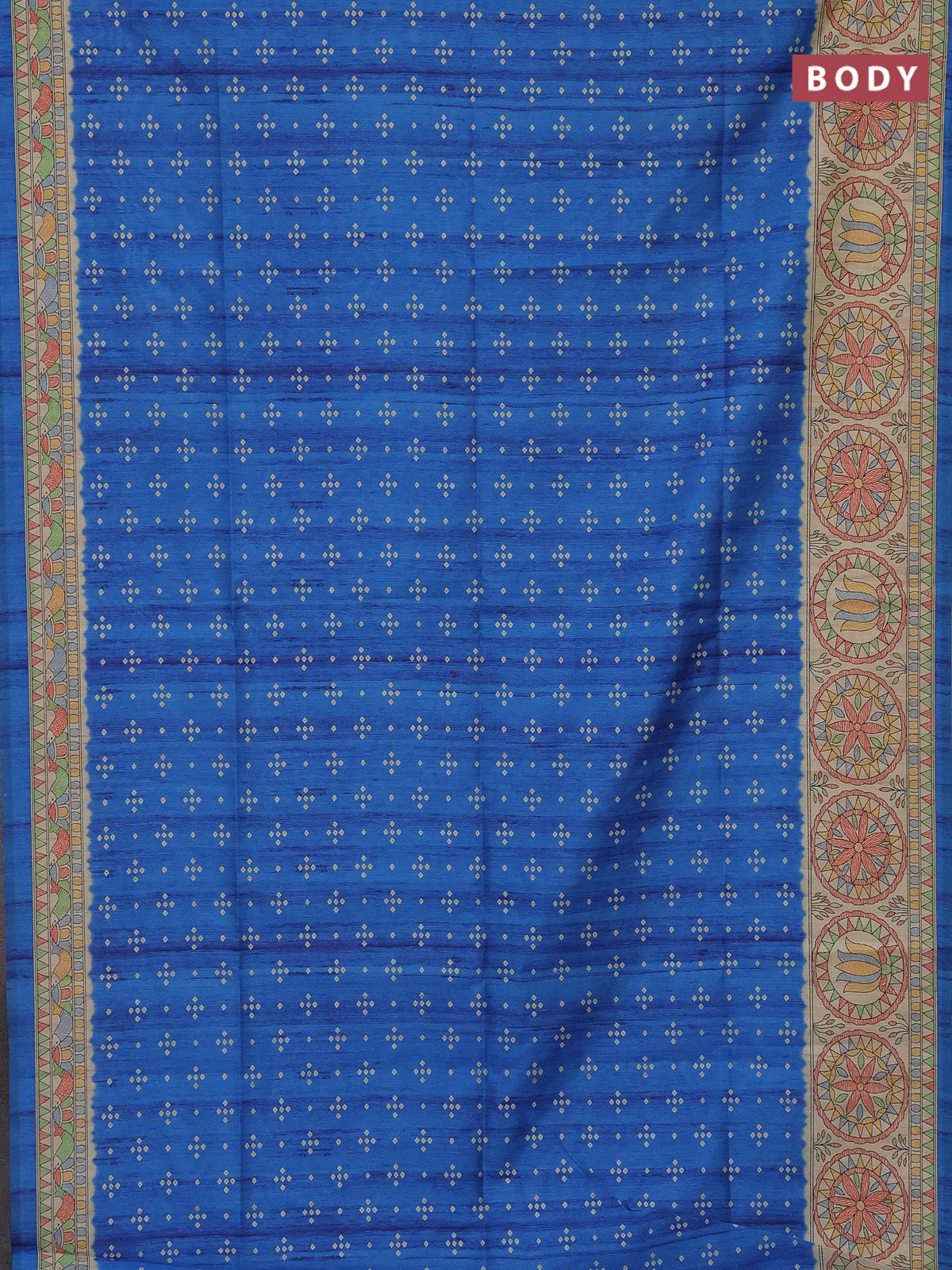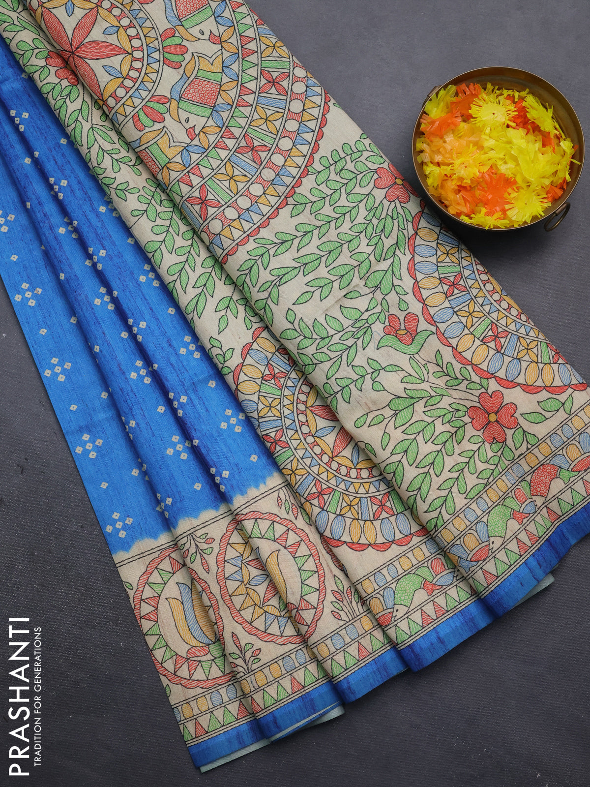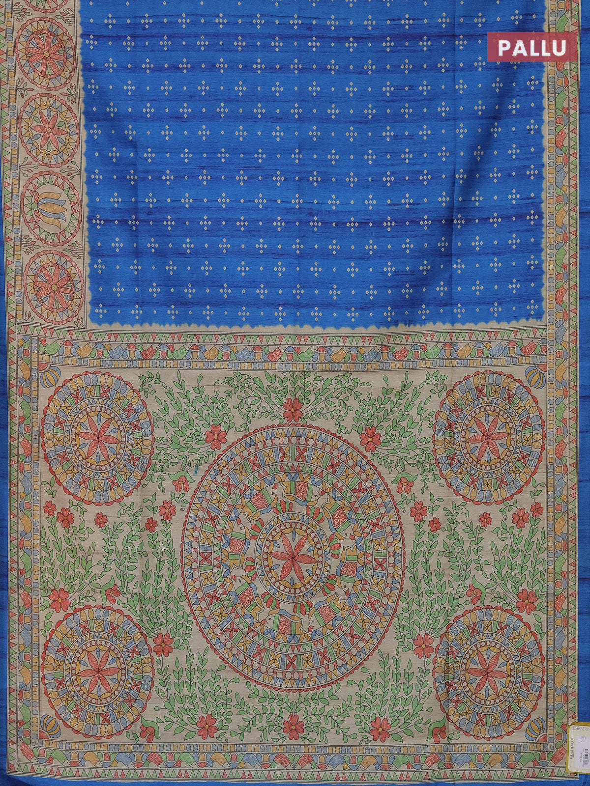 Semi tussar saree cs blue and beige with bandhini butta prints and mandhubani printed pallu