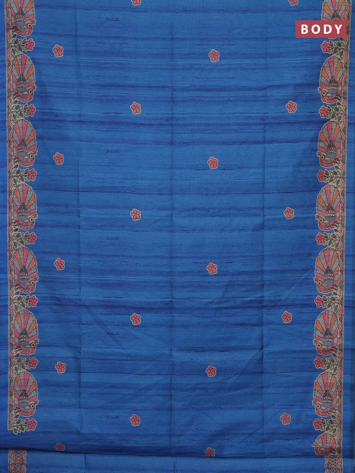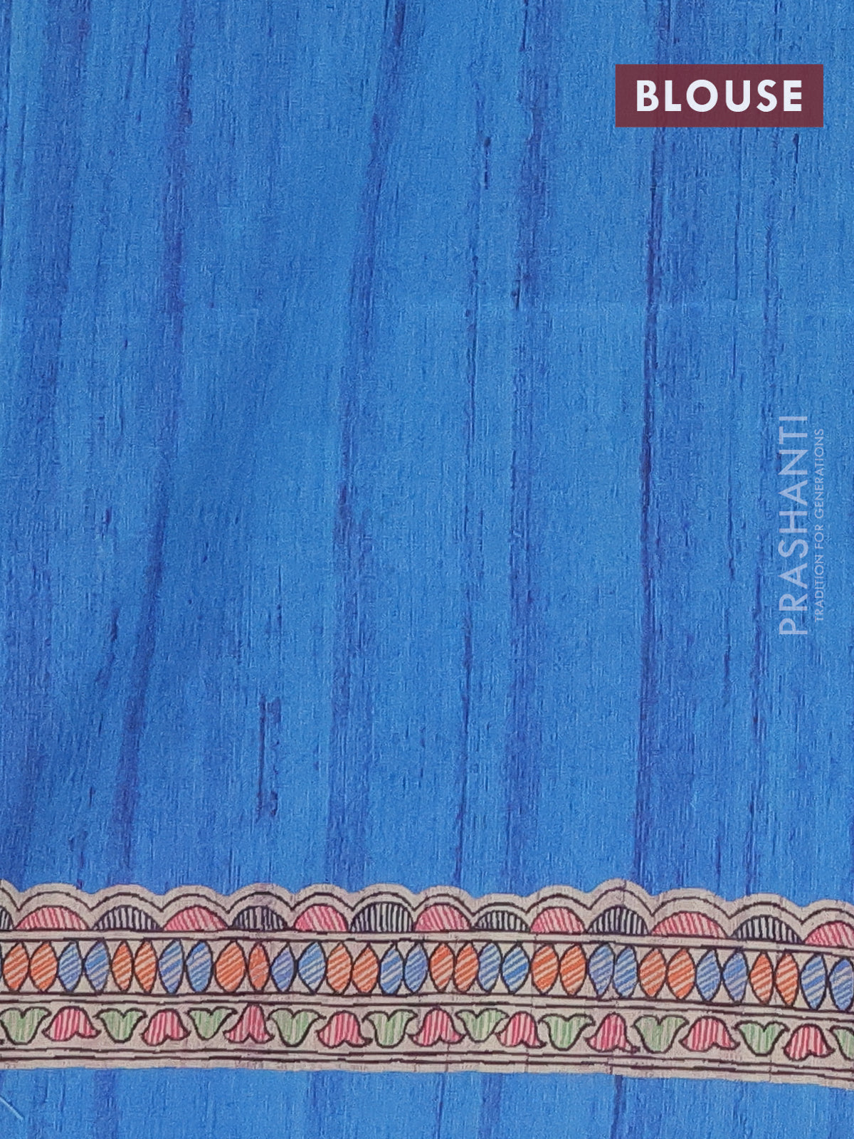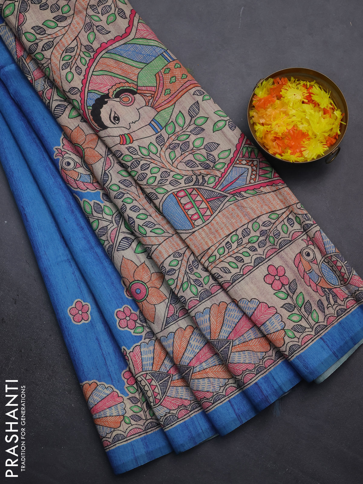 Semi tussar saree cs blue and beige with butta prints and madhubani printed pallu