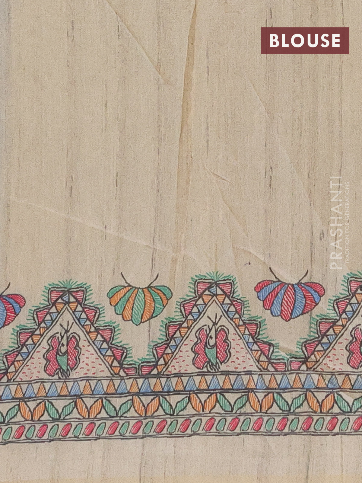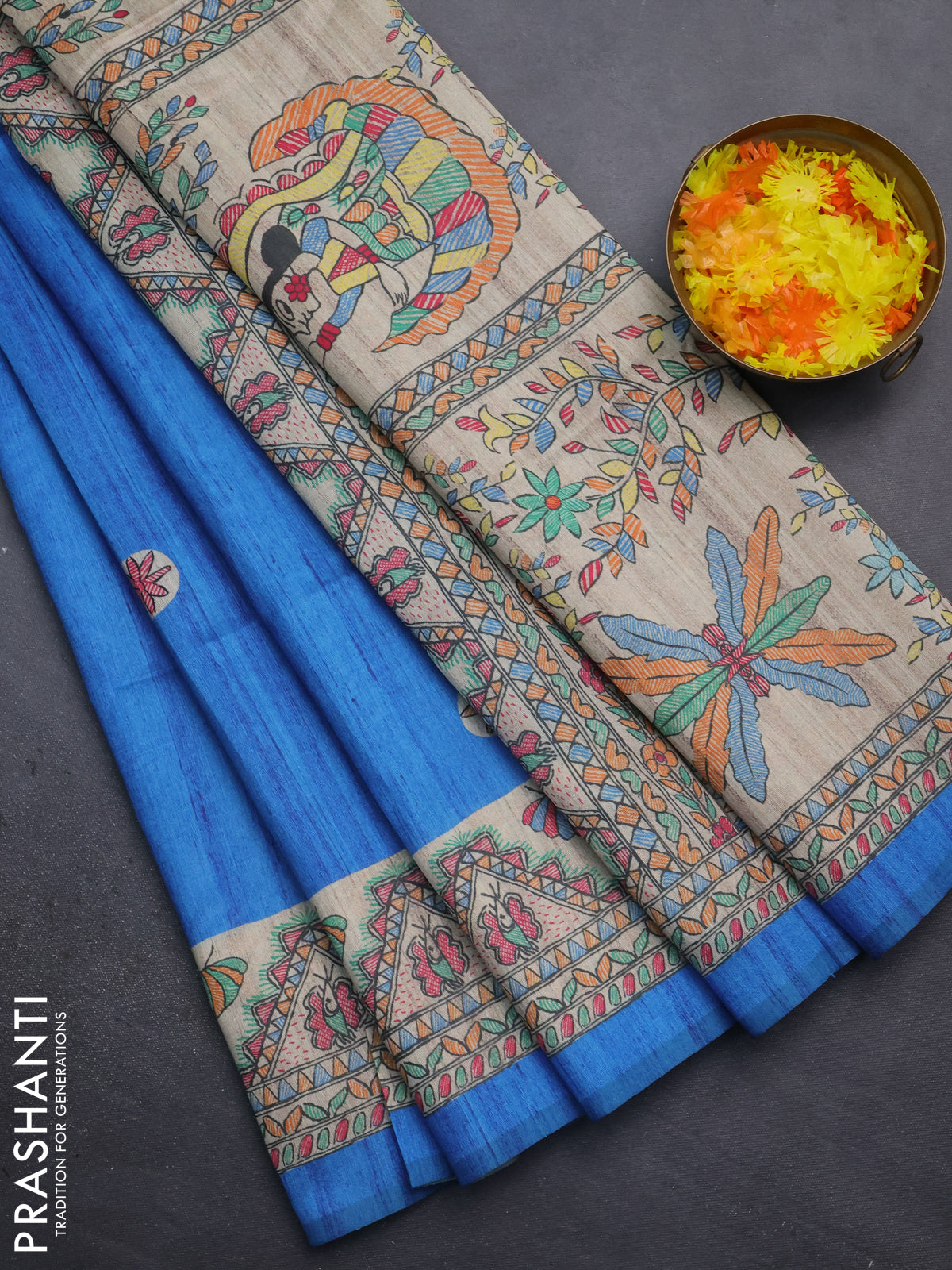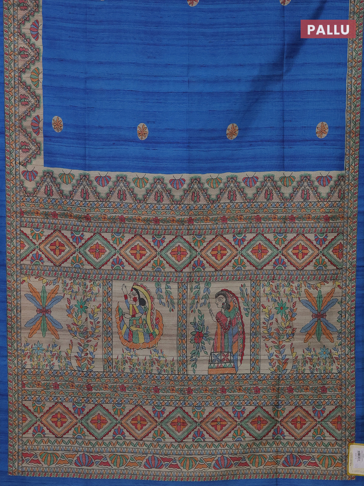 Semi tussar saree cs blue and beige with butta prints and madhubani printed pallu