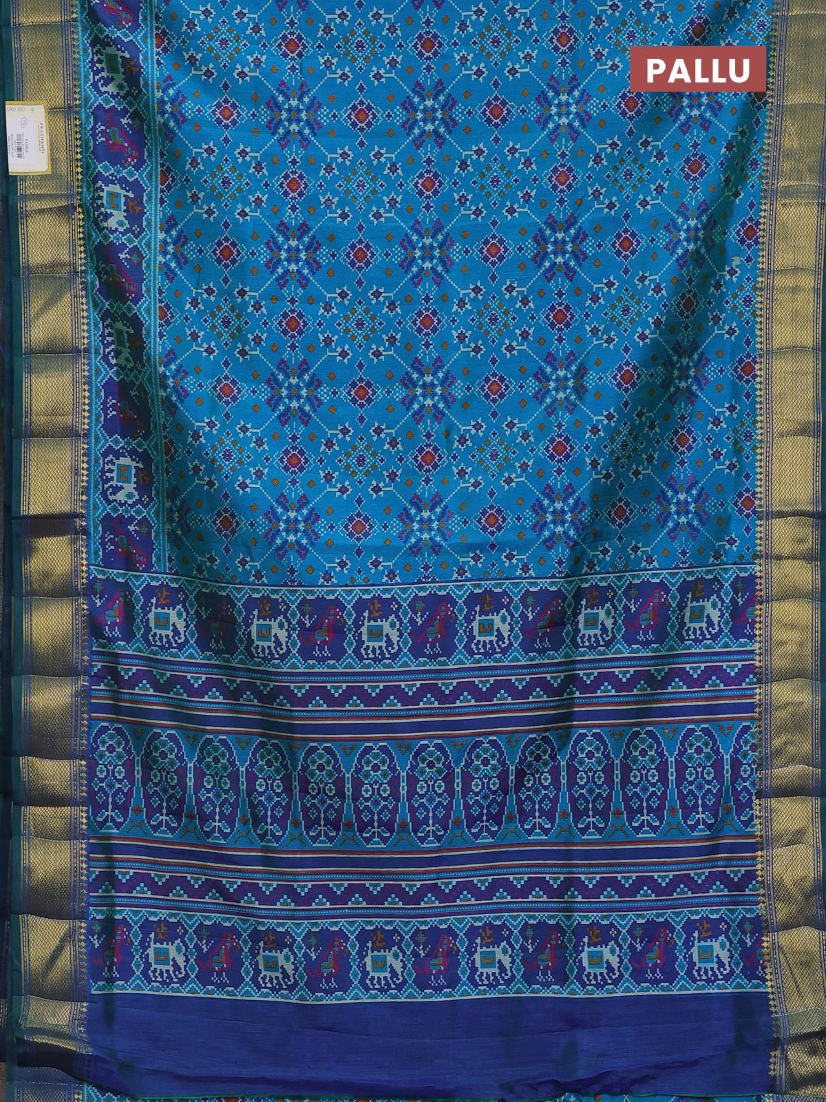 Semi tussar saree cs blue and green with allover ikat prints and zari woven border