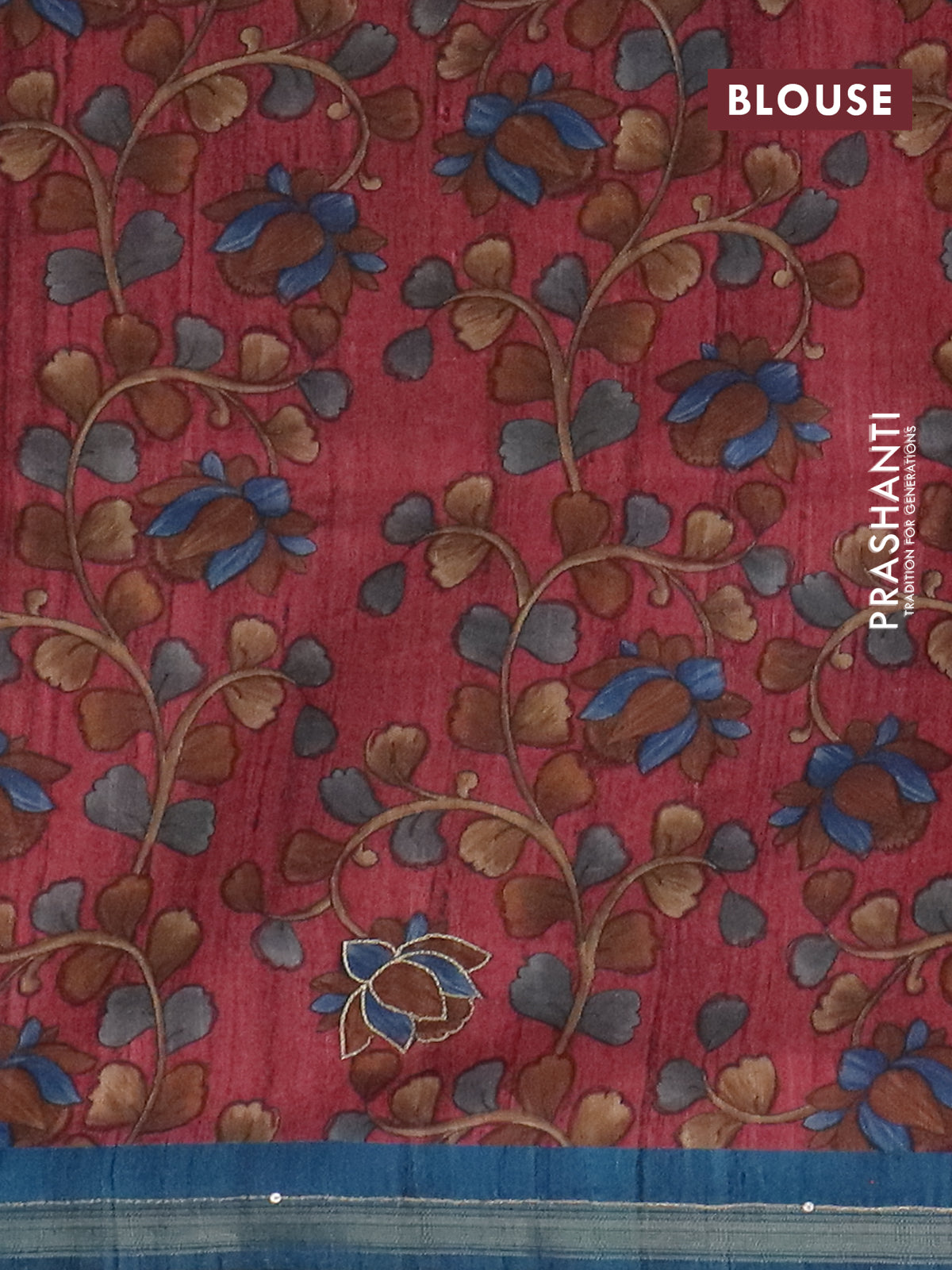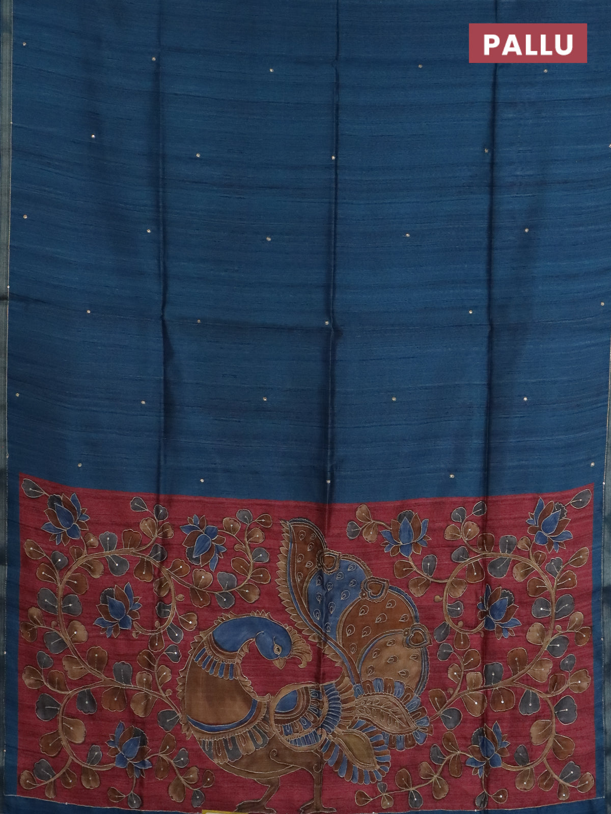 Semi tussar saree cs blue and maroon with embroidery buttas and kalamkari prints & pita work pallu
