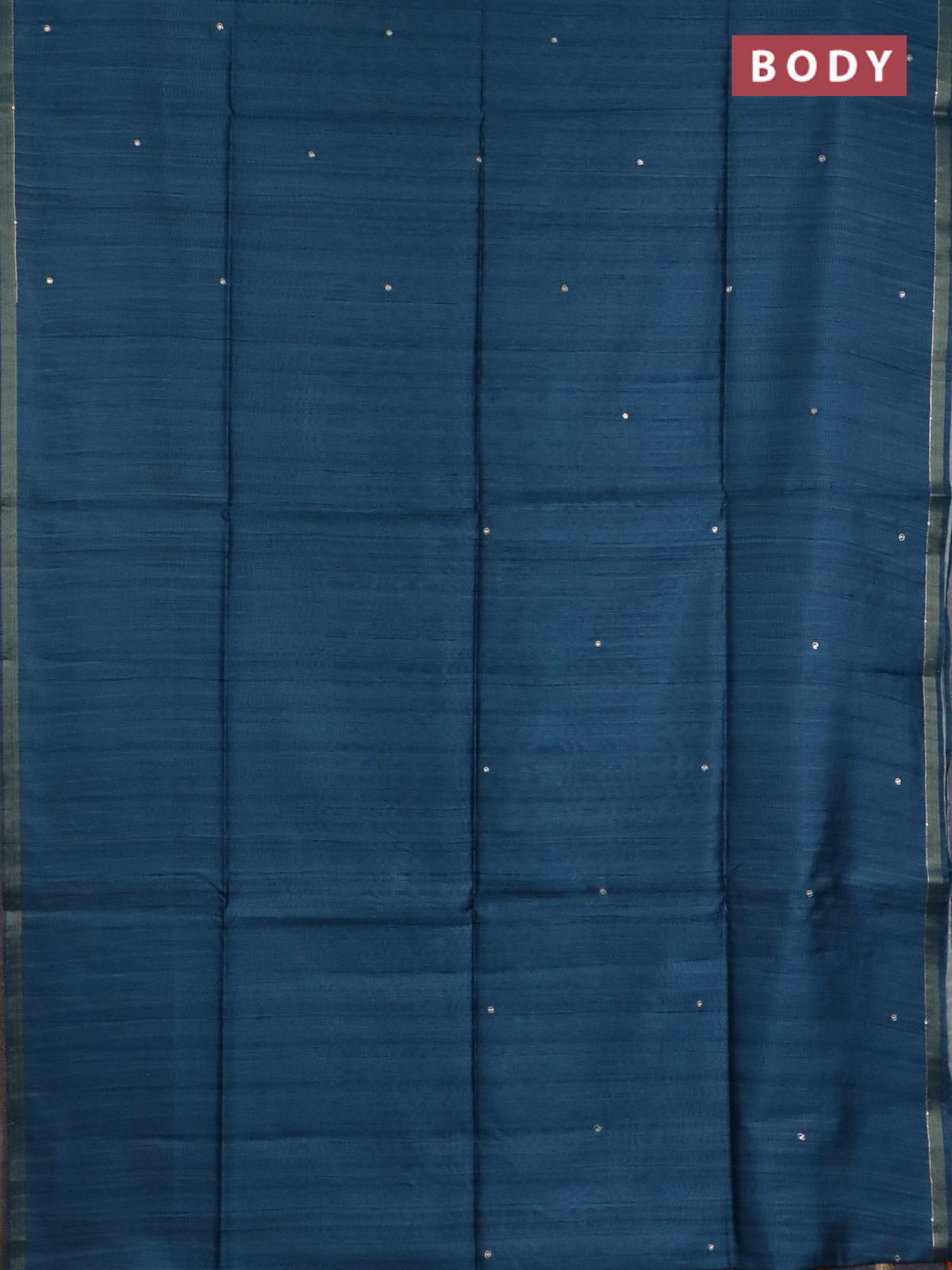 Semi tussar saree cs blue and maroon with embroidery buttas and kalamkari prints & pita work pallu