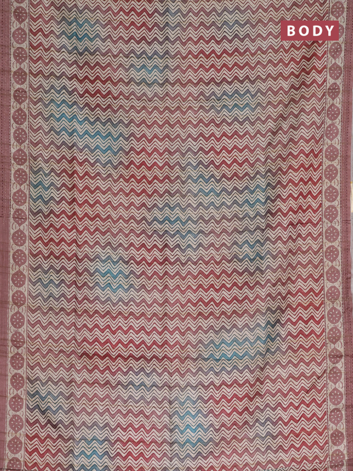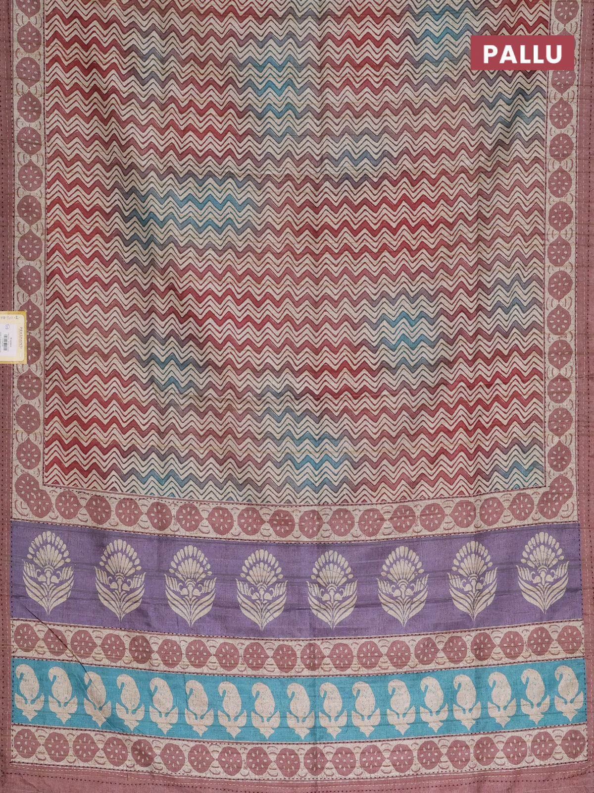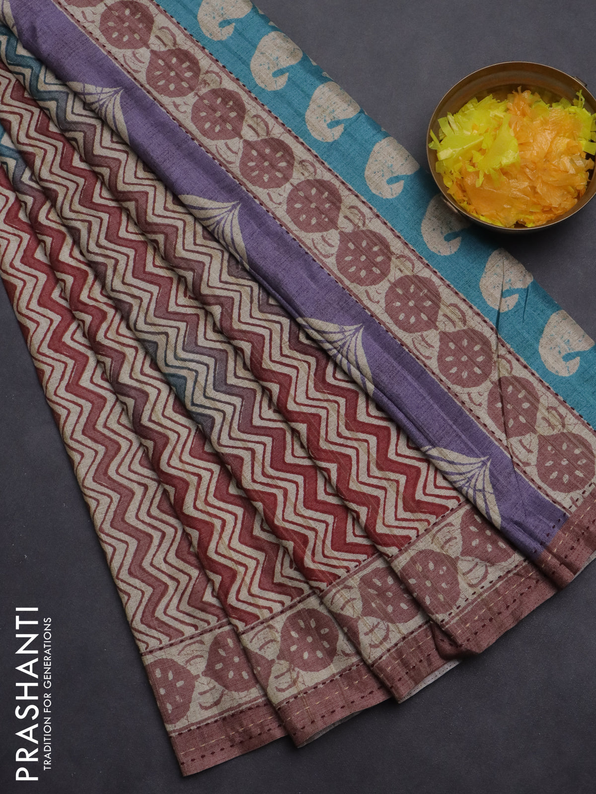 Semi tussar saree cs blue and pastel maroon shade with allover wevy prints and kantha stitch work border