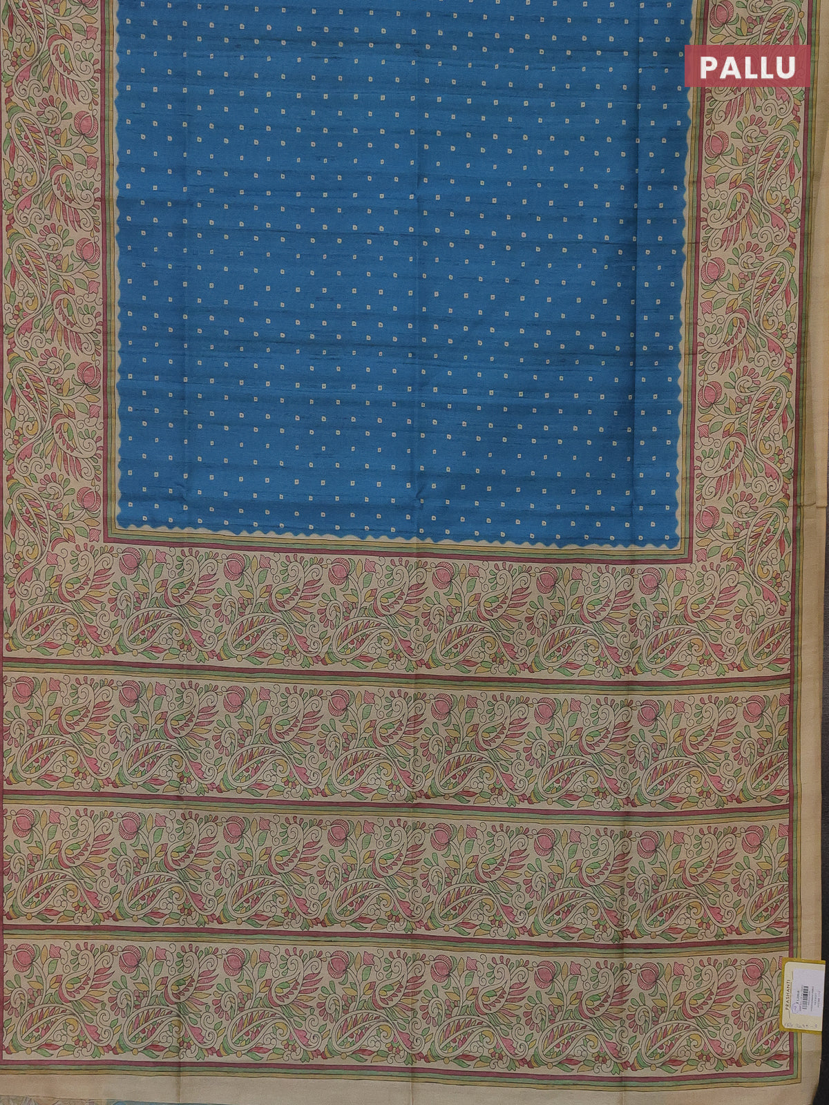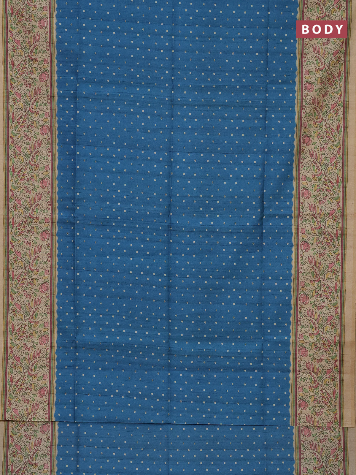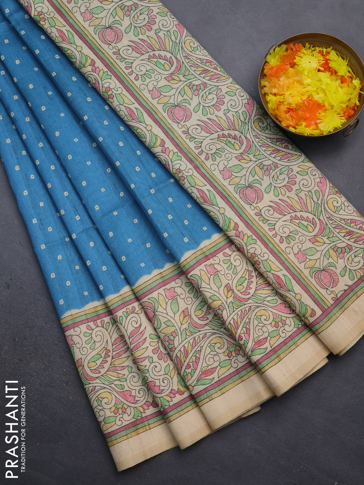 Semi tussar saree cs blue and sandal with bandhini butta prints and printed border