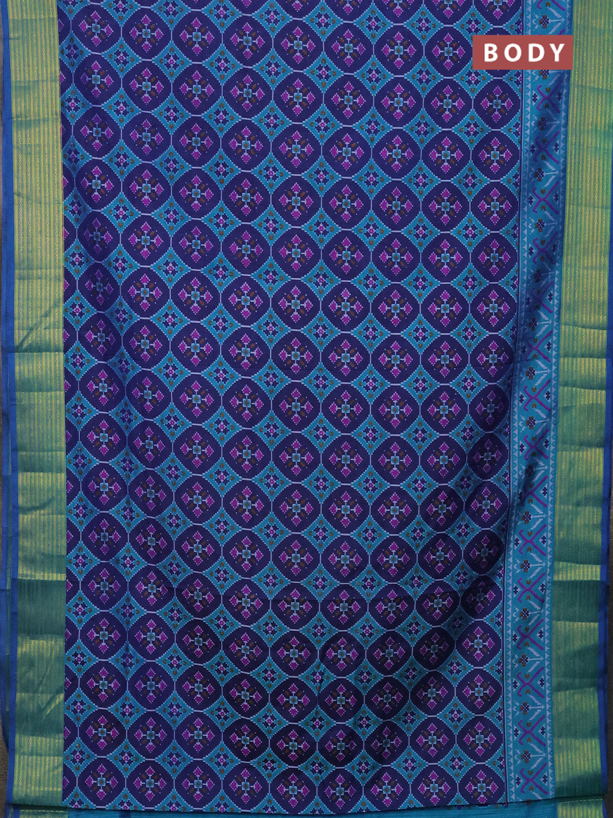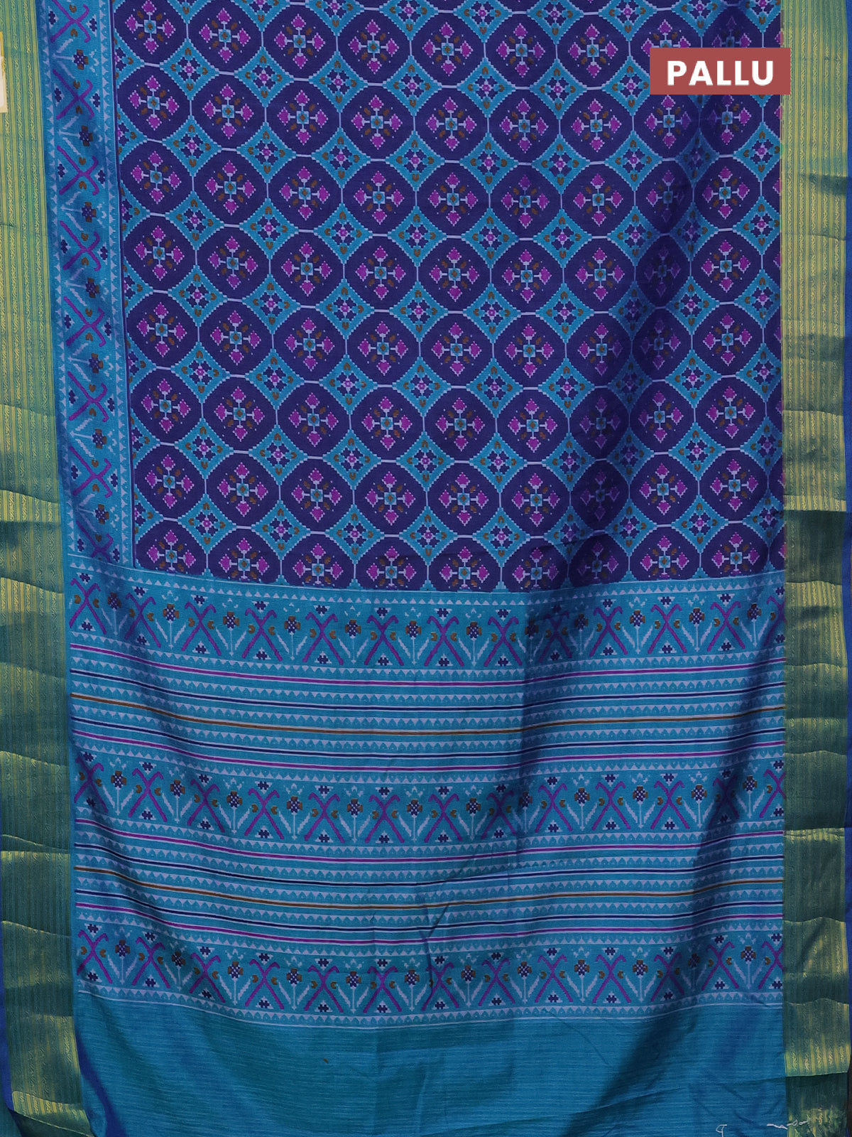 Semi tussar saree dark blue and teal blue with allover ikat prints and zari woven border