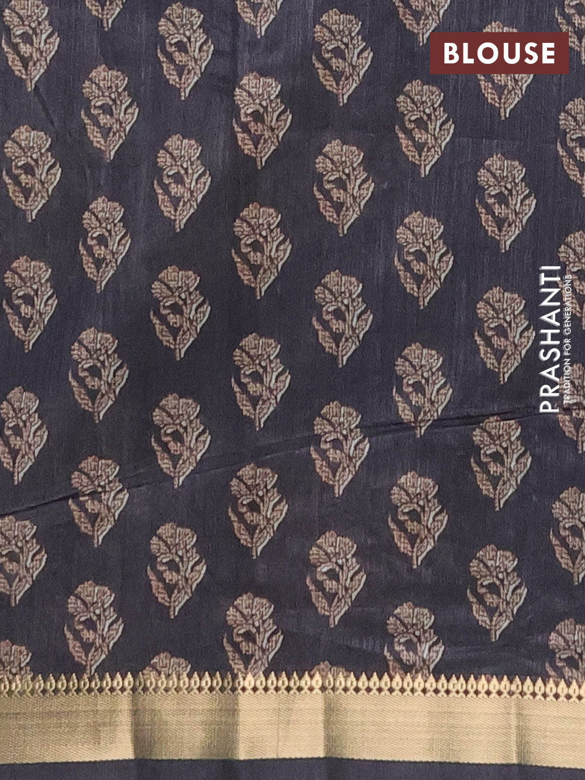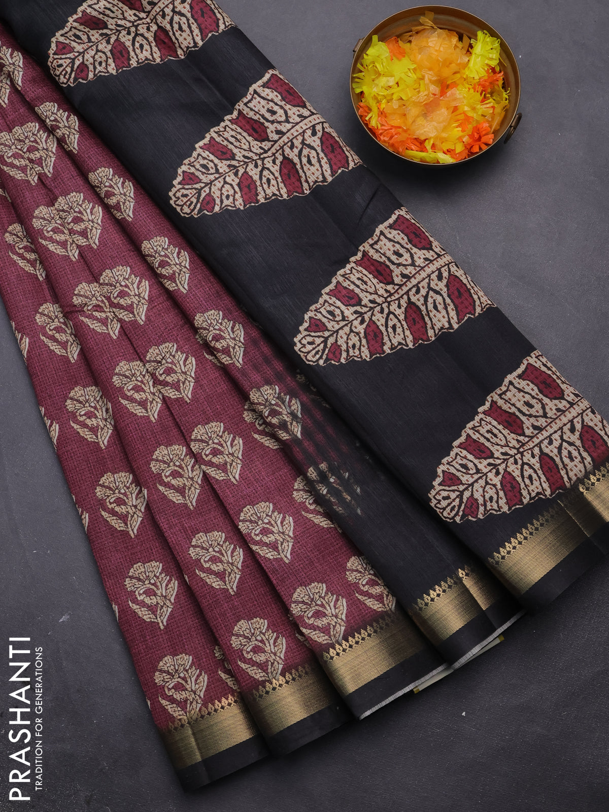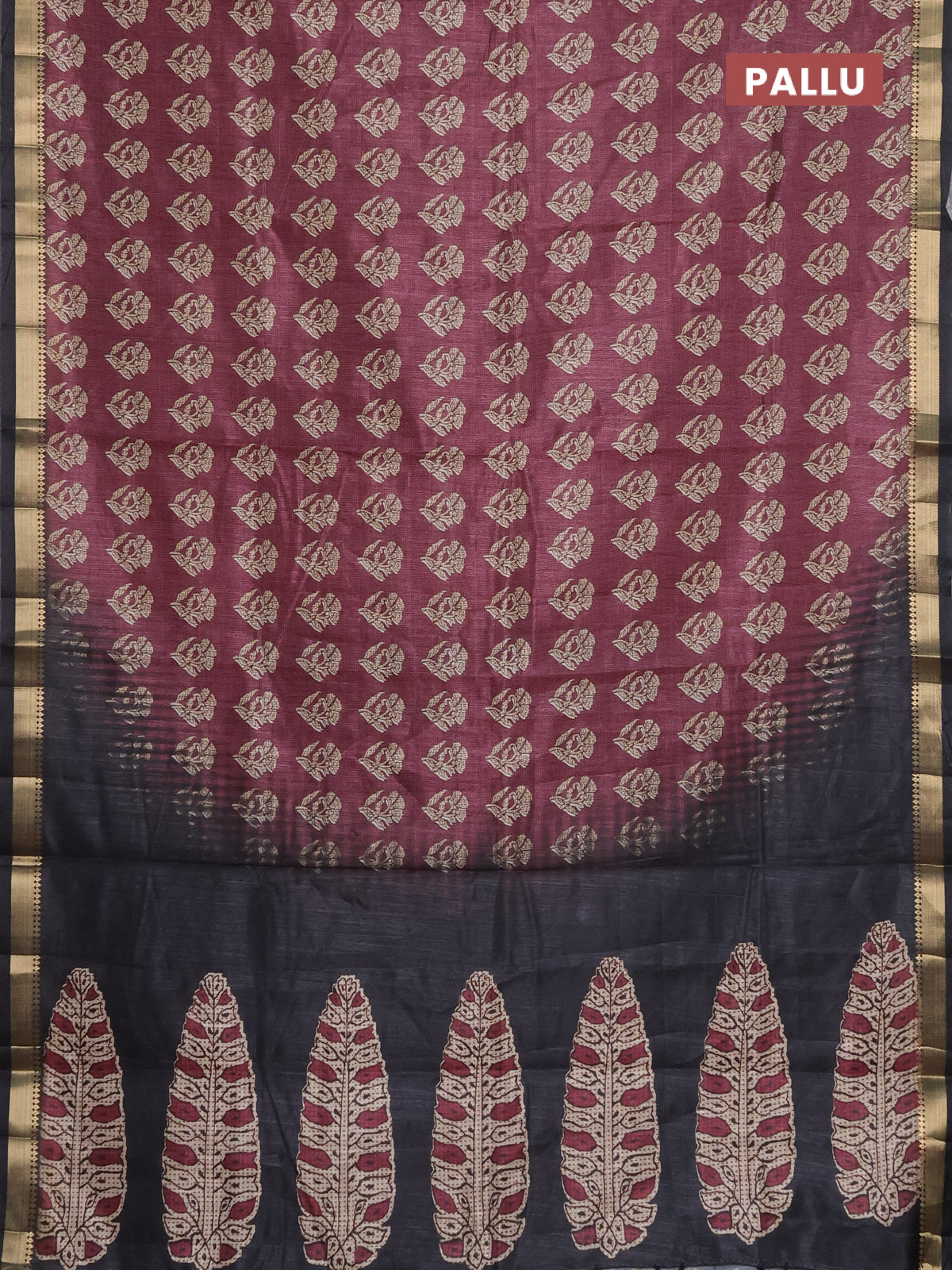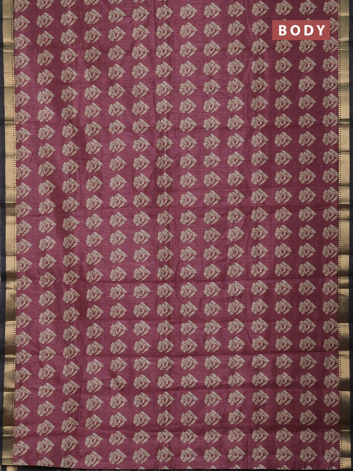Semi tussar saree dark magenta pink and black with butta prints and zari woven border