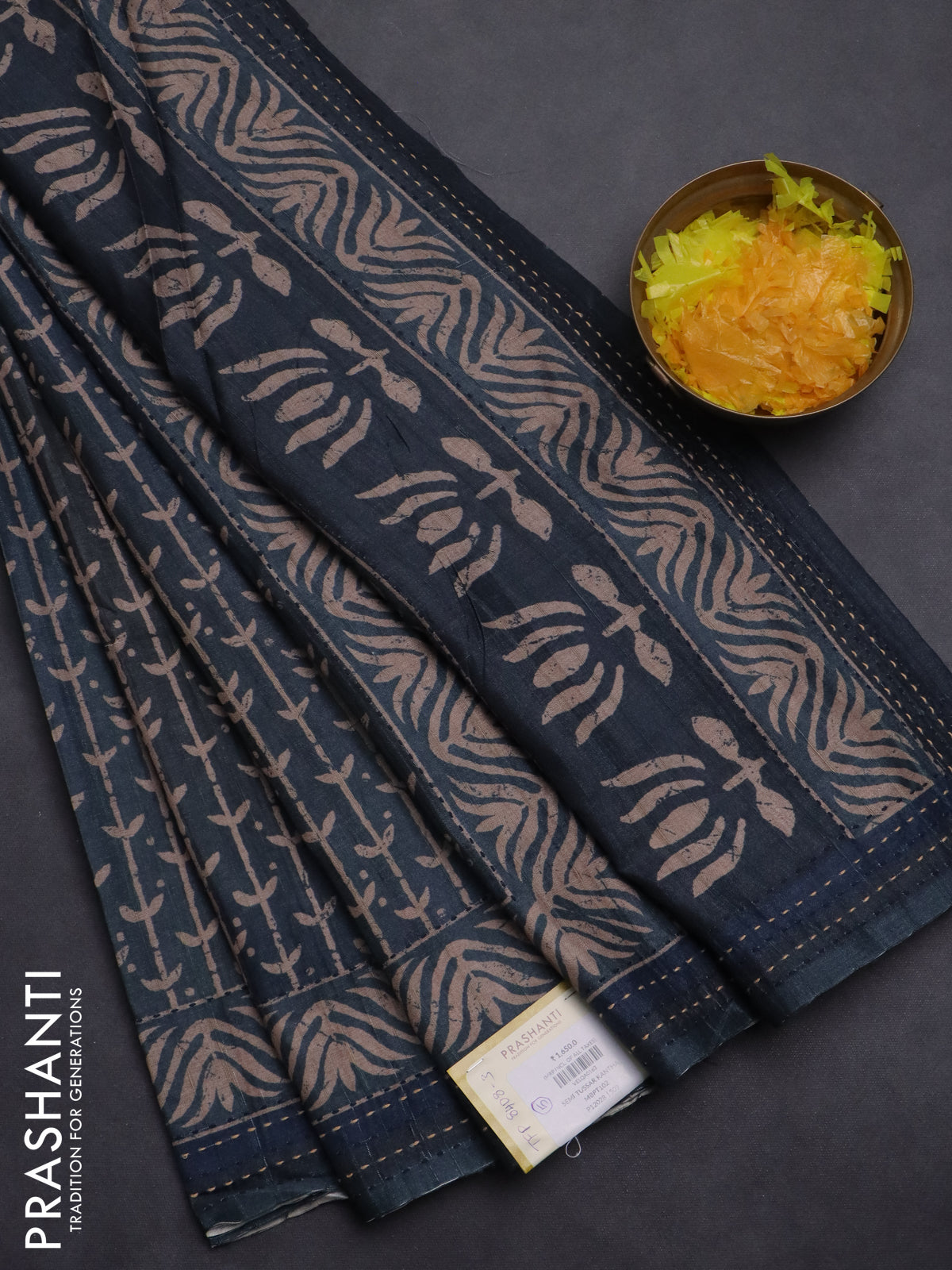Semi tussar saree dark peacock blue with allover prints and kantha stitch work border