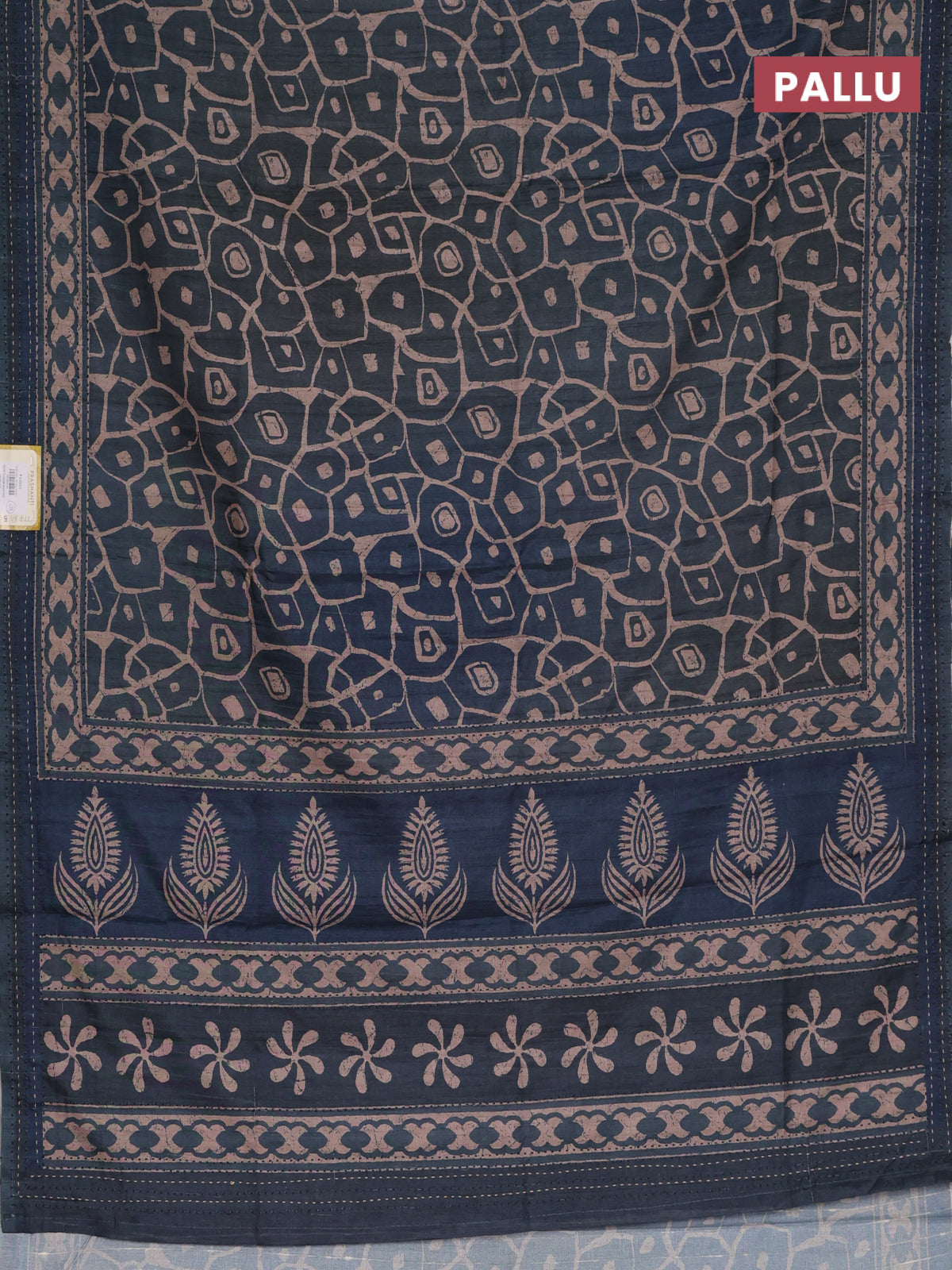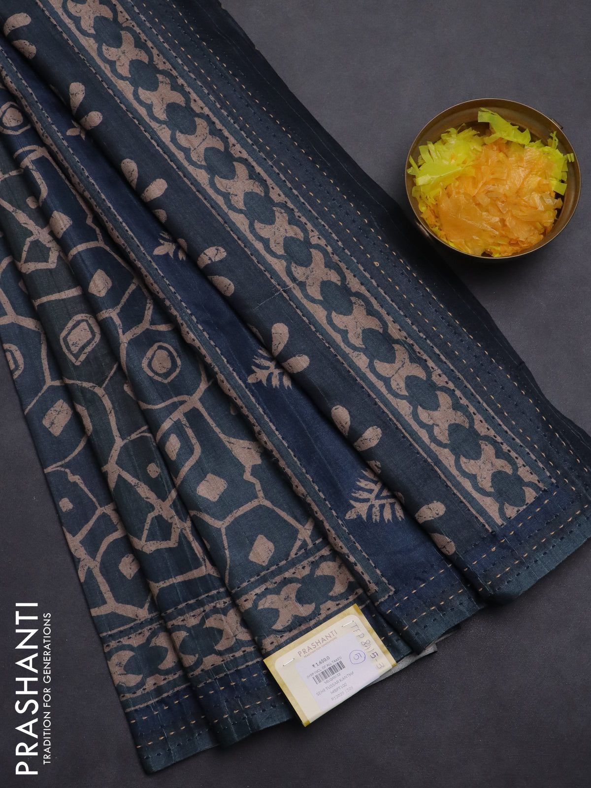 Semi tussar saree dark peacock green with allover prints and kantha stitch work border