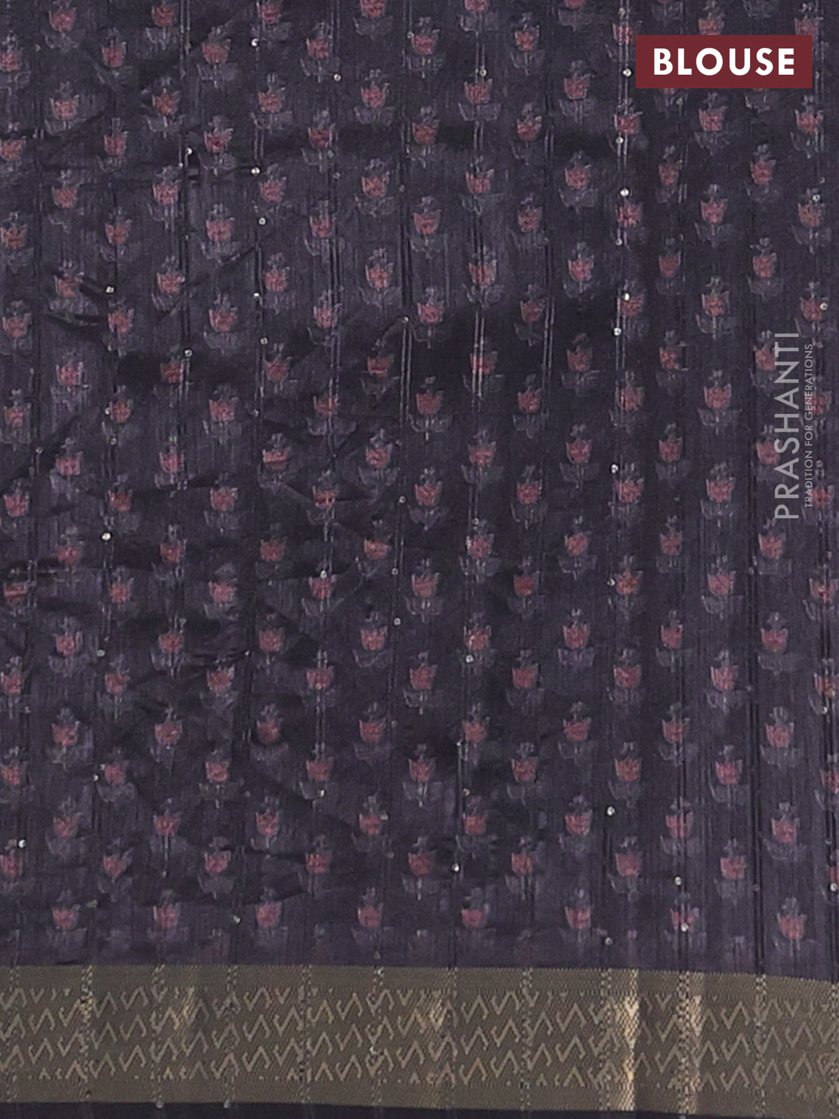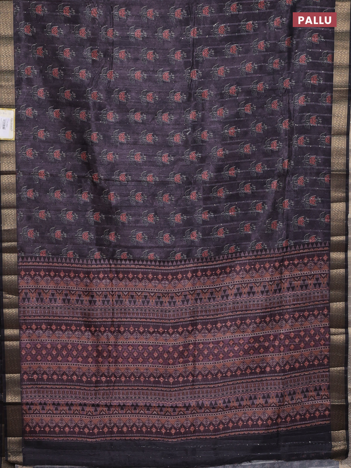 Semi tussar saree deep jamun and black with floral butta prints & sequin work and zari woven border