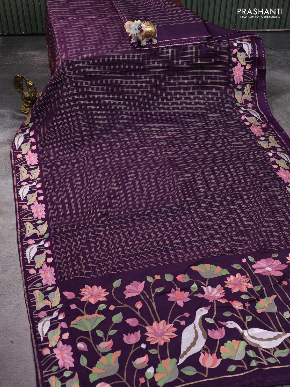Semi tussar saree deep purple with allover zari checked pattern and embroidery border