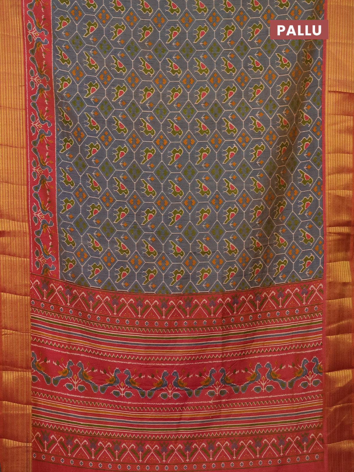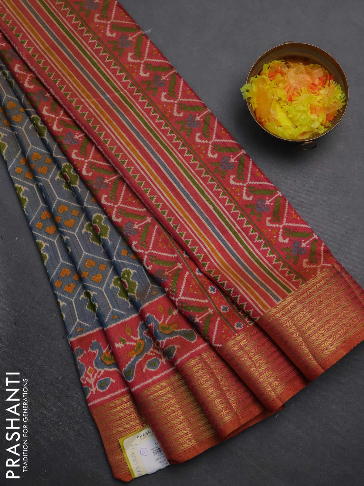 Semi tussar saree dual shade of bluish grey and rust shade with allover patola prints and zari woven border