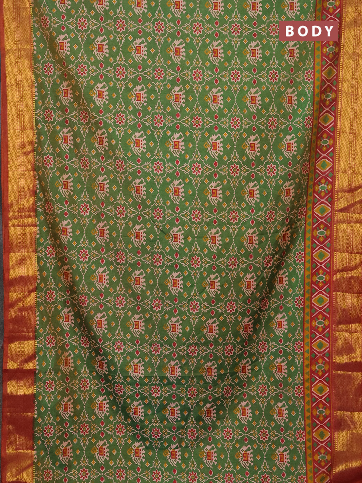 Semi tussar saree dual shade of green and dual shade of rust with allover patola prints and zari woven border