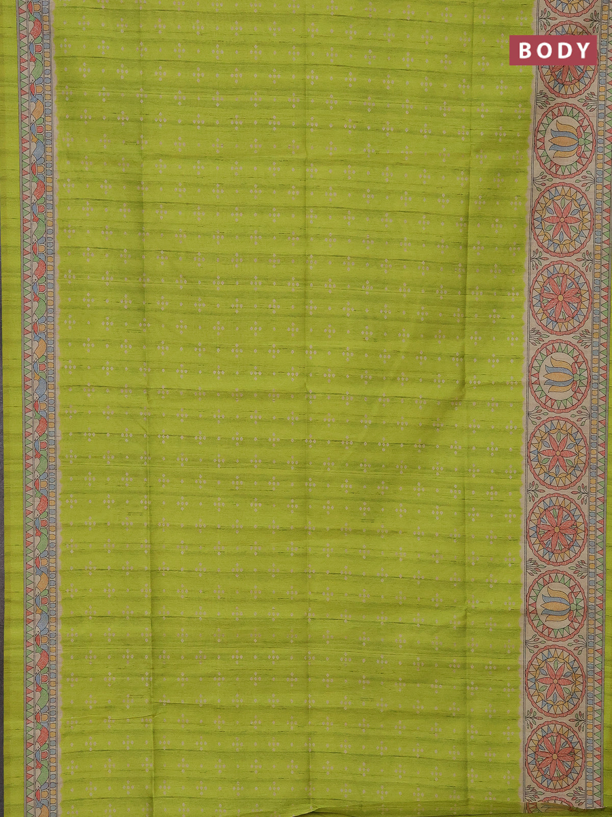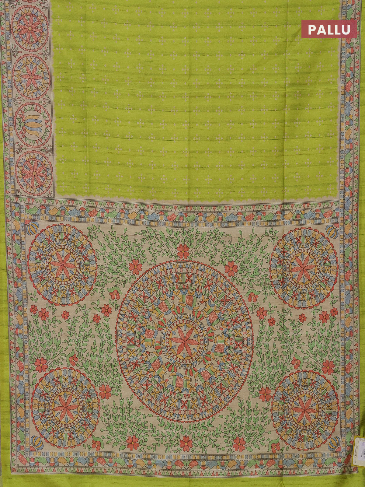 Semi tussar saree fluorescent green and beige with bandhini butta prints and mandhubani printed pallu