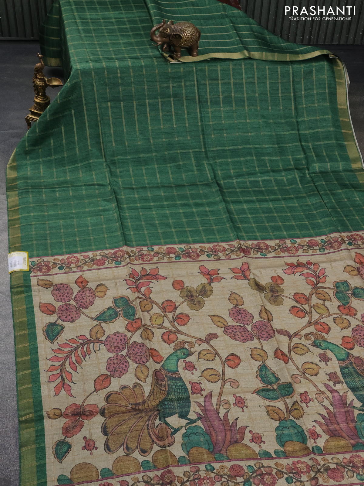 Semi tussar saree green and beige with allover zari checked pattern and kalamkari printed pallu