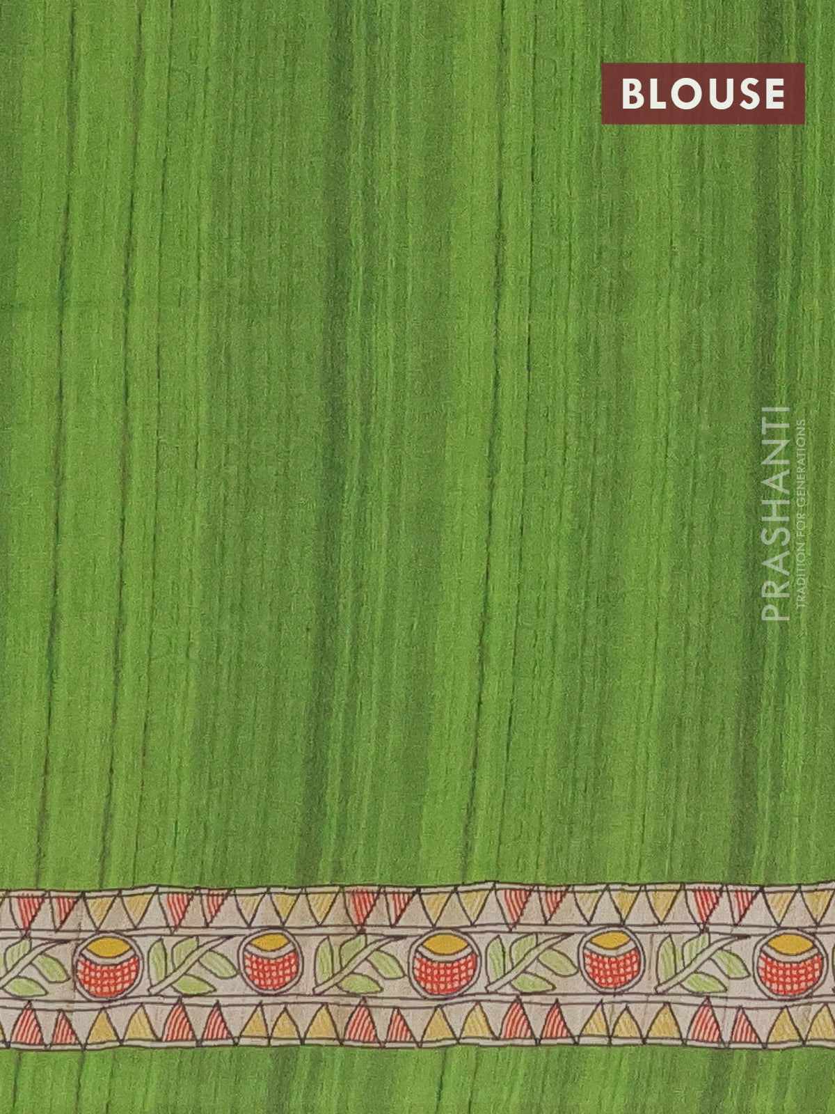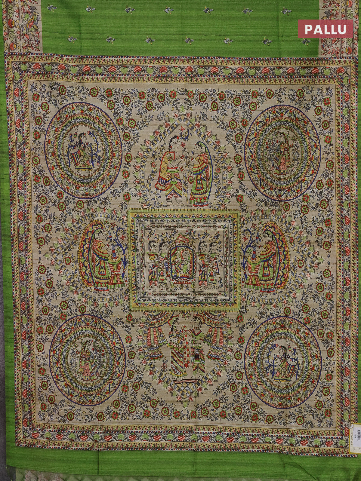 Semi tussar saree green and beige with butta prints and madhubani printed pallu