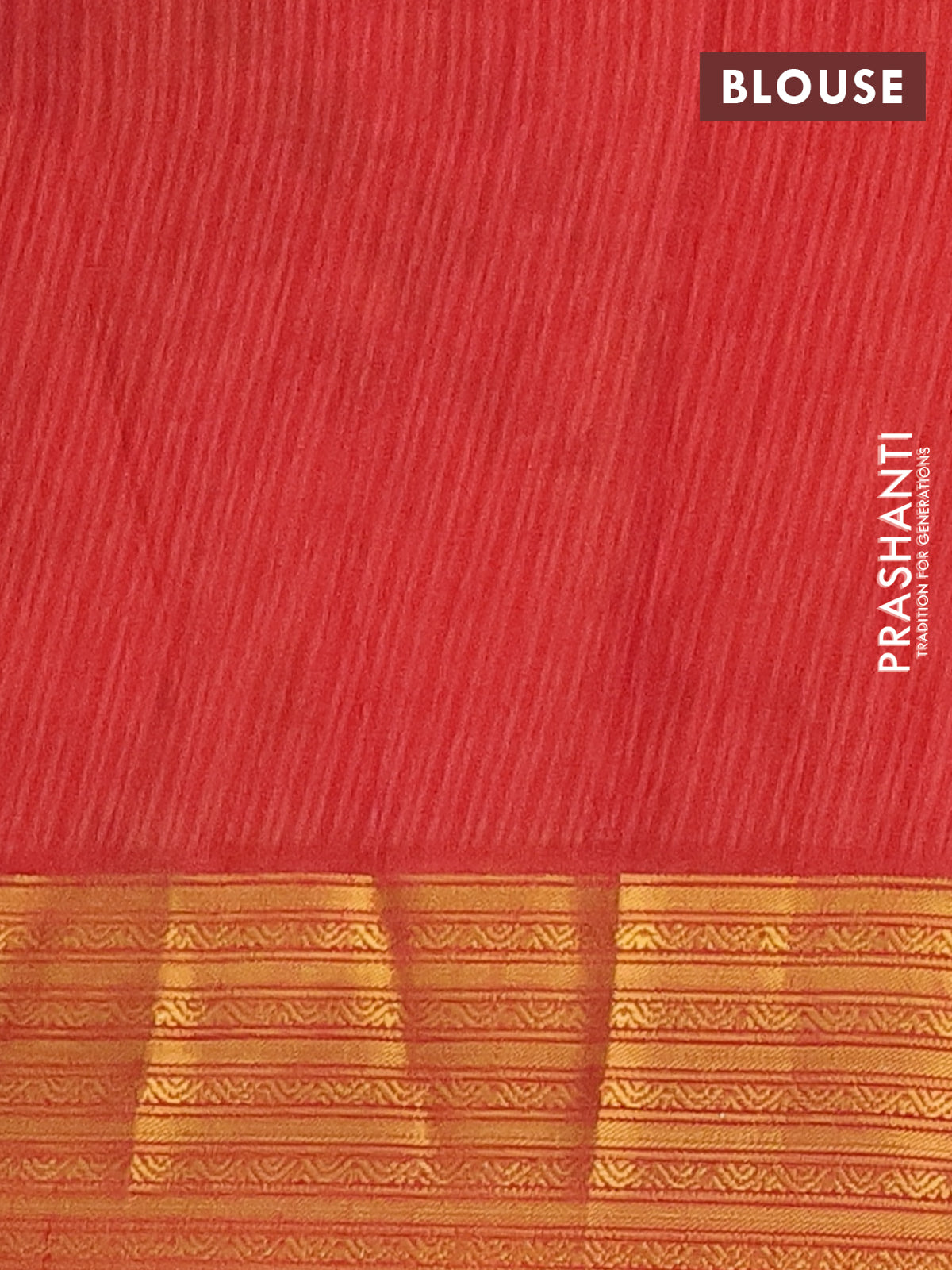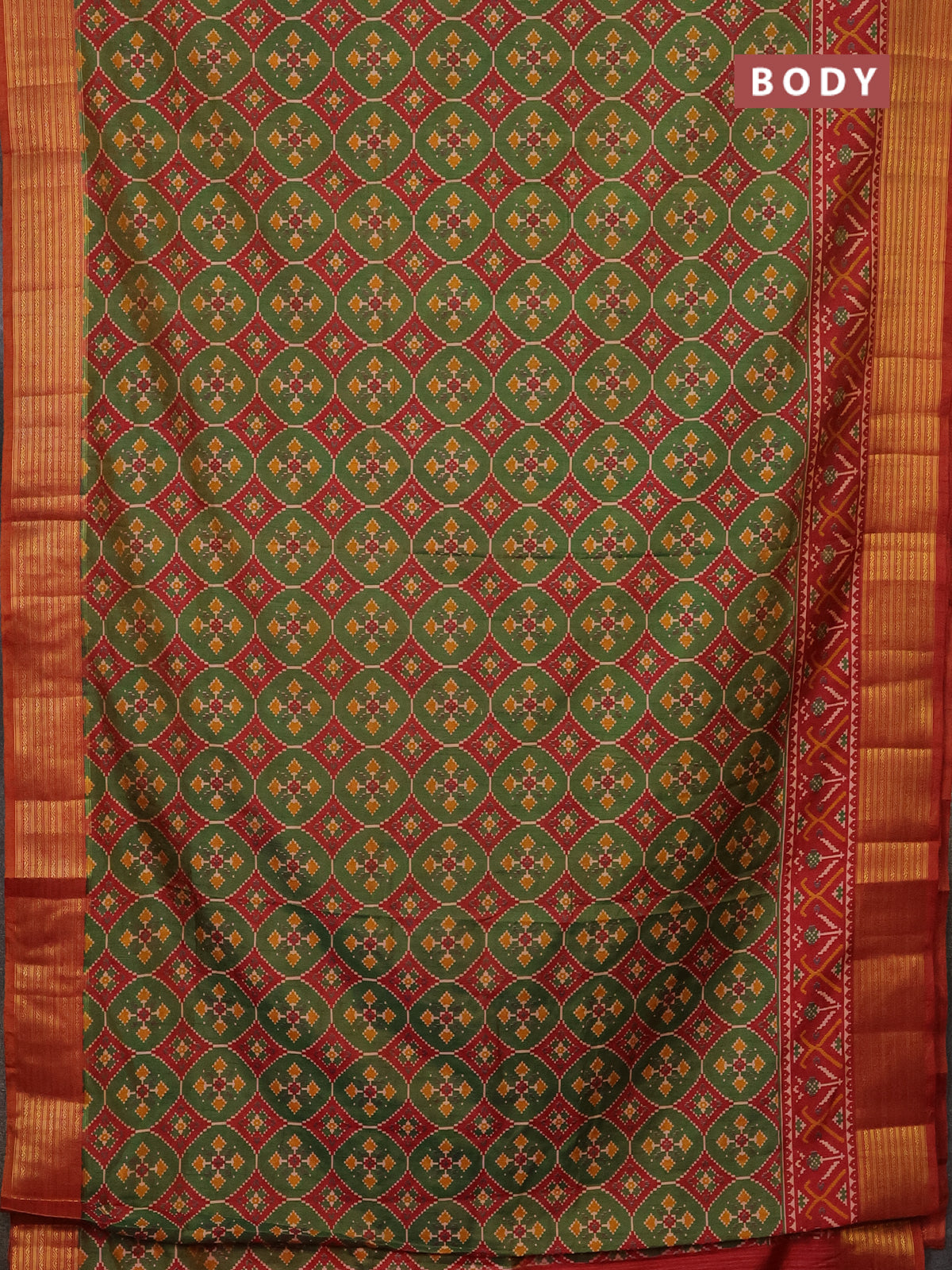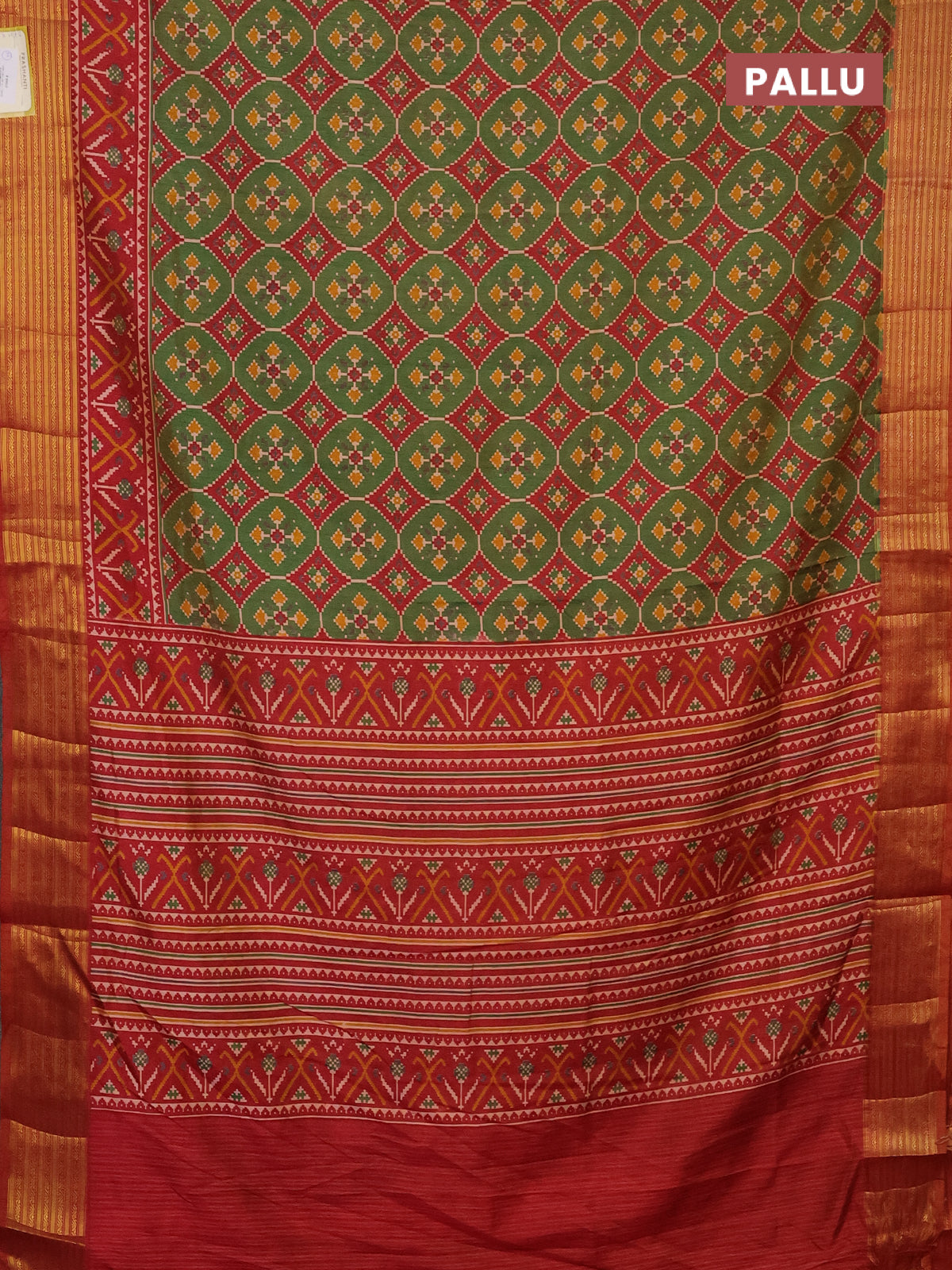 Semi tussar saree green and rust shade with allover ikat prints and zari woven border