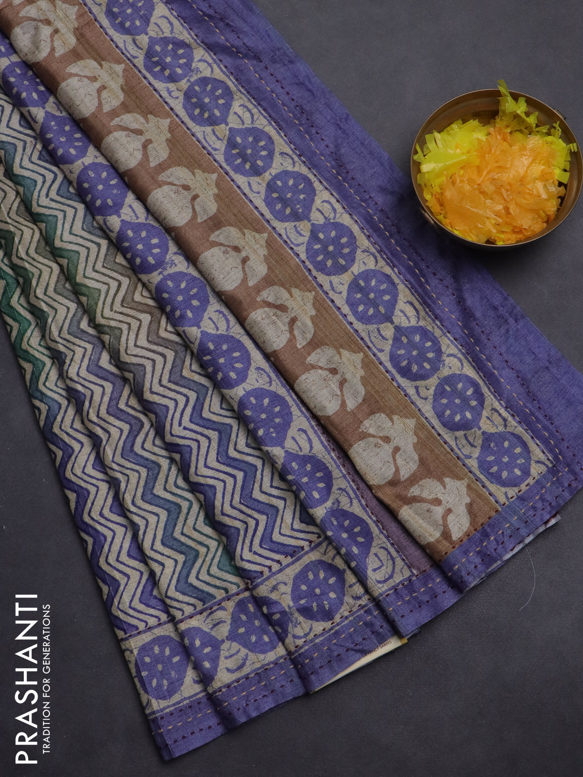 Semi tussar saree green shade and violet with allover wevy prints and kantha stitch work border