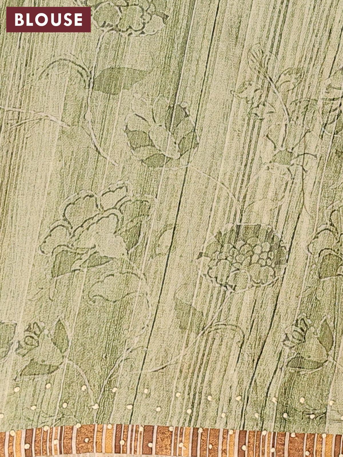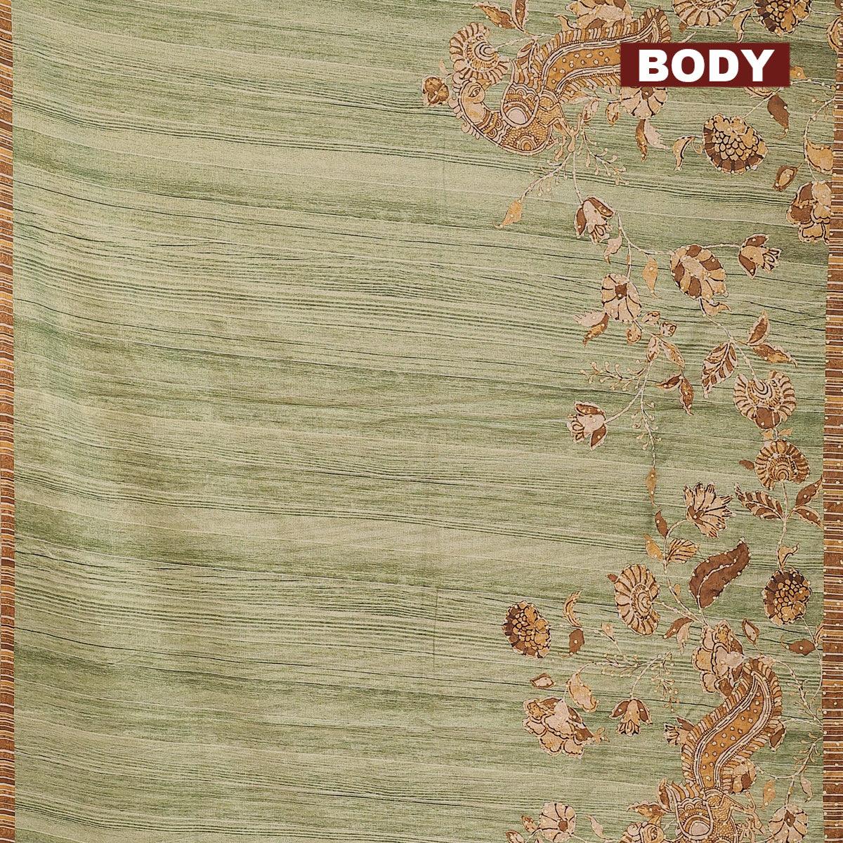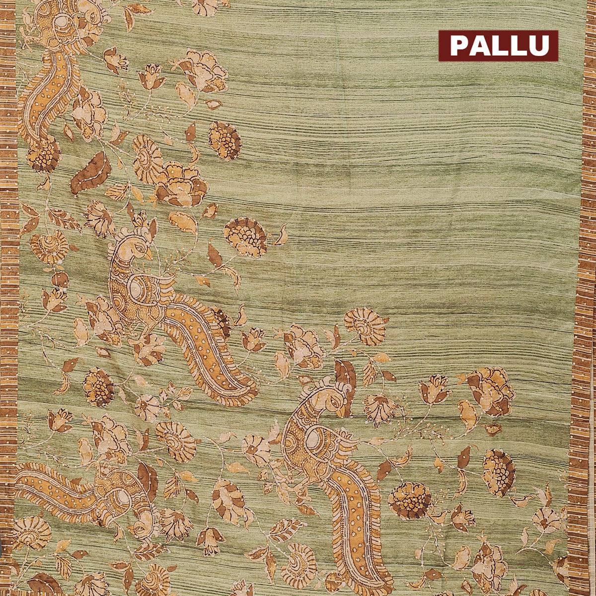 Semi tussar saree green shade with kalamkari prints & french knot work and simple border