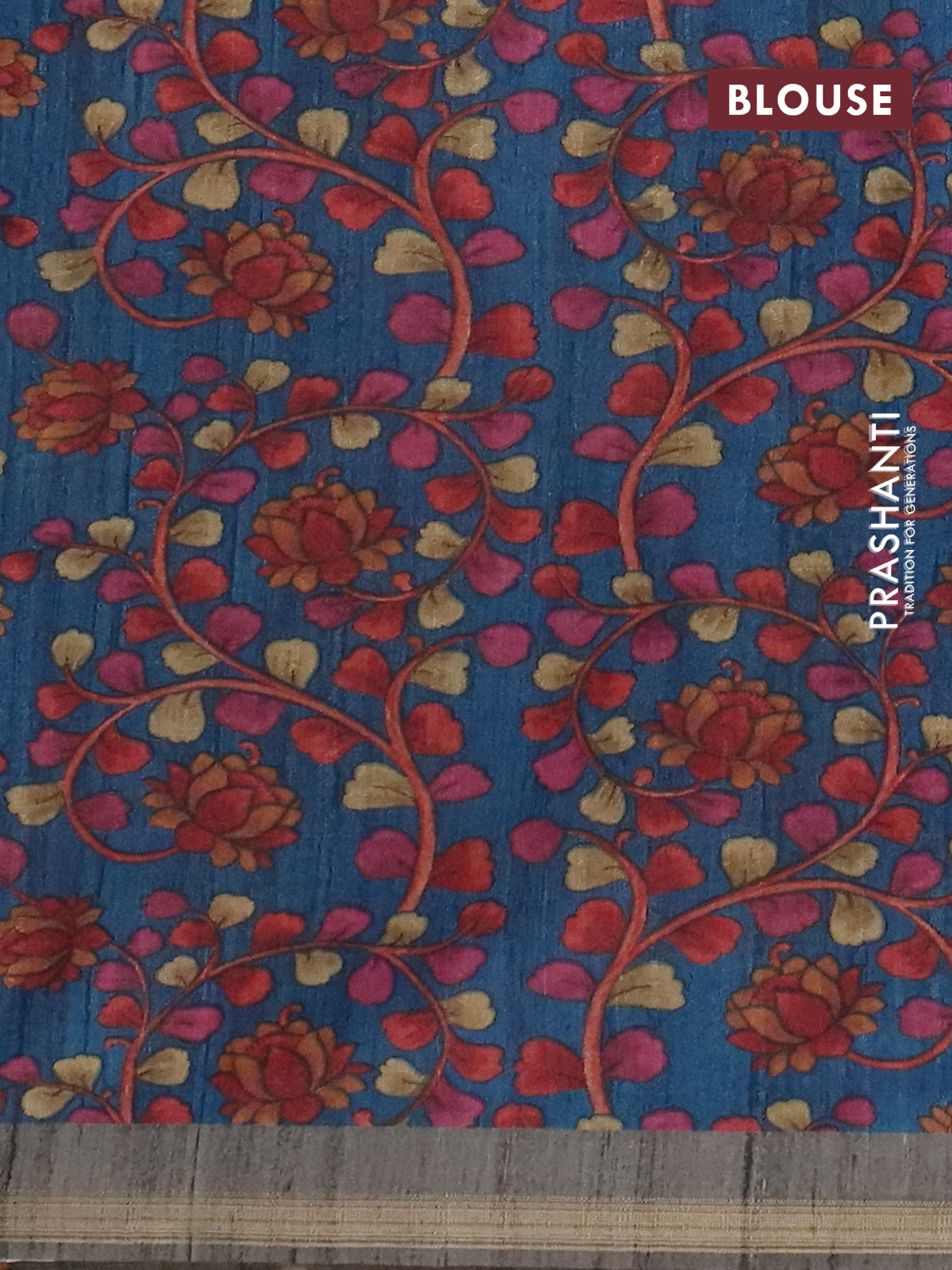 Semi tussar saree grey and cs blue with embroidery buttas and kalamkari prints & pita work pallu