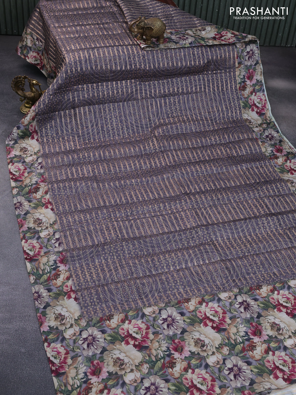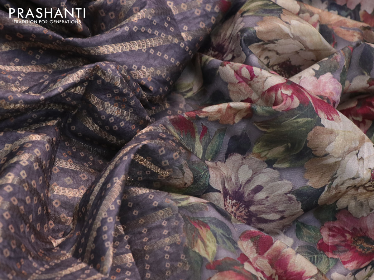 Semi tussar saree grey with allover zari woven veldhari design & bandhani prints and floral printed border
