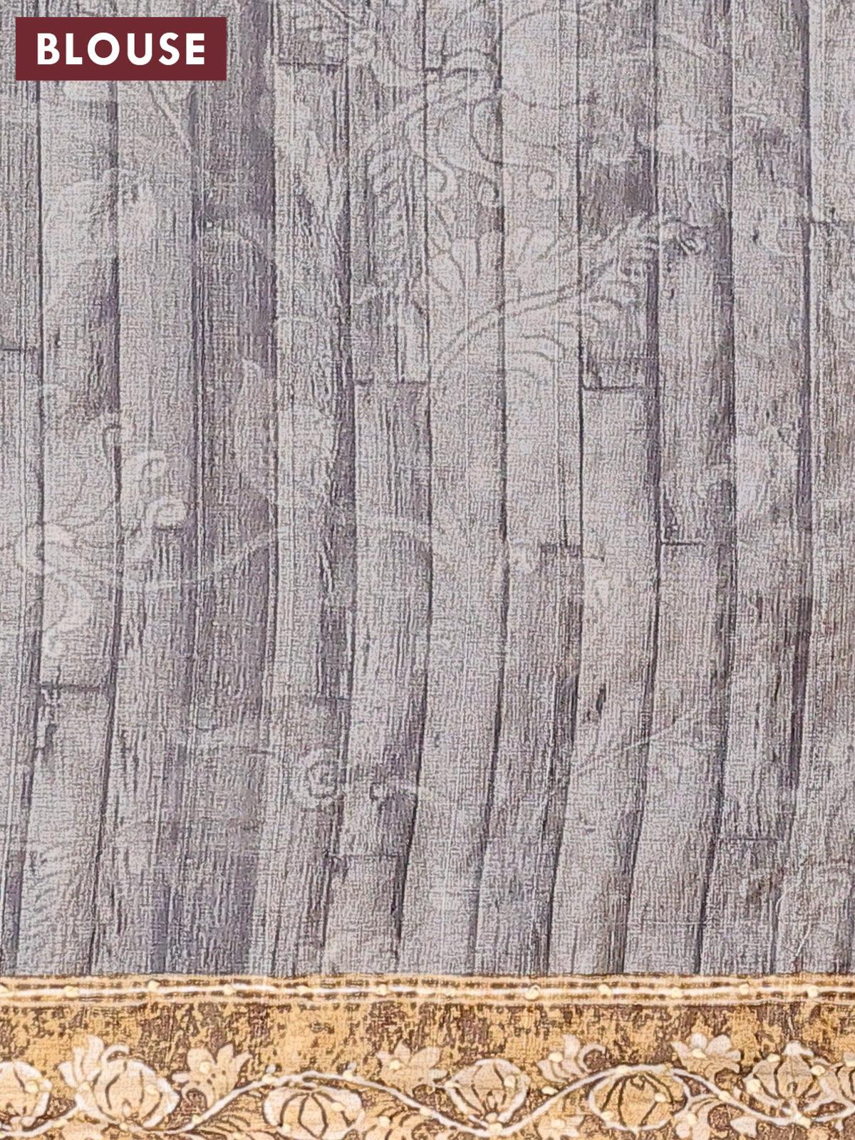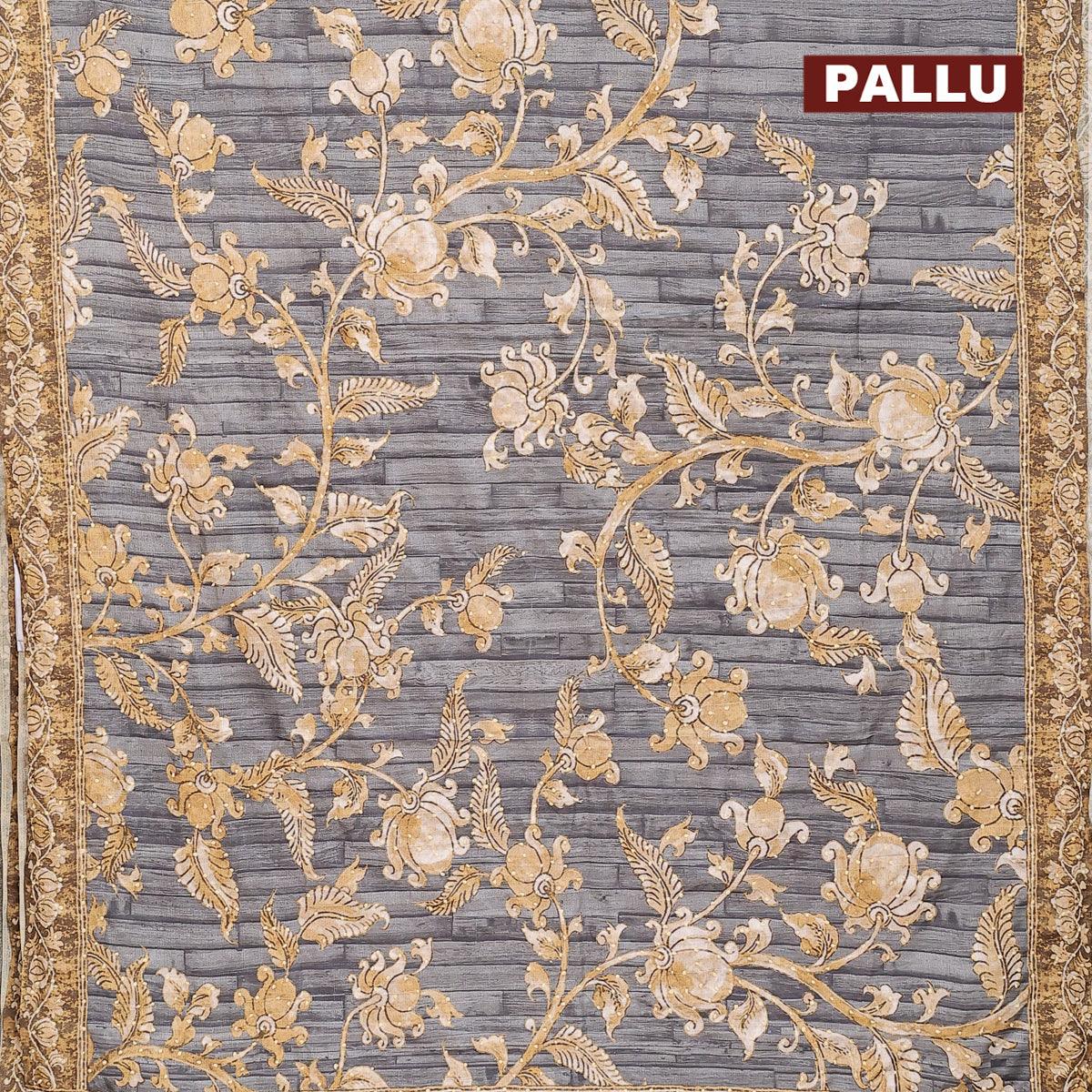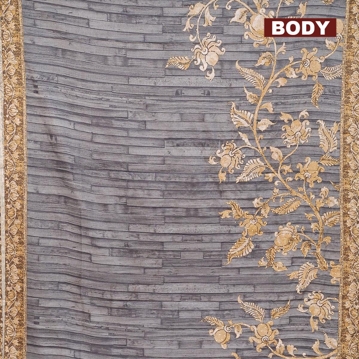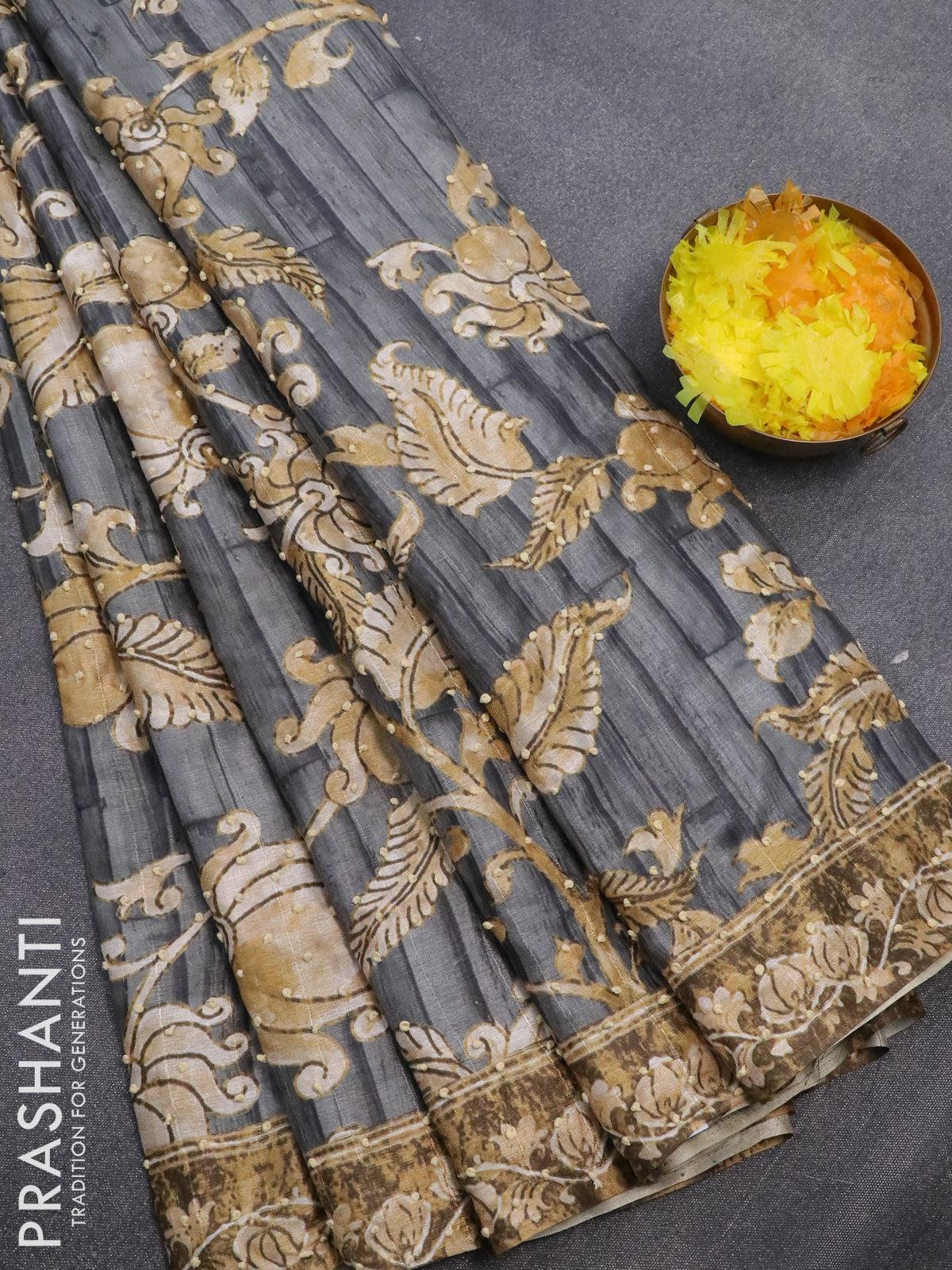 Semi tussar saree grey with kalamkari prints & french knot work and printed border