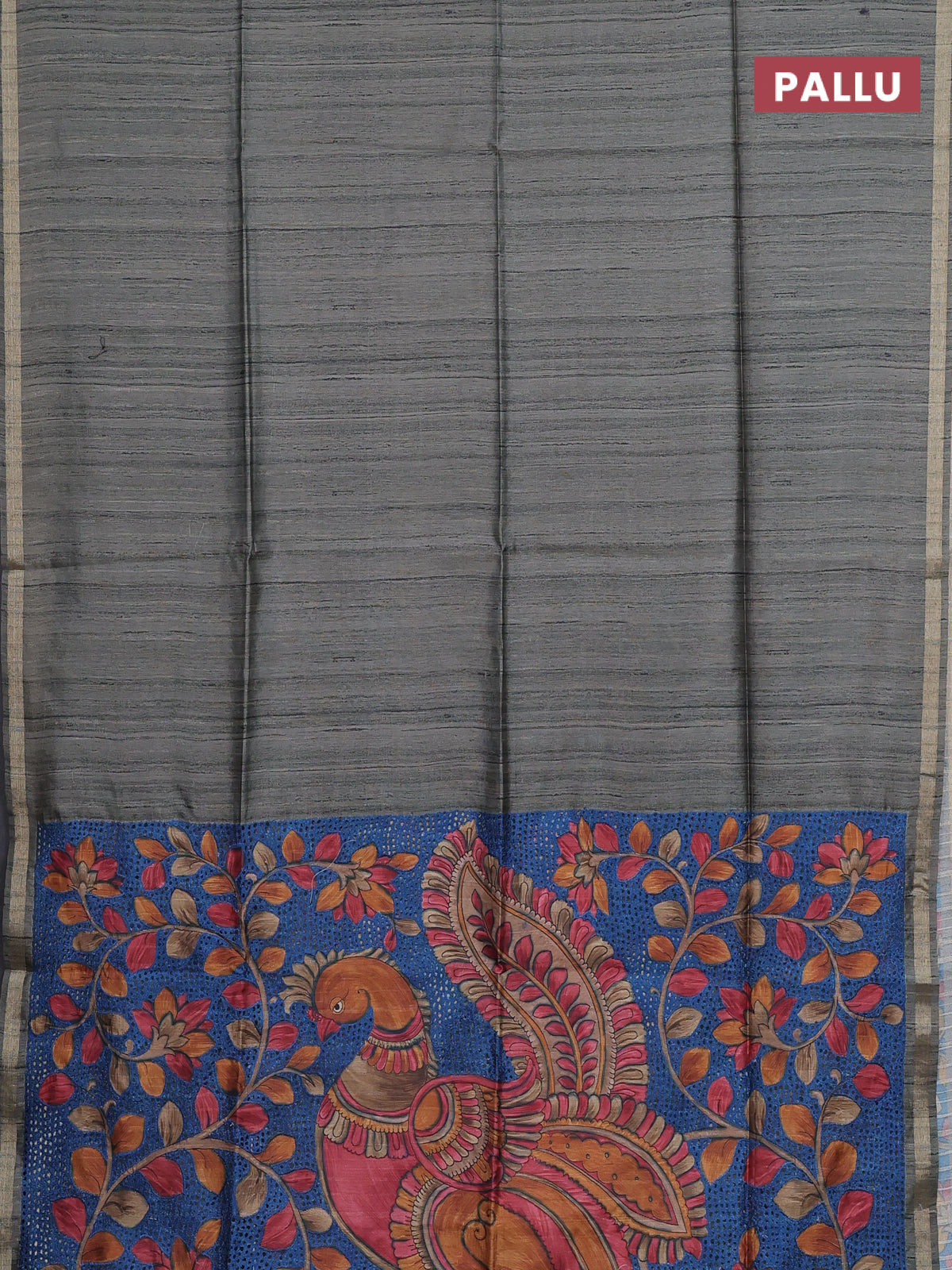 Semi tussar saree greyish green with plain body and kalamkari prints & cut work pallu