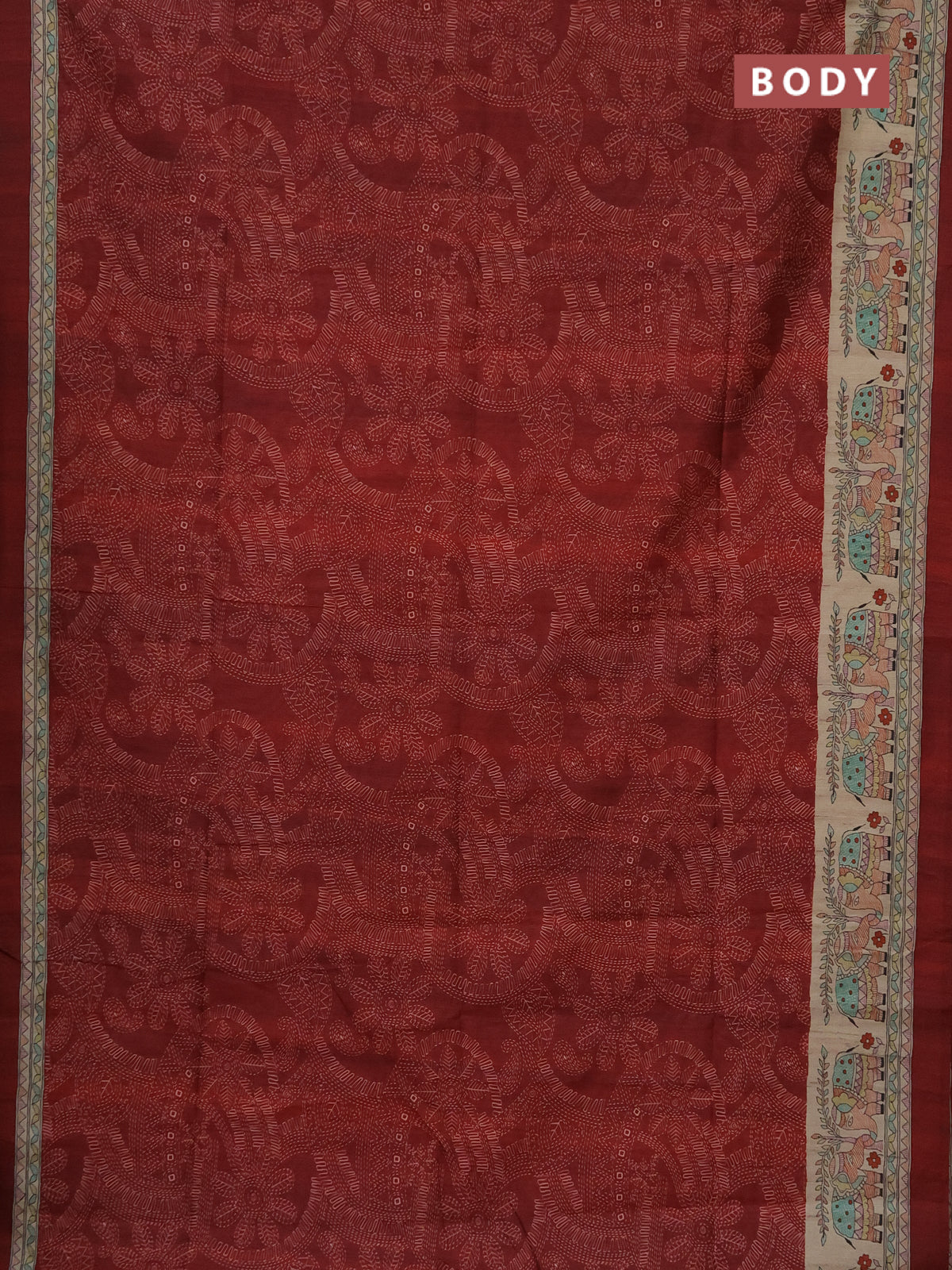 Semi tussar saree maroon and beige with allover prints and mandhubani printed pallu