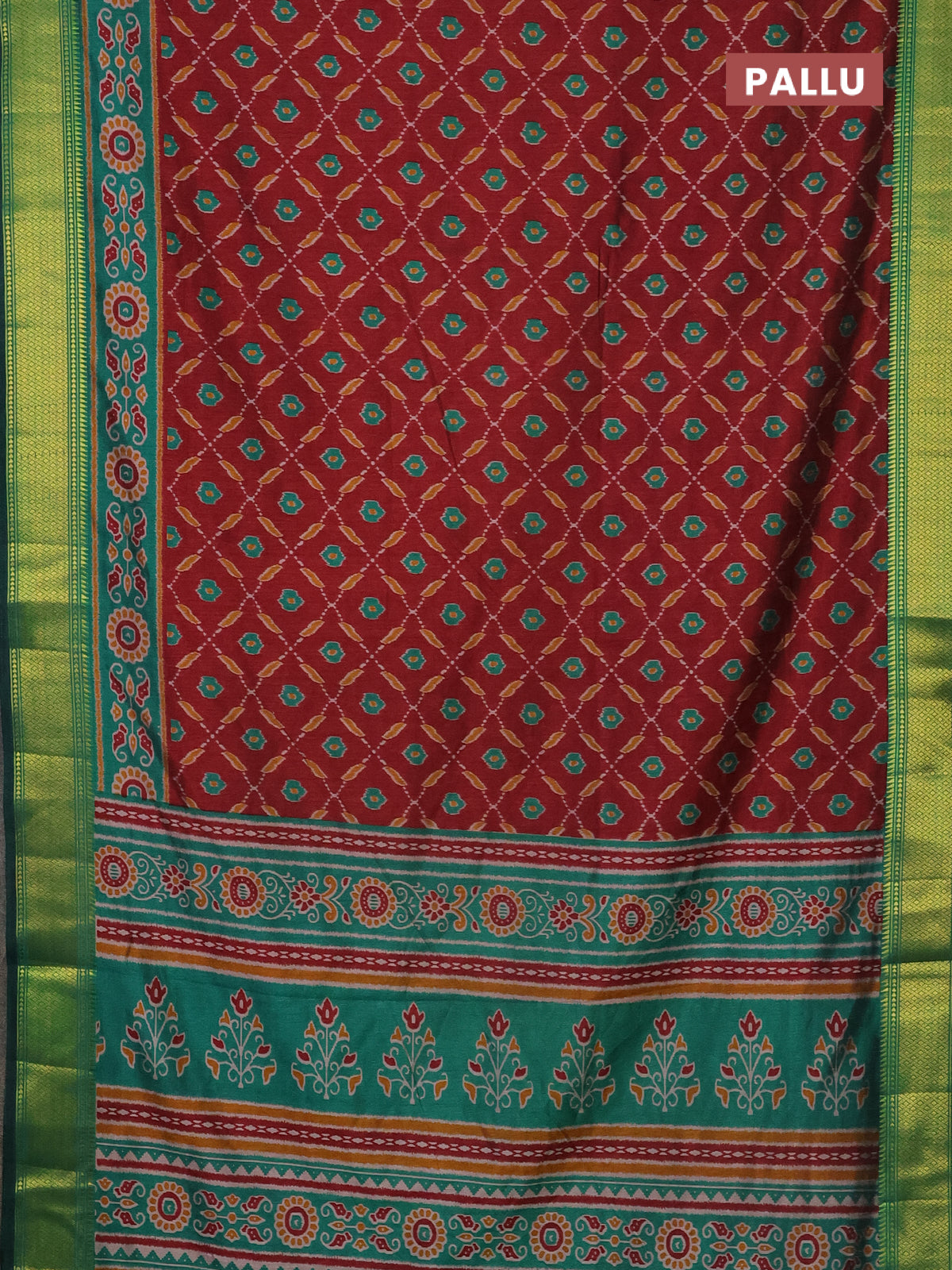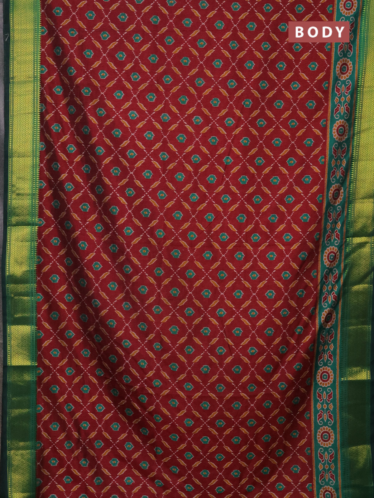 Semi tussar saree maroon and green with allover ikat prints and zari woven border