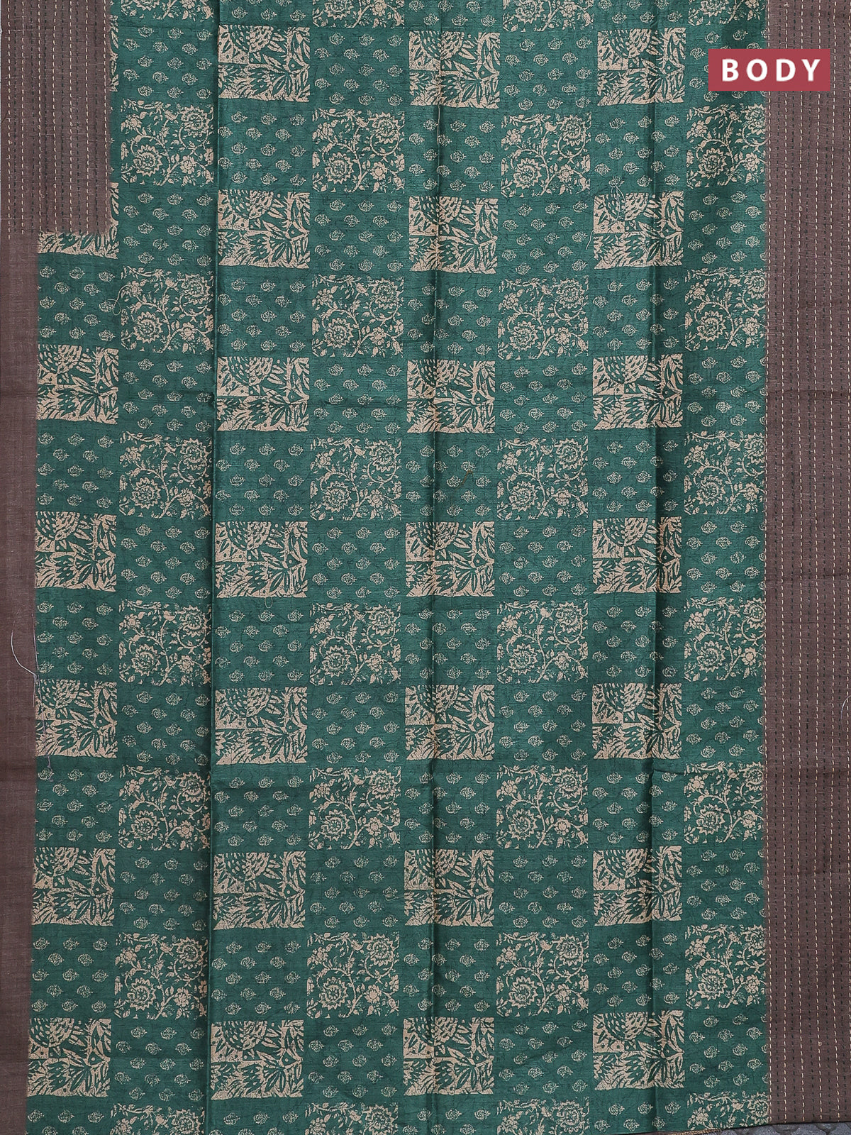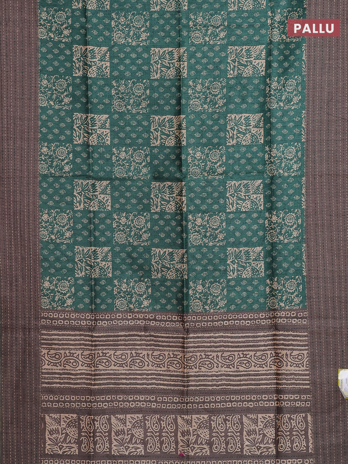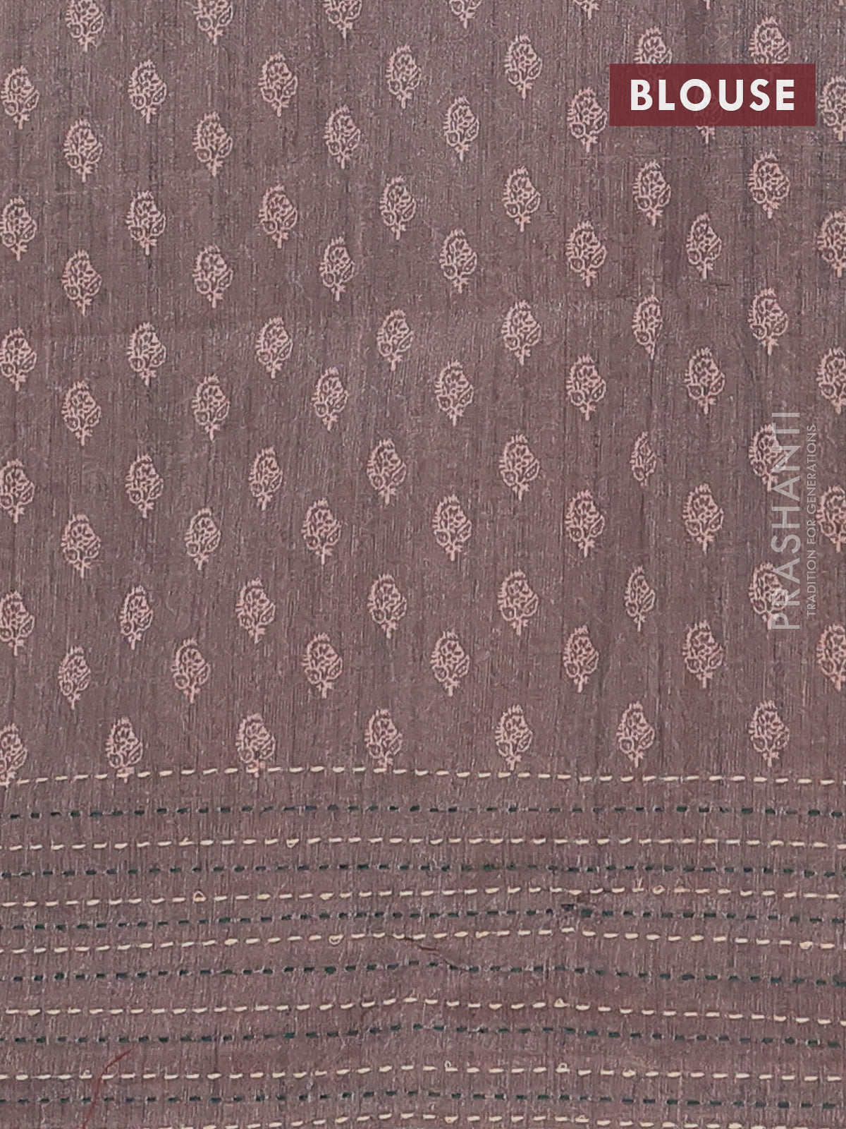 Semi tussar saree maroon shade and greyish brown with allover batik prints and katha stitch work pallu & border