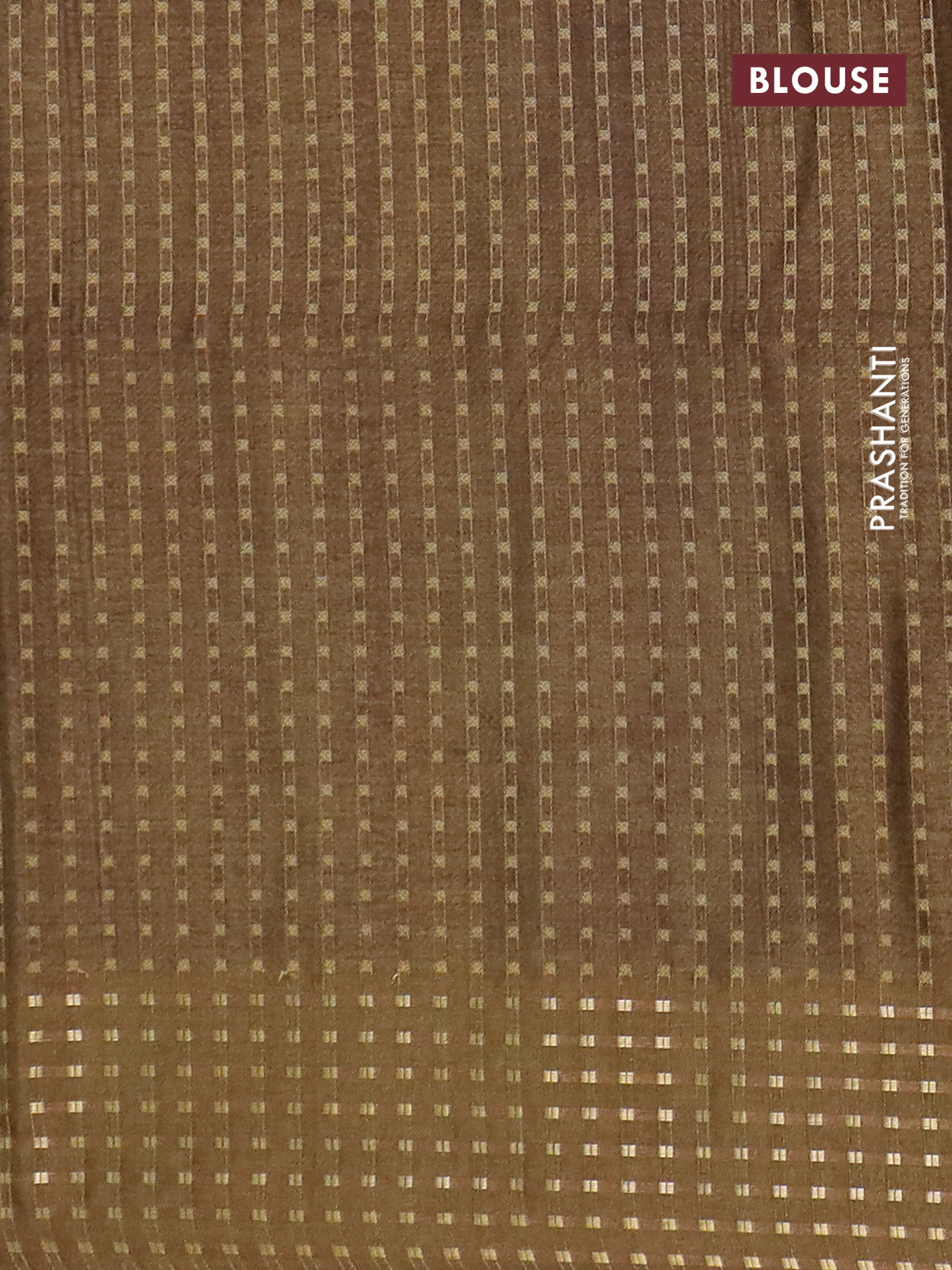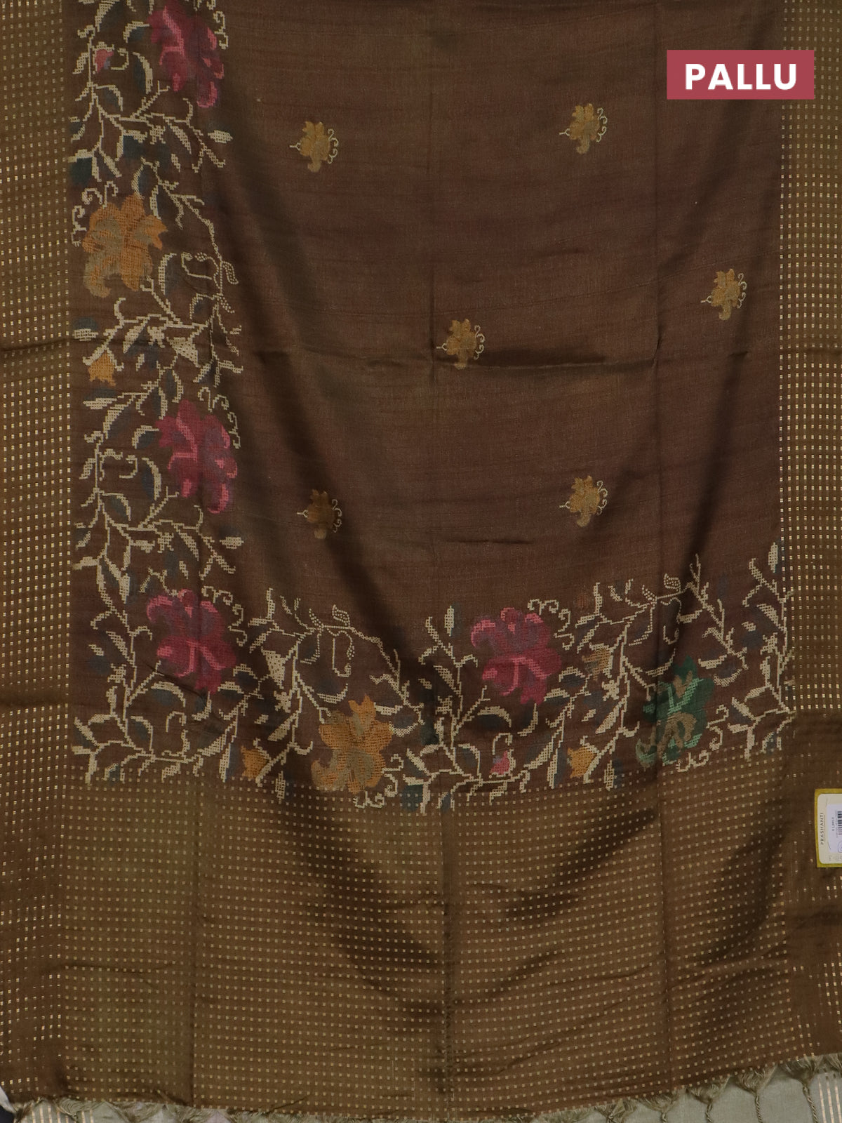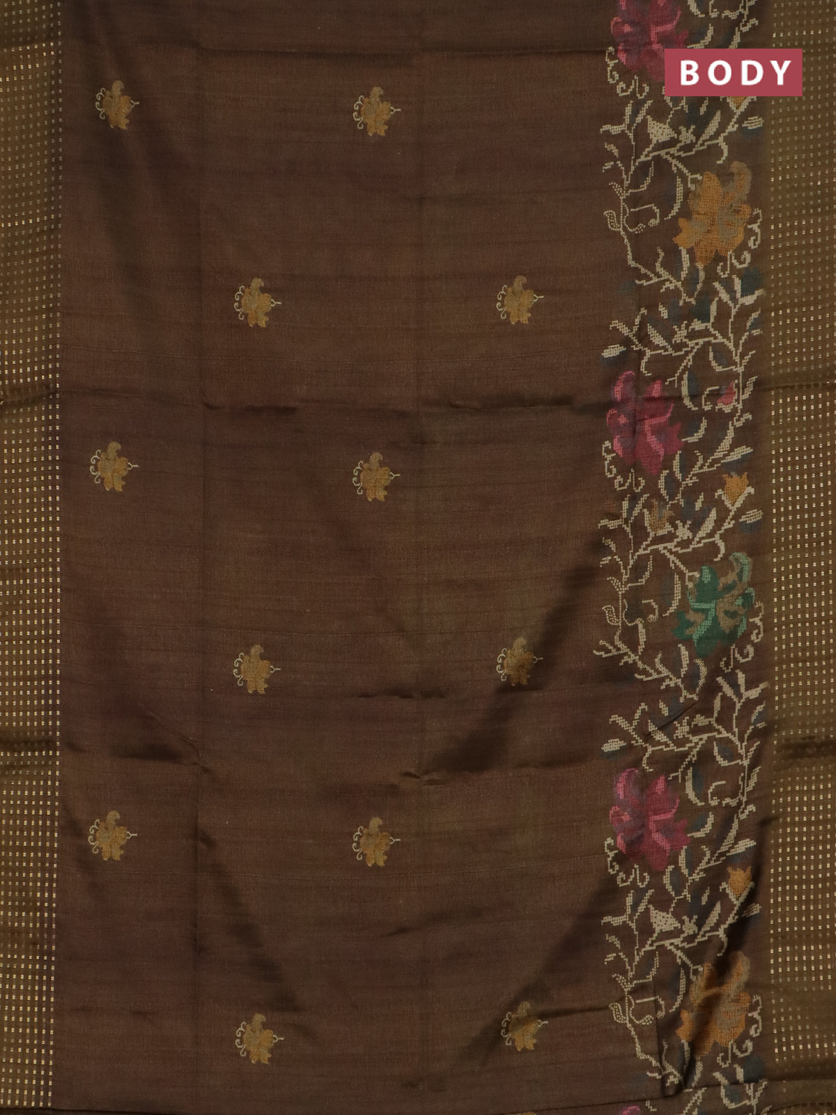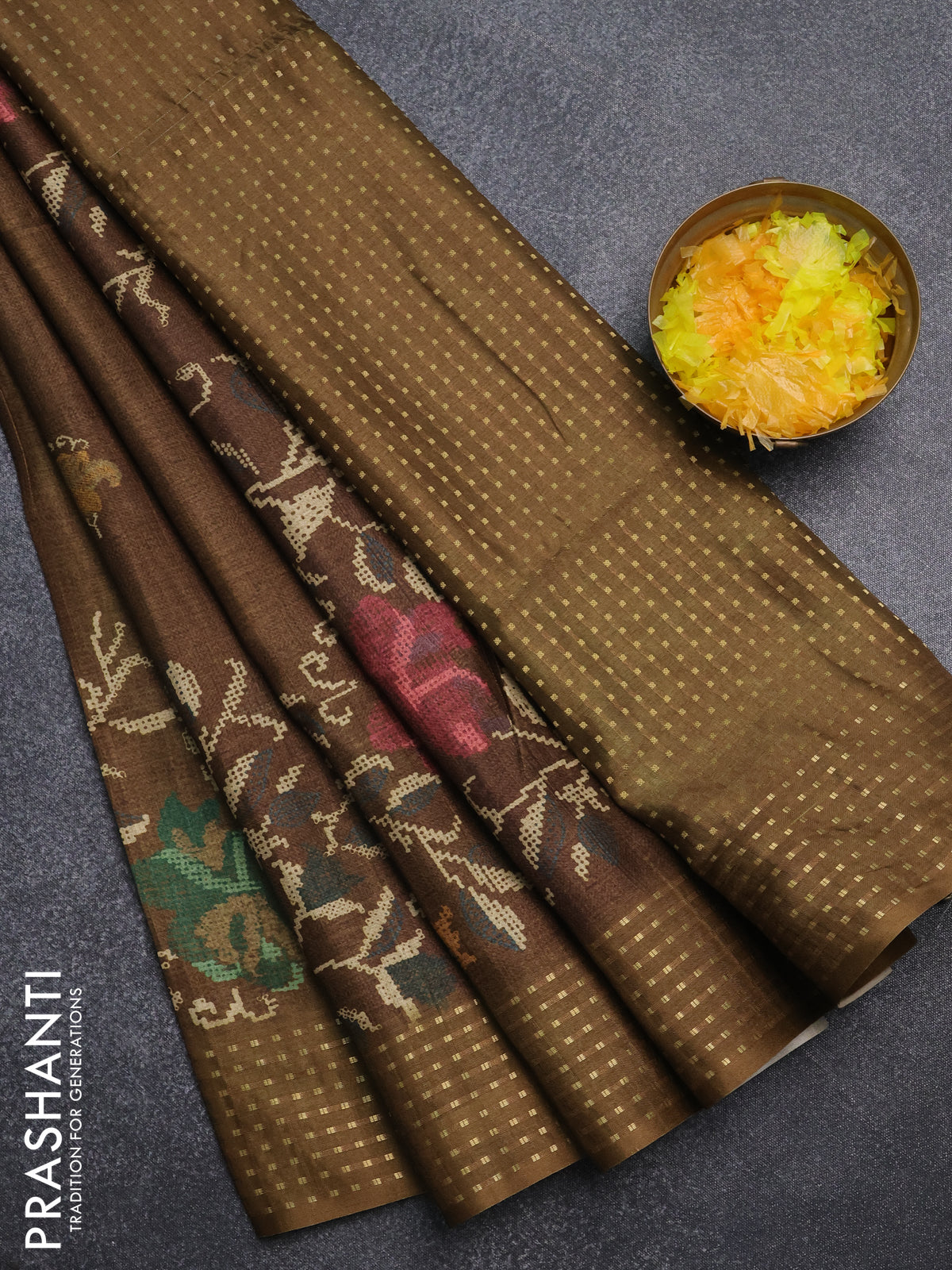Semi tussar saree mehendi green with floral prints and zari woven pallu