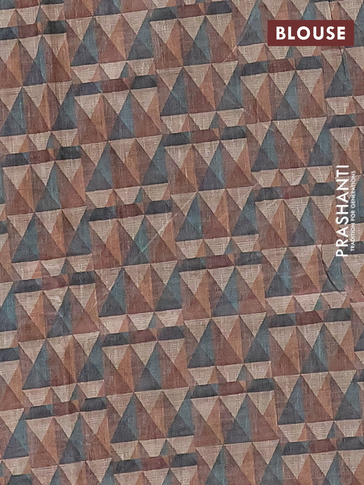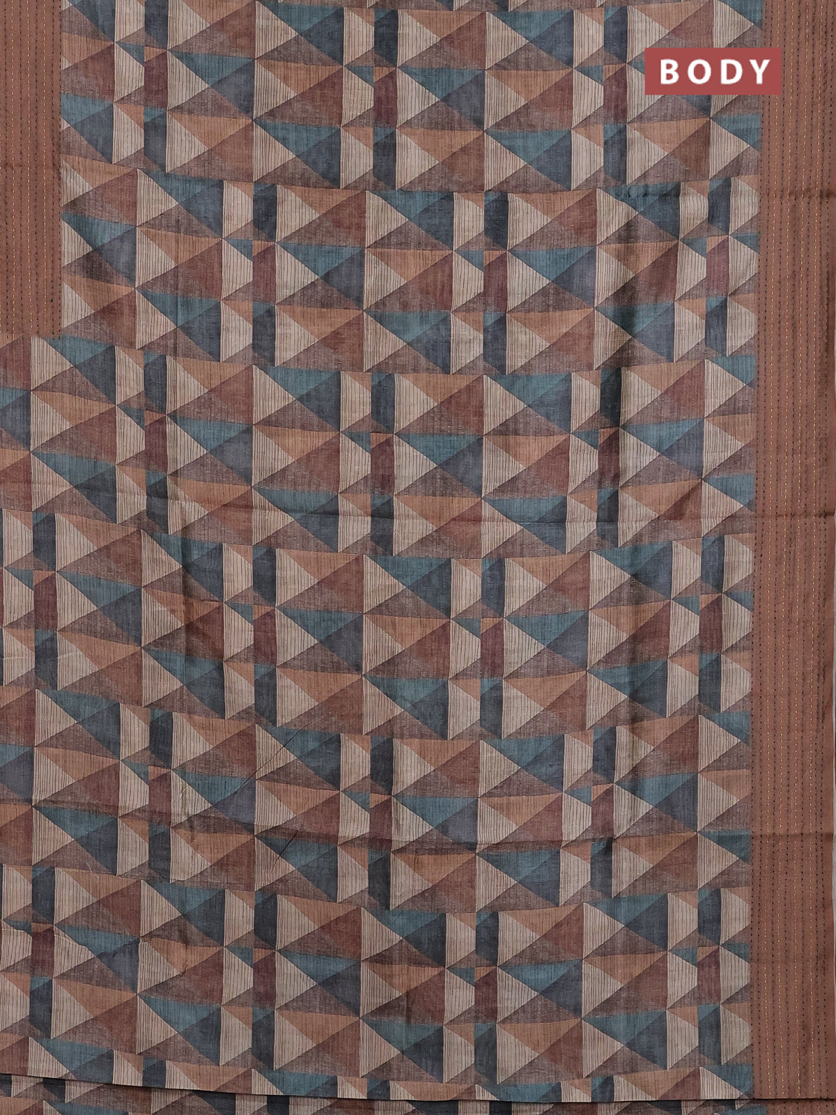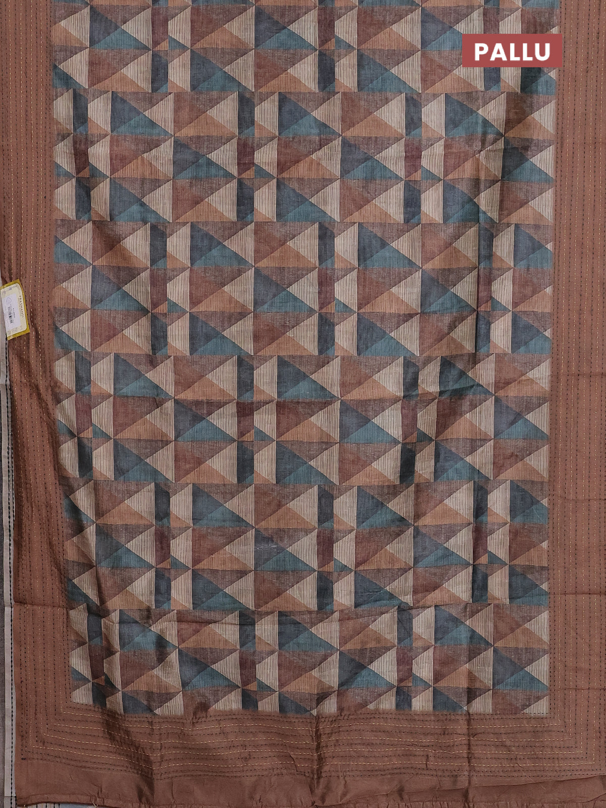 Semi tussar saree multi colour and dark sandal with allover geometric prints and kantha stitch work border