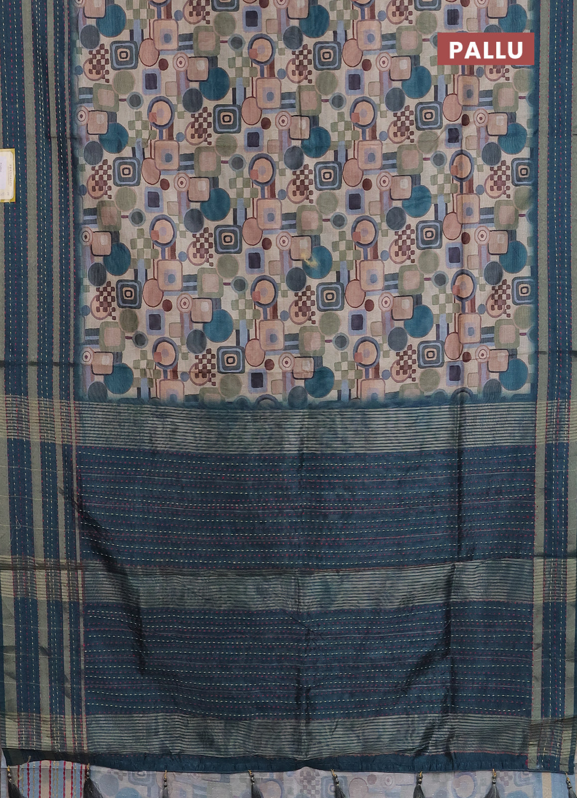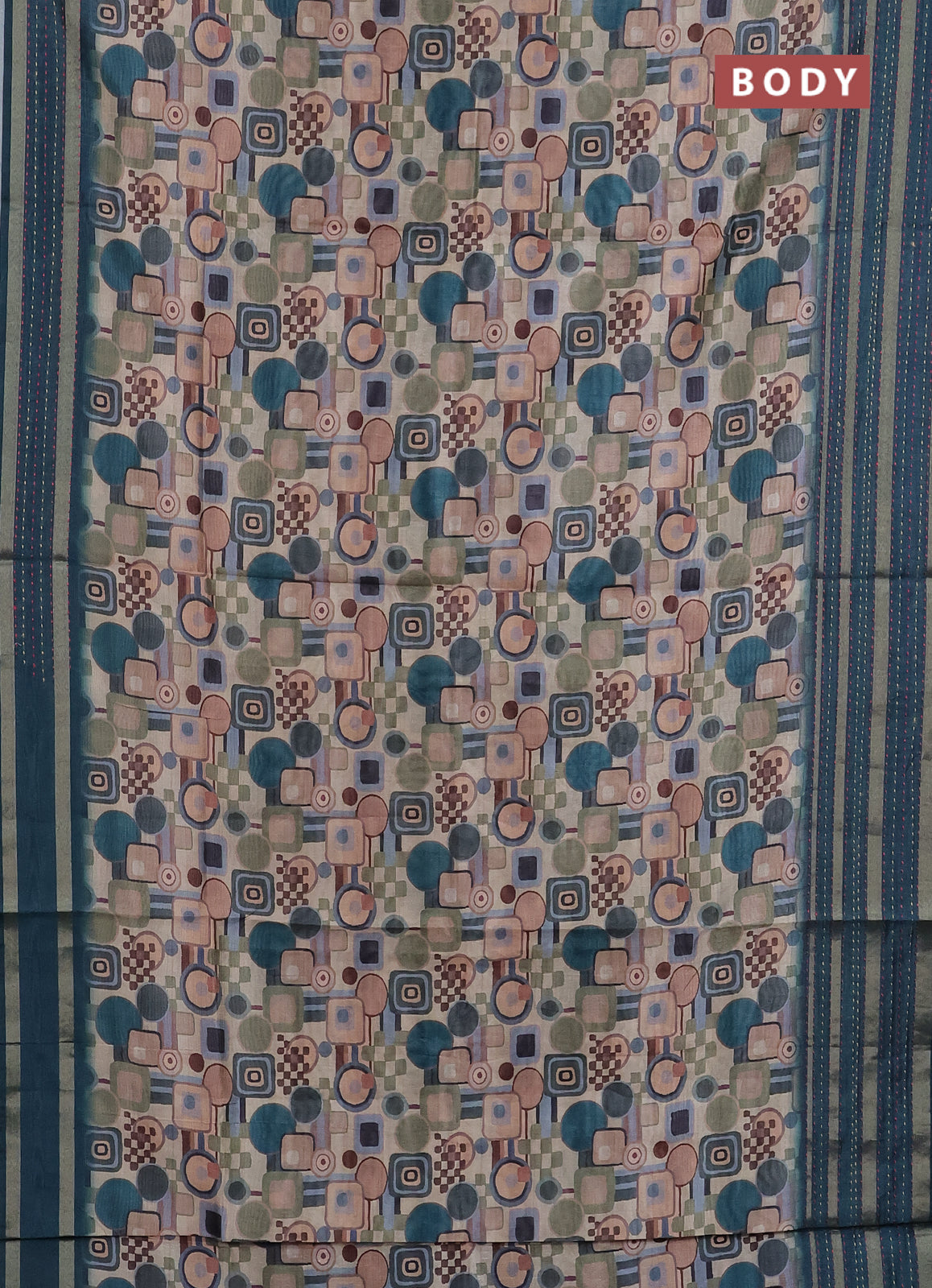 Semi tussar saree multi colour and peacock green with allover geometric prints and zari woven kantha work border