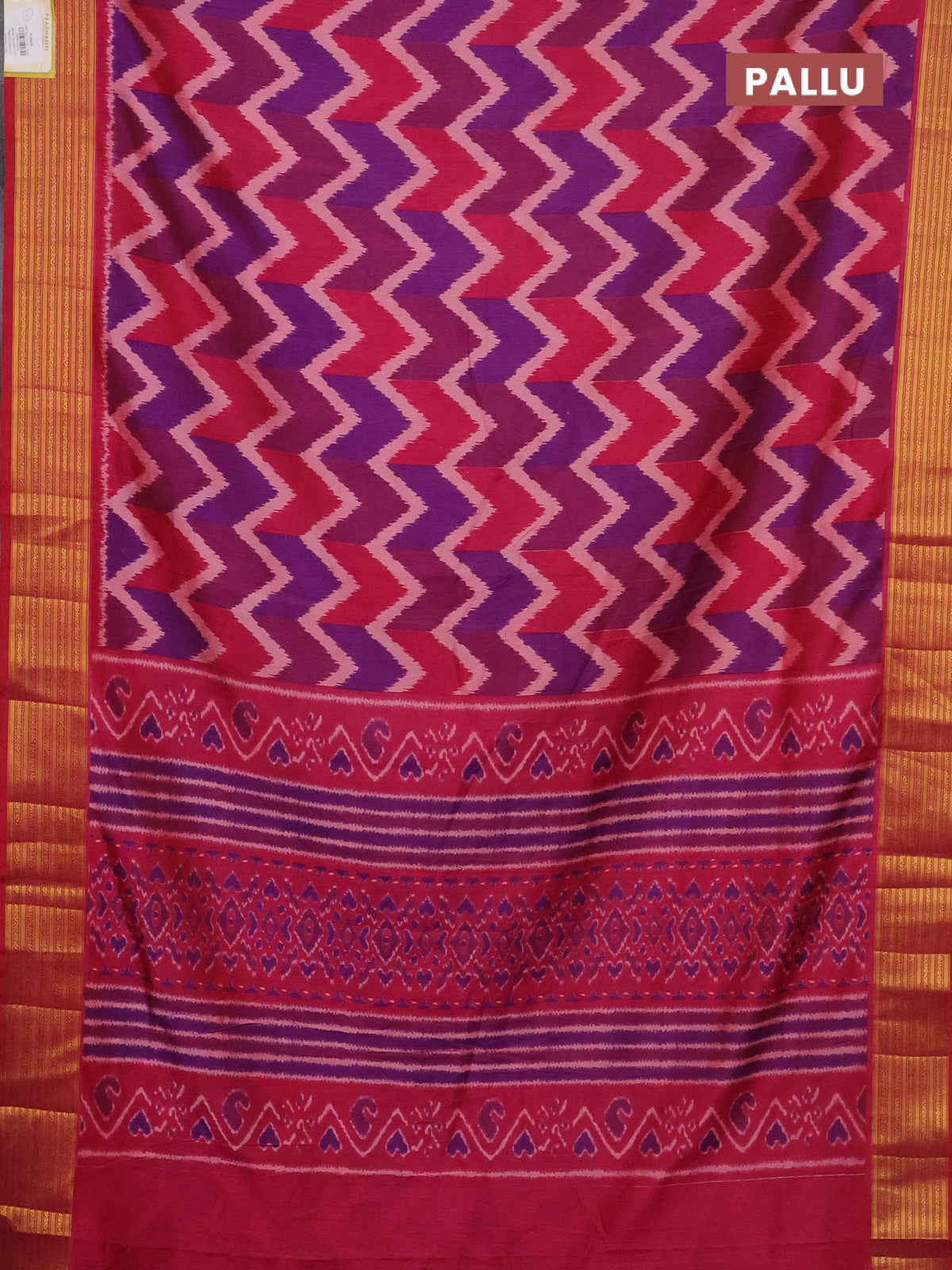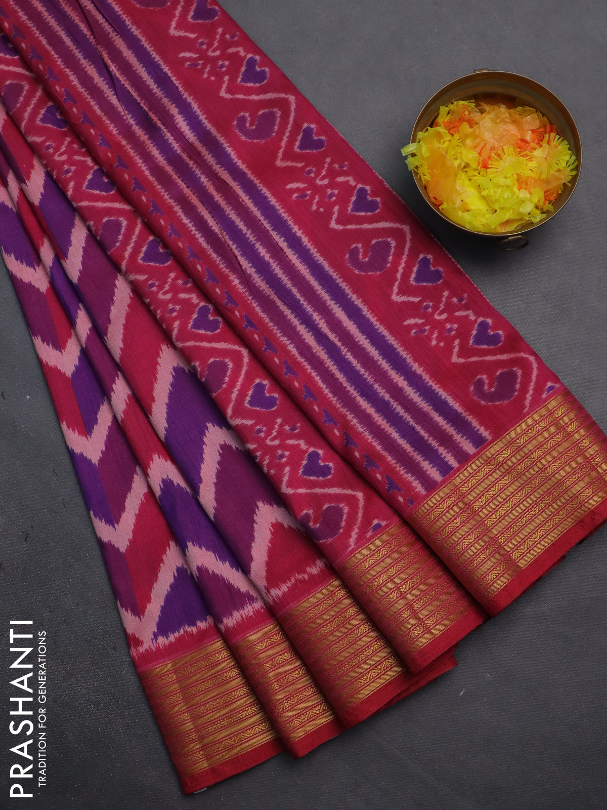 Semi tussar saree multi colour and pink with allover zig zag ikat prints and zari woven border