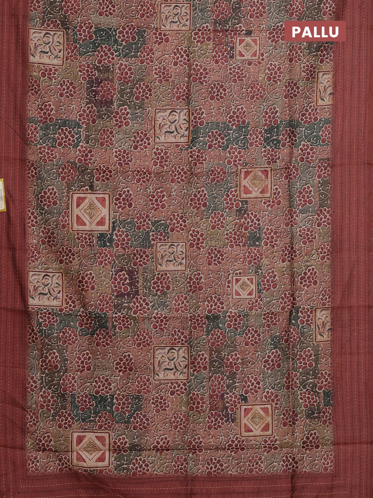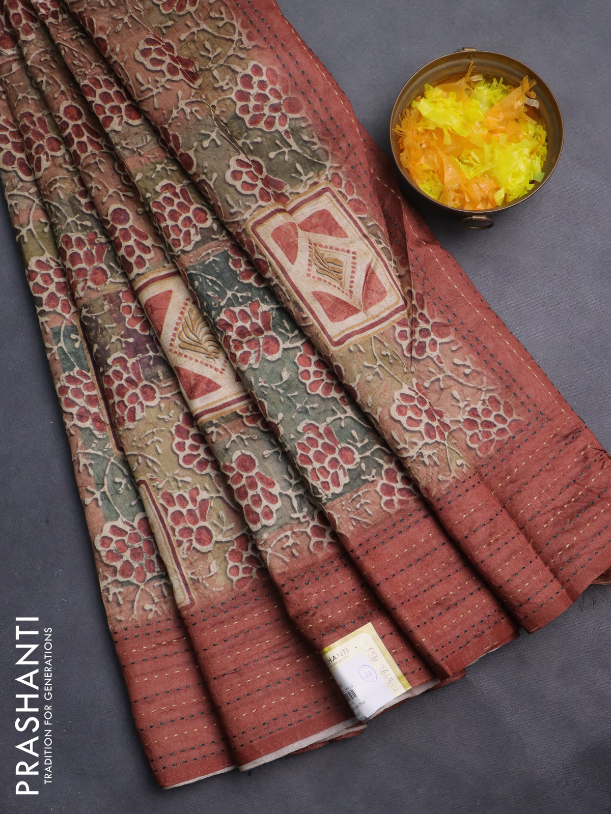 Semi tussar saree multi colour and rust shade with allover prints and kantha stitch work border