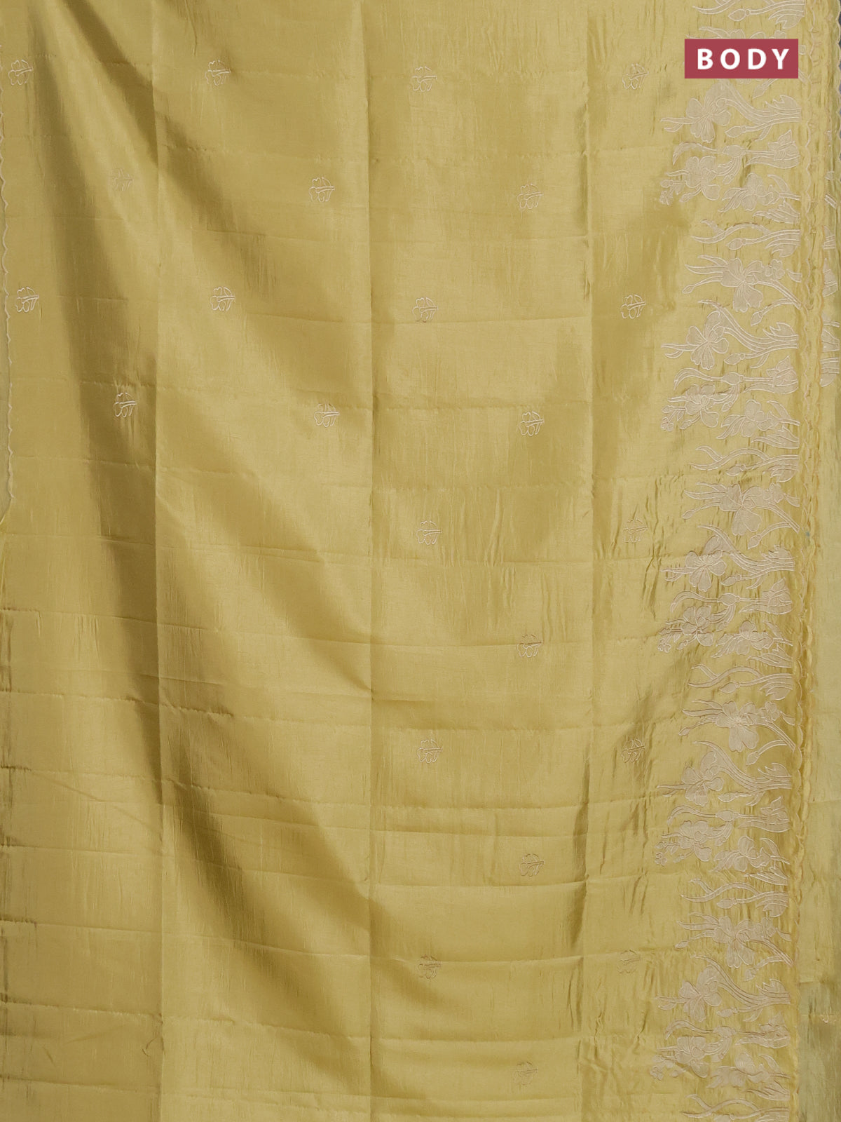 Semi tussar saree mustard shade with floral embroidery work and applique work border