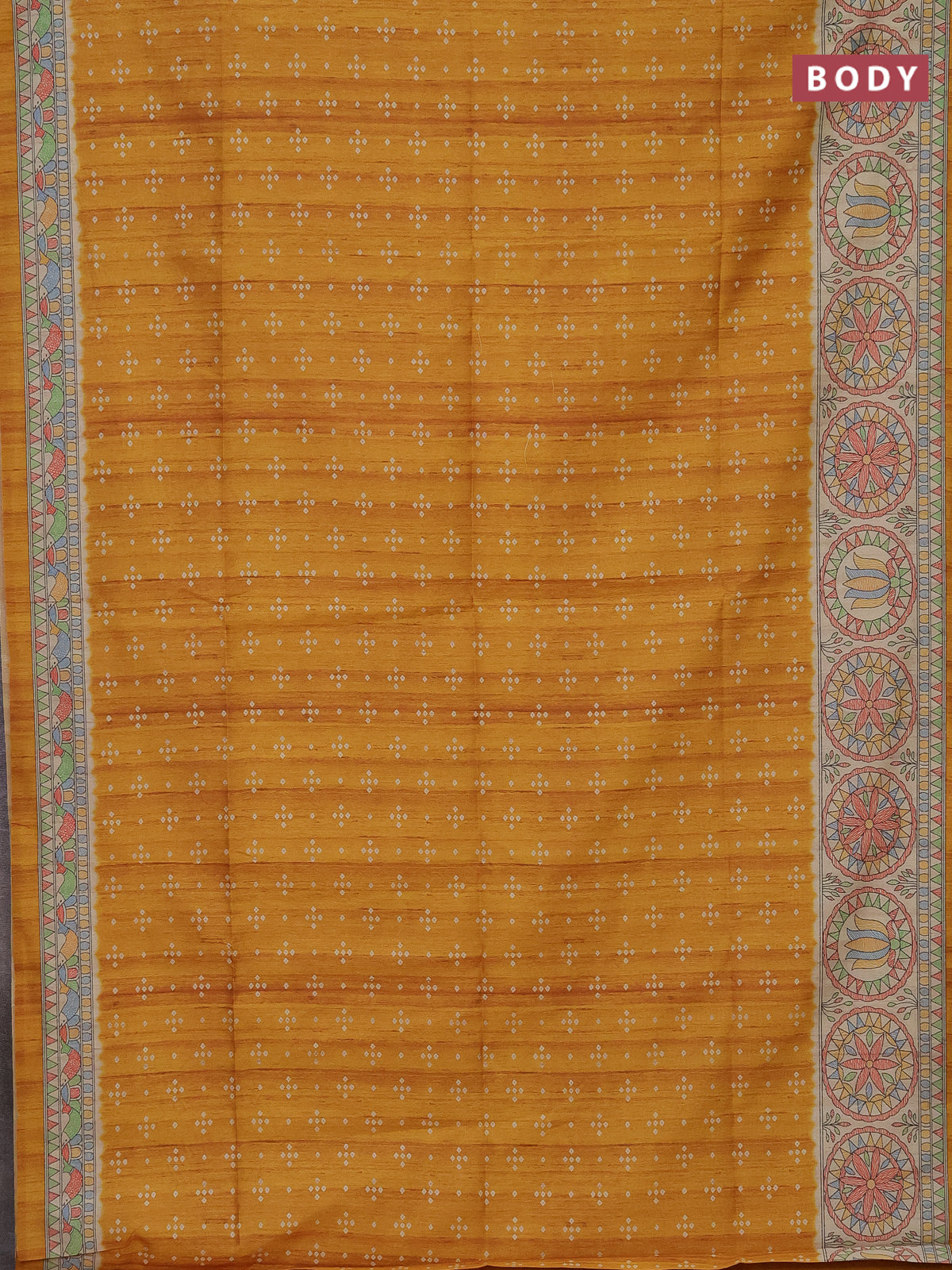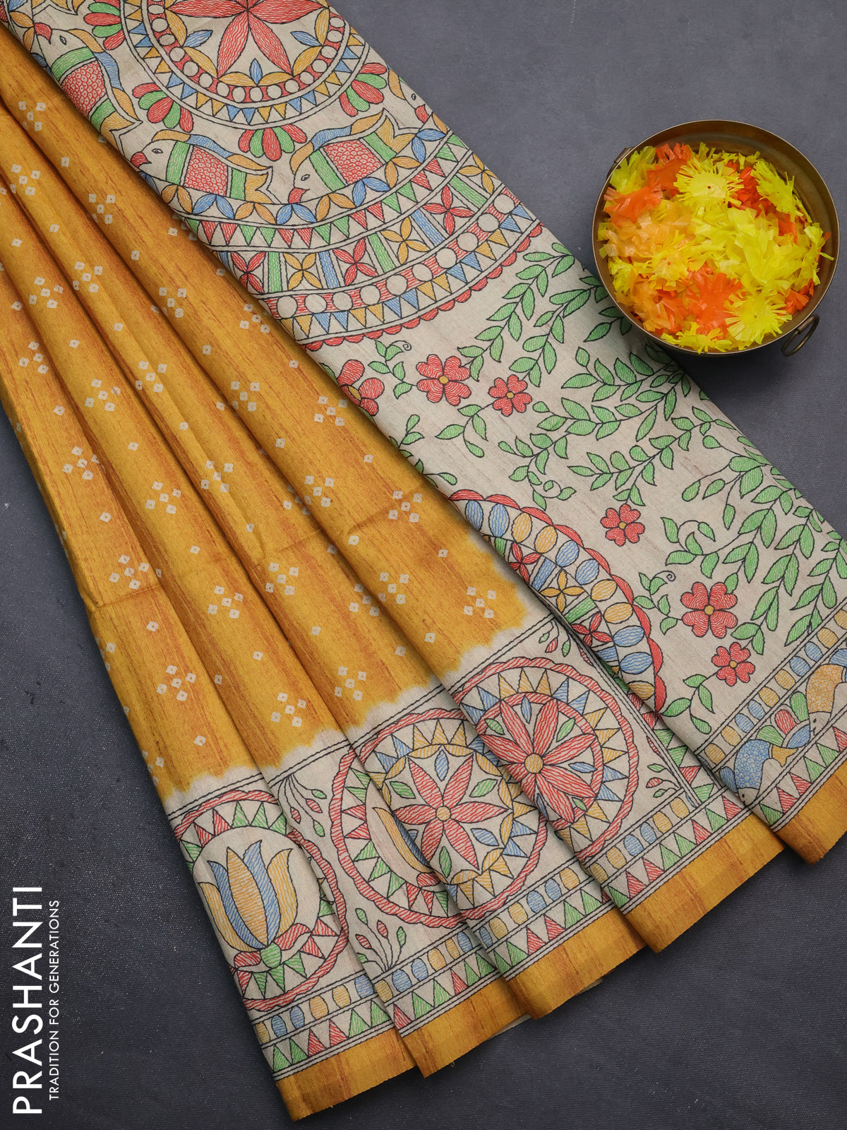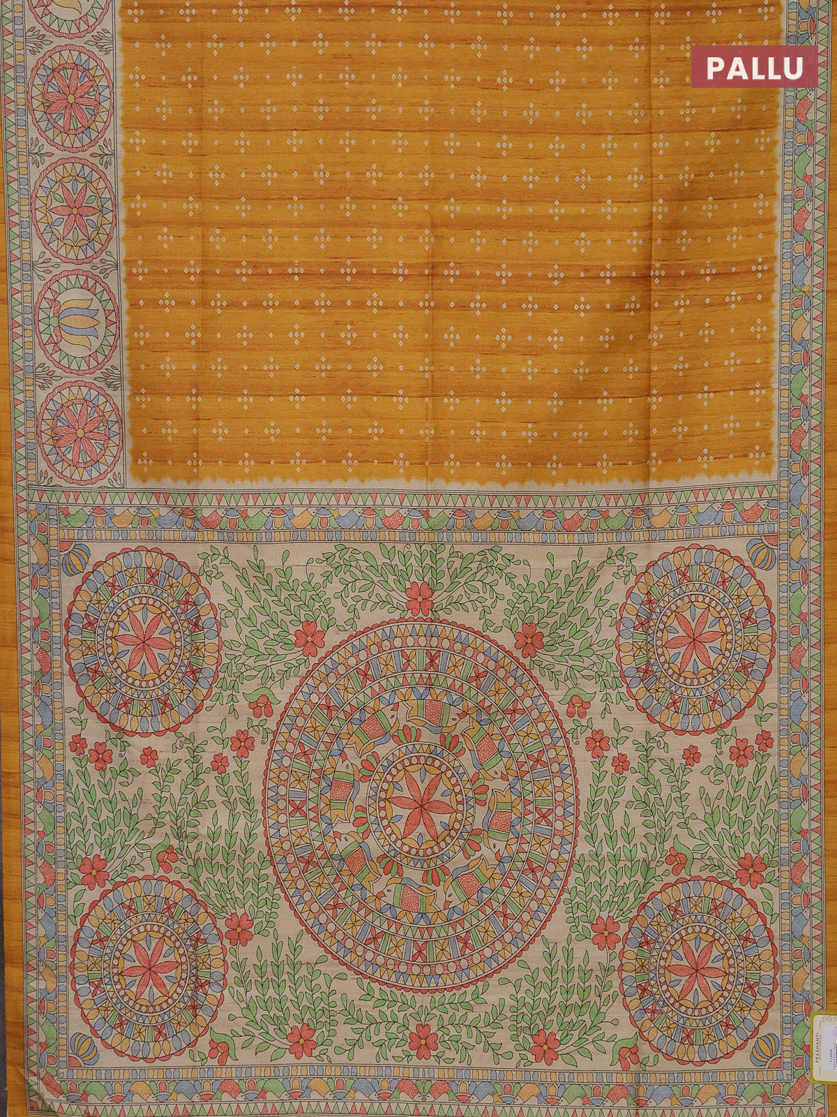 Semi tussar saree mustard yellow and beige with bandhini butta prints and mandhubani printed pallu