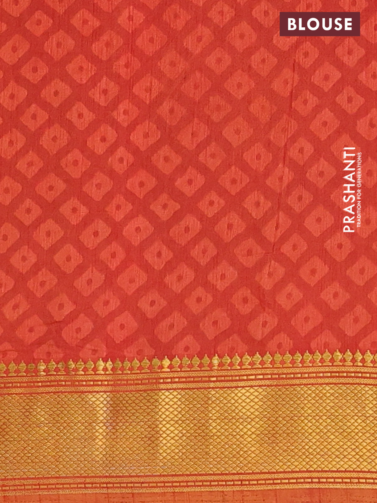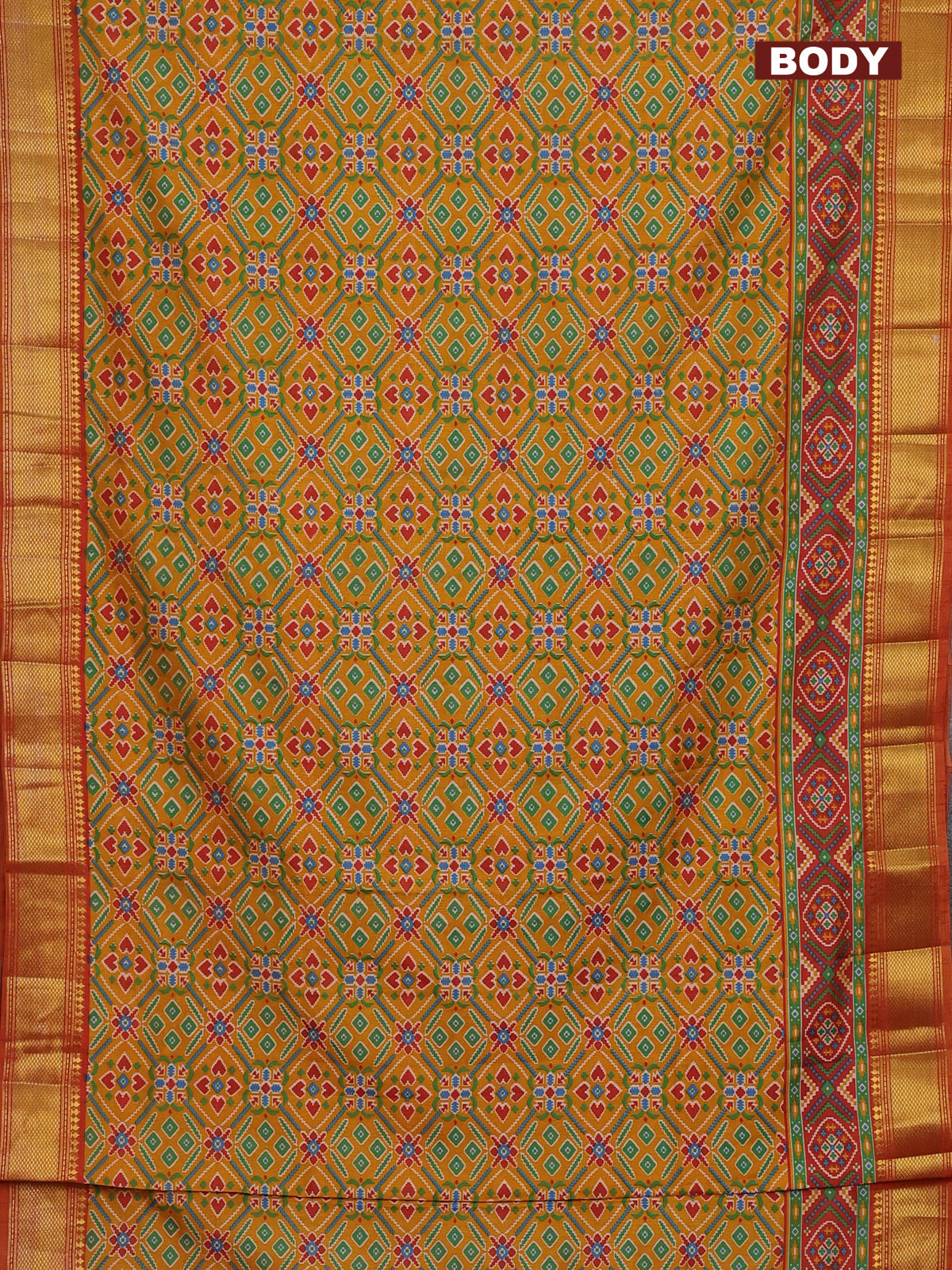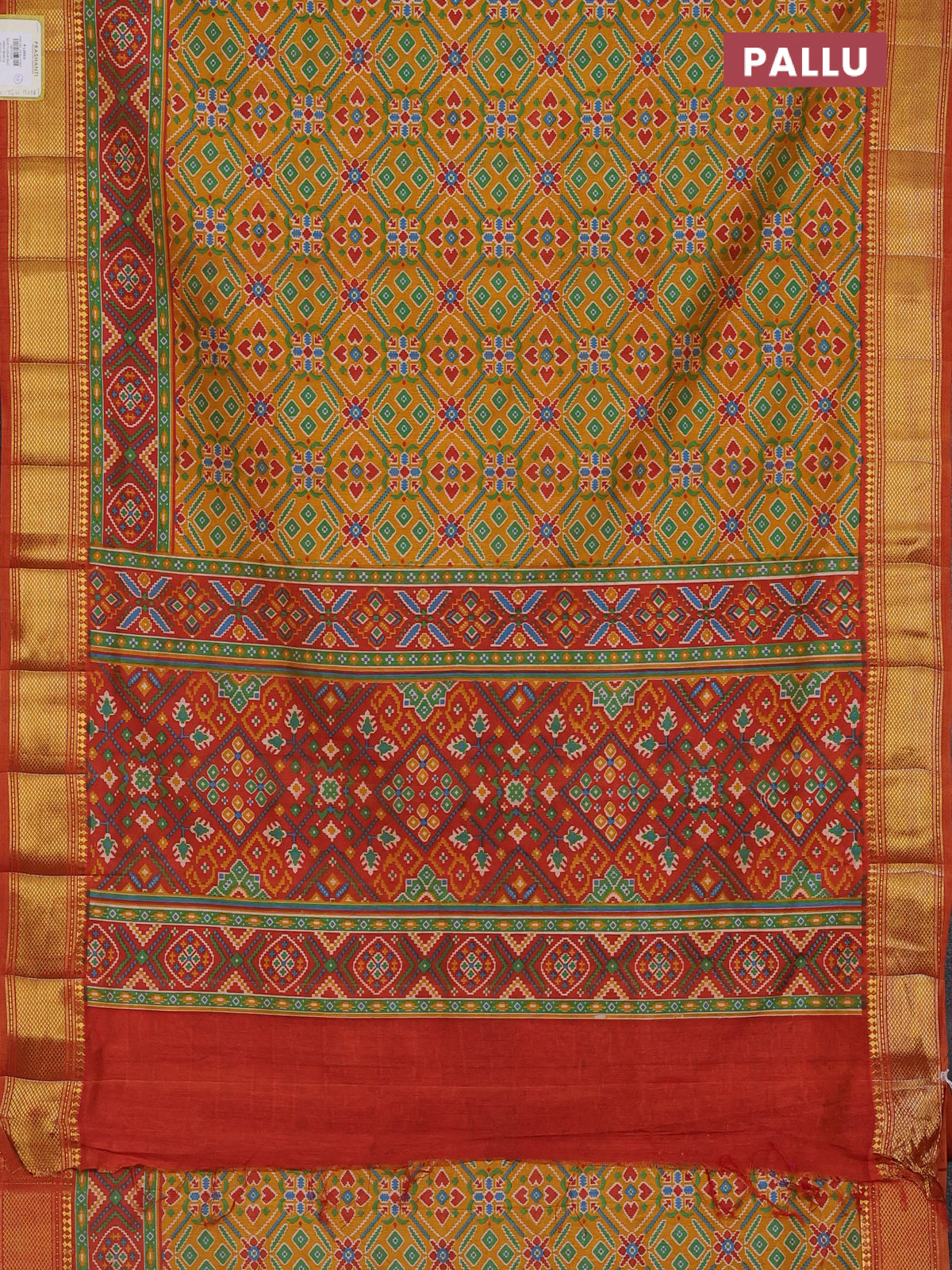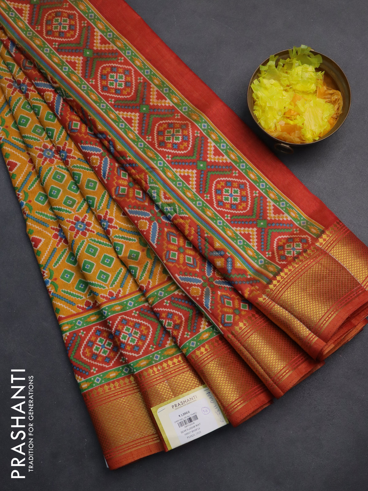Semi tussar saree mustard yellow and red with allover ikat prints and zari woven border