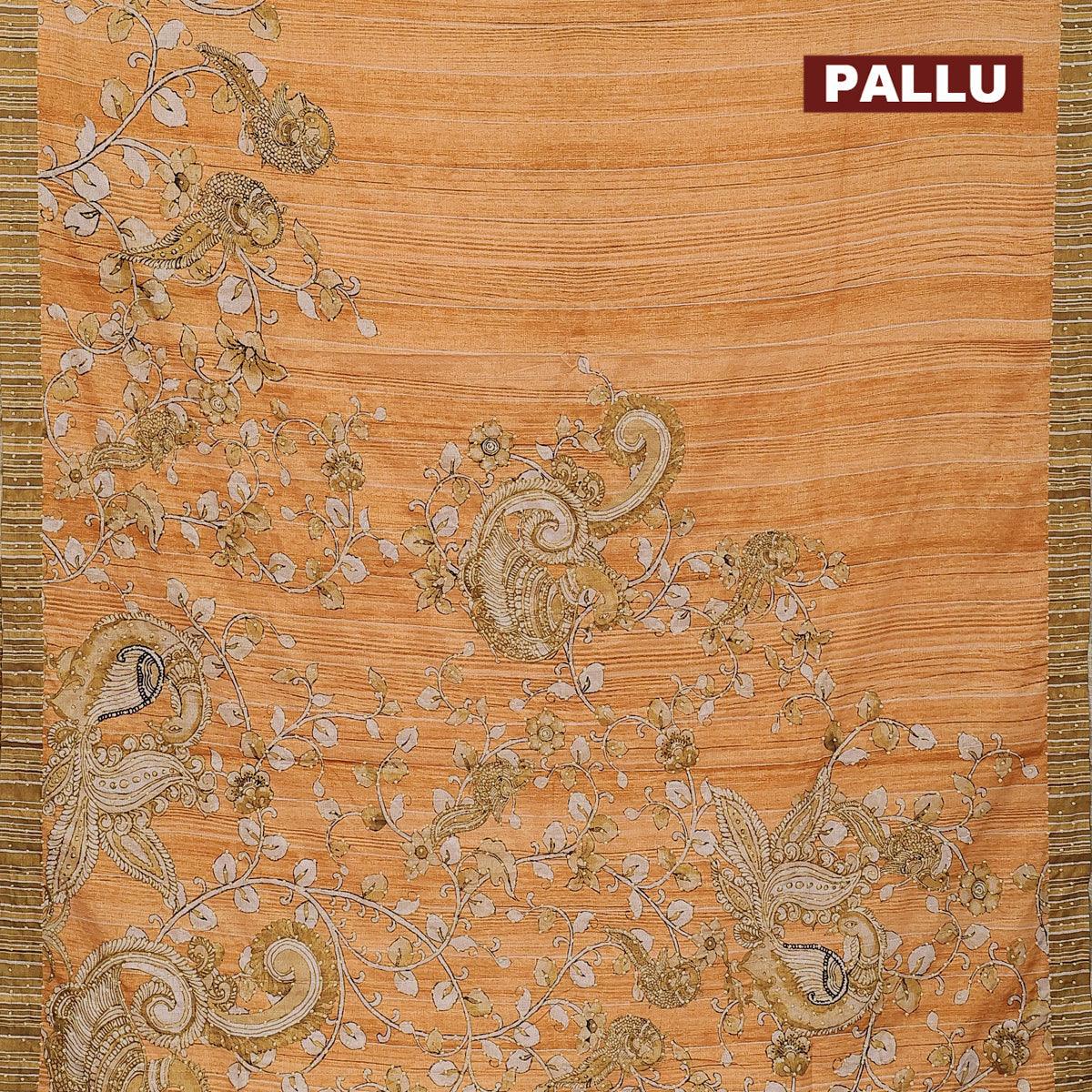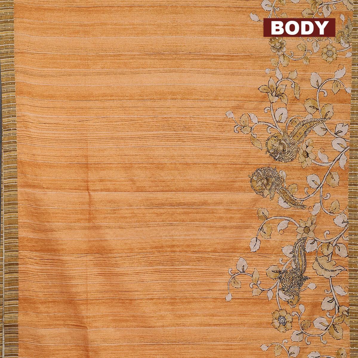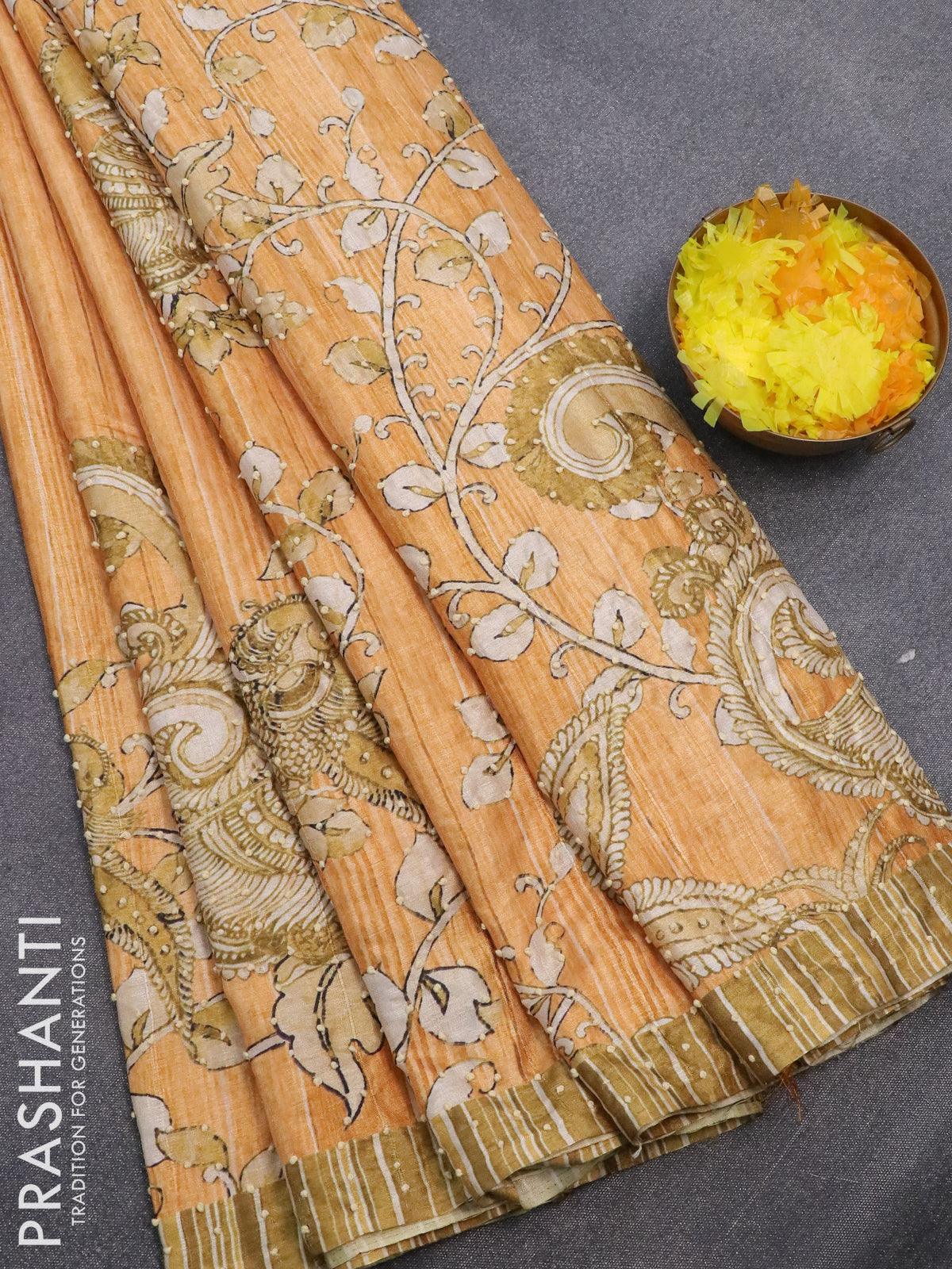 Semi tussar saree mustard yellow with kalamkari prints & french knot work and simple border