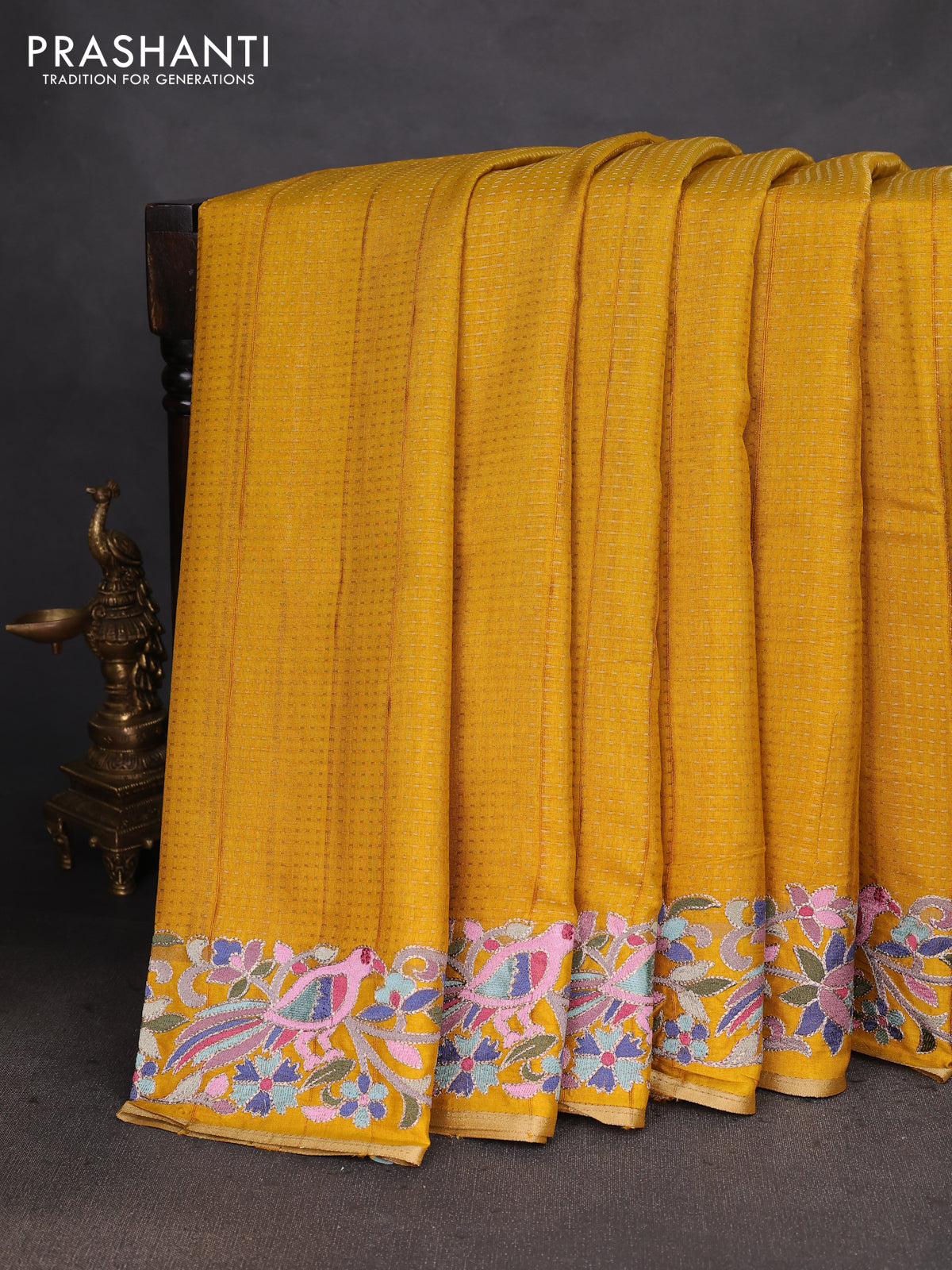 Semi tussar saree mustard yellow with zari weaves and embroidery border